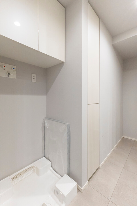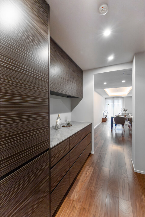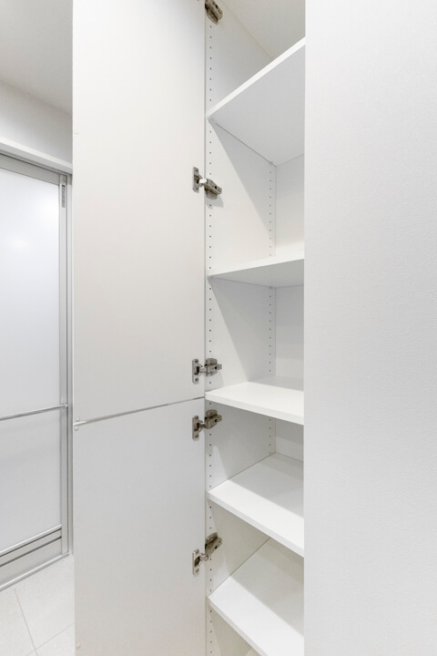 大容量のカップボードが備え付けなのも嬉しいポイント。キッチンと同じデザインで統一感があります。食料品のストックや食器類を整理整頓でき、いつも清潔なキッチンをキープできそうです。
