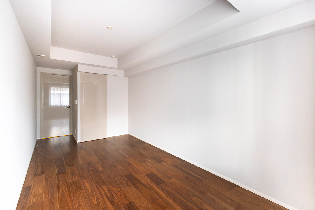 約10.0帖の寝室1。ゆとりある広さで主寝室にぴったりです。折り上げ天井&ビルトインエアコンで奥行きUP。LDK同様に床暖房が敷設されていて、寒い時期も快適に過ごすことができます。