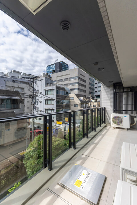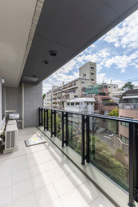 全居室に跨るワイドスパンバルコニー。約14㎡の広々としたスペースです。窓掃除の時に活躍するスロップシンク付きなのも嬉しいポイント。遠く広がる空や敷地の緑を望めます。