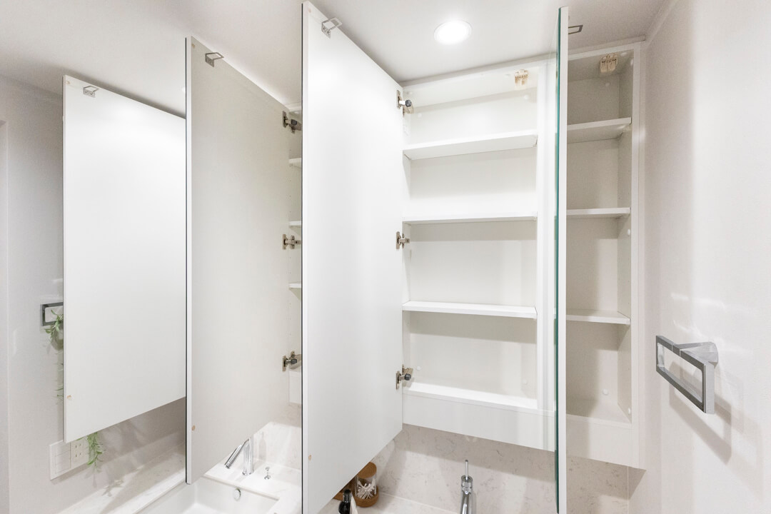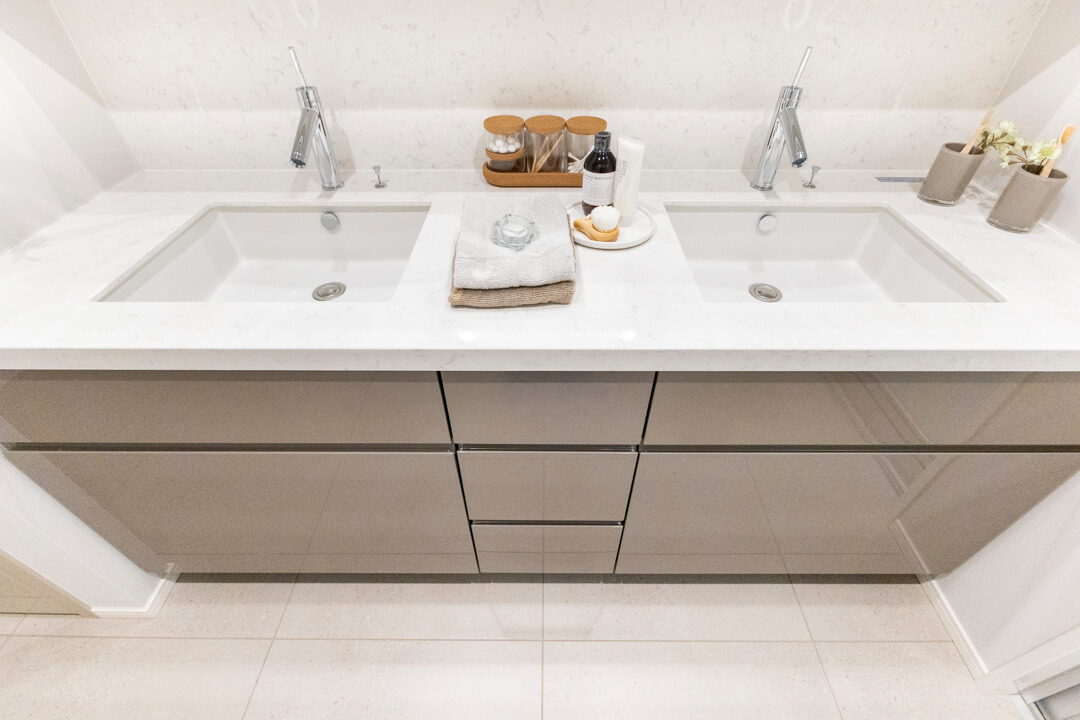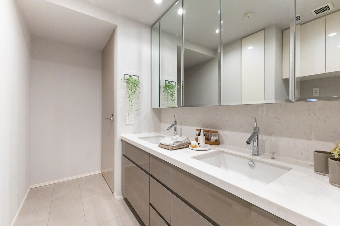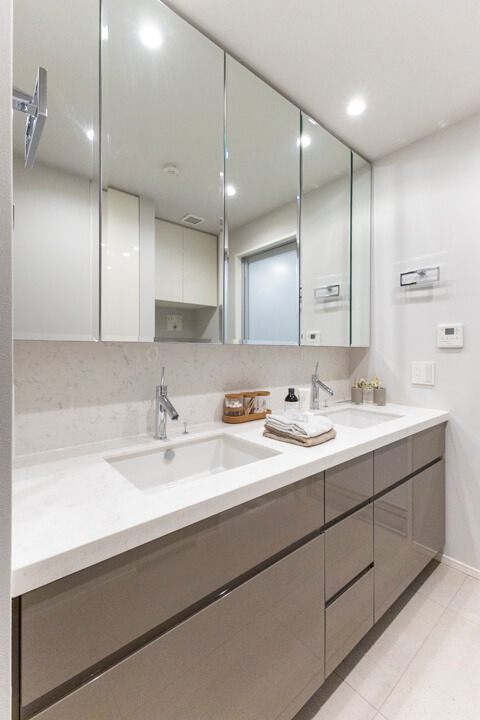 2つの洗面ボウルが並ぶ、ホテルライクな洗面化粧台。2人同時に使用でき、忙しい朝の身支度も安心です。大容量のミラーボックスに足元の引き出し、リネン庫完備で豊富な収納も魅力的です。洗面まわりの小物からタオルやパジャマまですっきり収納できそうですね。