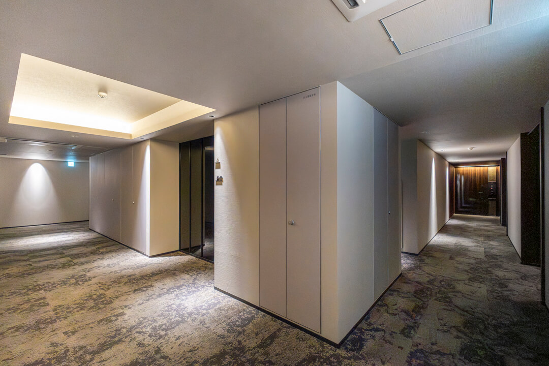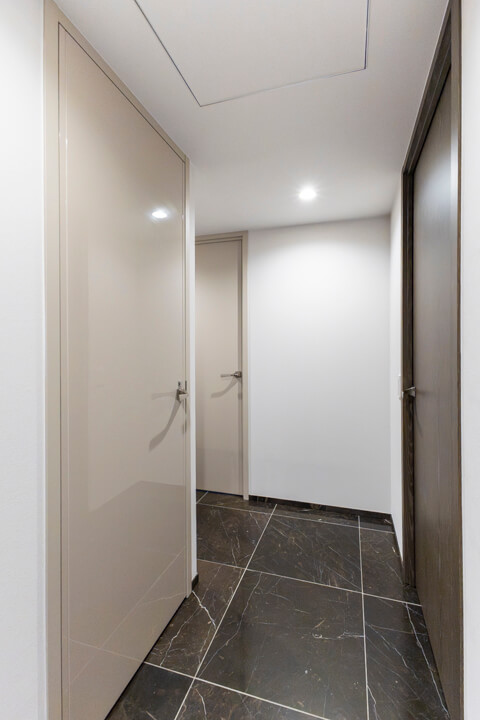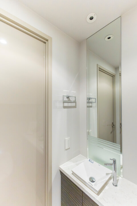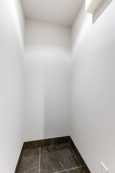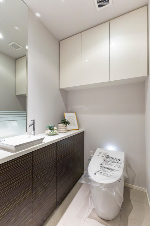 廊下に面していて独立性の高いレストルーム。TOTO製の洗浄機能付トイレを採用しています。タンクレス仕様でスタイリッシュ。自動開閉式なのでかがむ必要がなく、腰への負担を減らすことができます。ホテルライクな手洗いカウンター付きで、ゲストを洗面室まで案内する手間もかかりません。