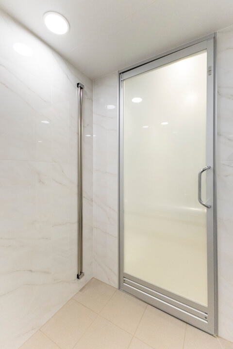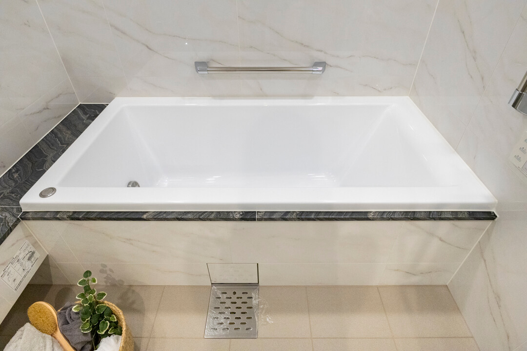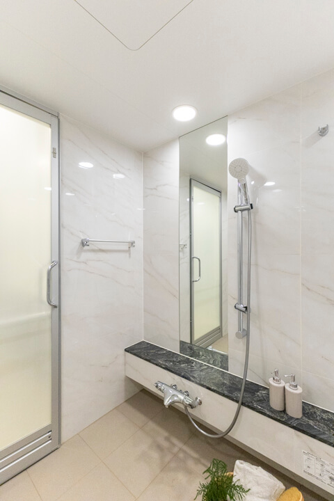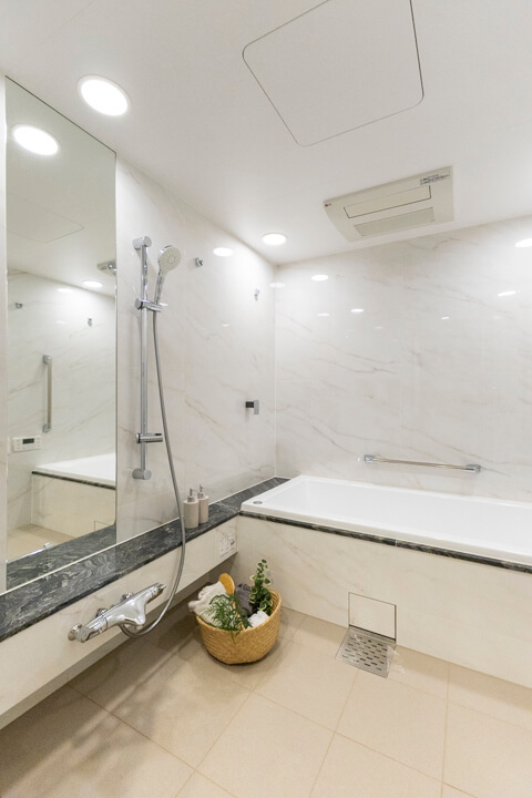 ゆったり入浴できる1822サイズのバスルーム。大理石調デザインで高級感が漂います。換気乾燥暖房機・追い焚き機能に加え、ミストサウナも搭載。汗をかいてリフレッシュしたり、ゆっくりボディケアをしたり、快適なバスタイムを過ごせそうです。ランドリーパイプをドアの横にすっきり収納できるのも嬉しいポイントです。