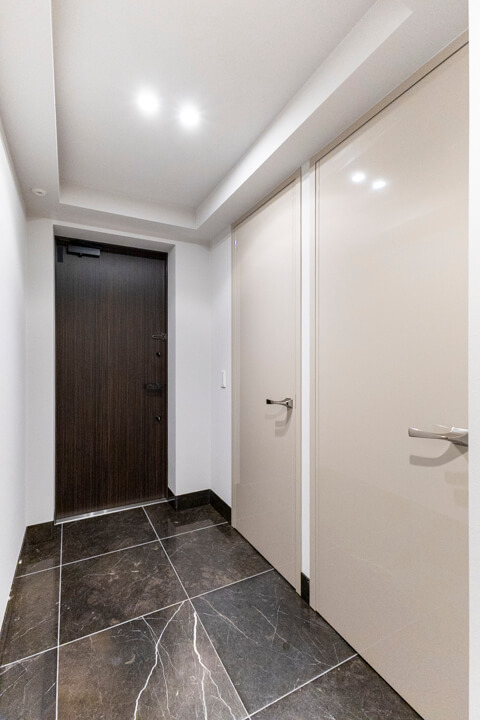 石目フロアで高級感の漂う玄関スペース。入って左手にSIC(シューズインクローゼット)と納戸が並び、収納性に優れています。納戸には季節家電や掃除機といった大きな荷物も収納でき、すっきりとした居住空間を実現できそうです。