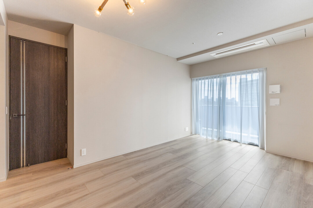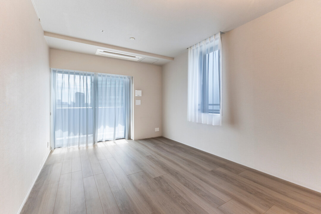 約15帖のLDK。南東向きの窓からあたたかい太陽光がたっぷり降り注ぎます。南西側にも窓があり、風通しの良さも魅力的ですよ。スタイリッシュなビルトインエアコンを採用していて、すっきりとした印象に。ピクチャーレールを活用してポスターやエアプランツを飾り、自分好みのお部屋づくりを楽しんでください。