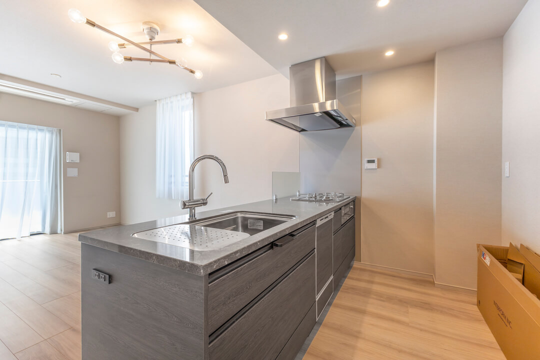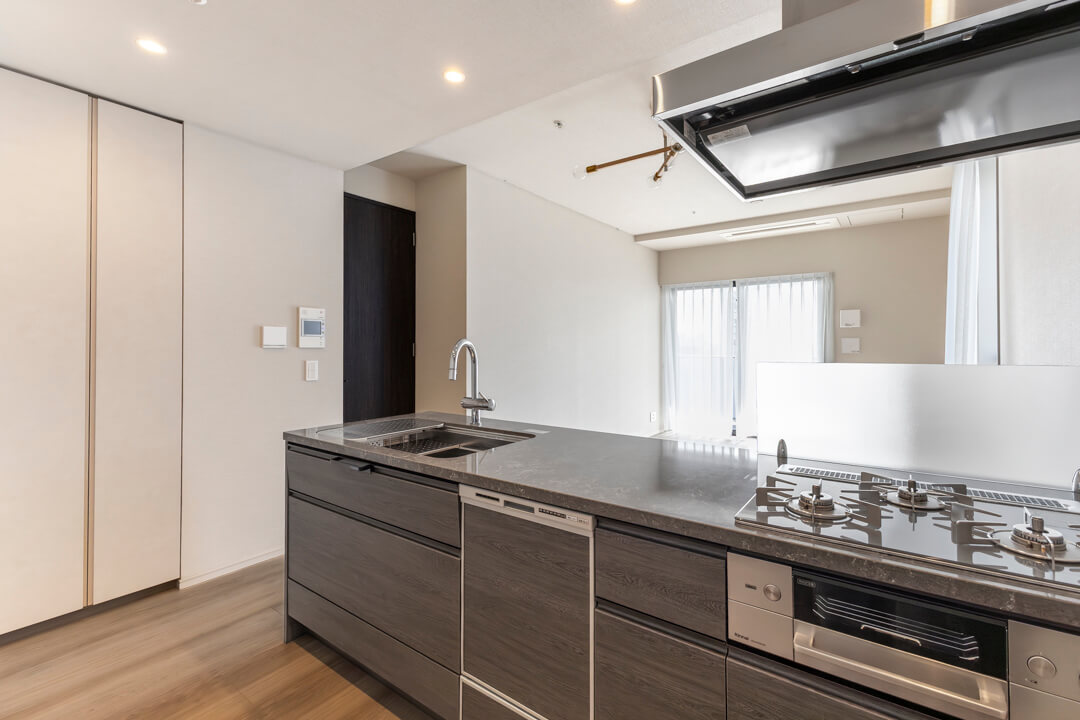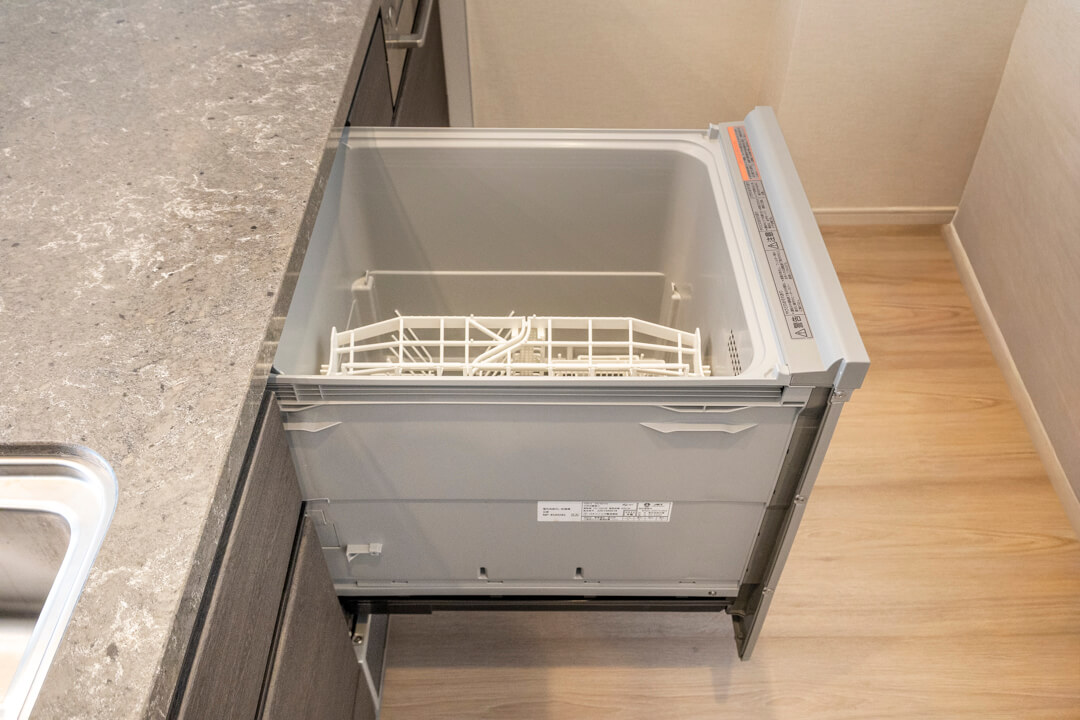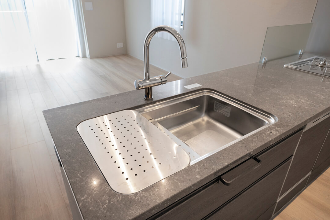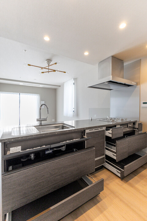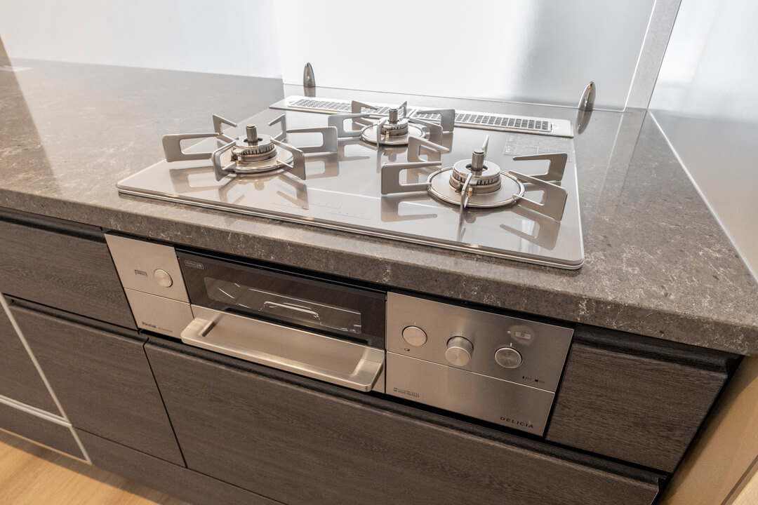 効率良く調理ができるグリル付3口ガスコンロや、後片付けの捗る食洗機を内蔵。さらに、シンクにはディスポーザーが付いています。料理後すぐに生ゴミを処理できるので、掃除の手間が軽減され、悪臭の原因を防いでくれます。