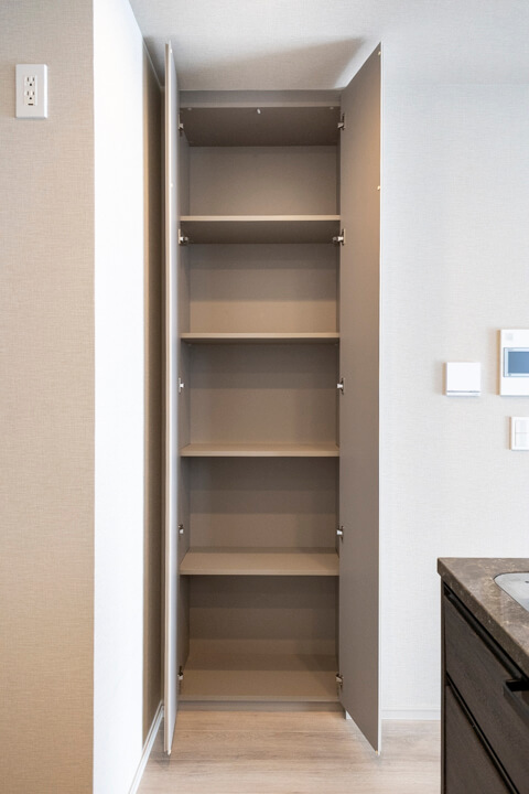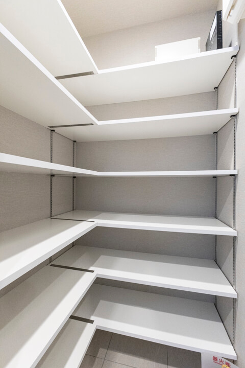キッチン本体の収納に加え、左手には可動棚を完備。食料品のストックや食器類を整理整頓でき、ごちゃごちゃしがちなキッチンまわりがすっきり片付きそうです。