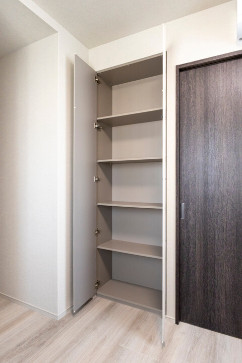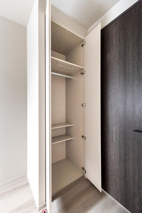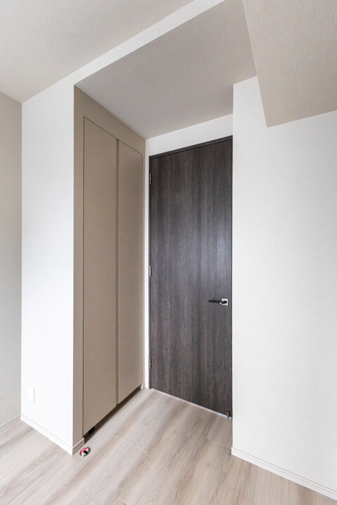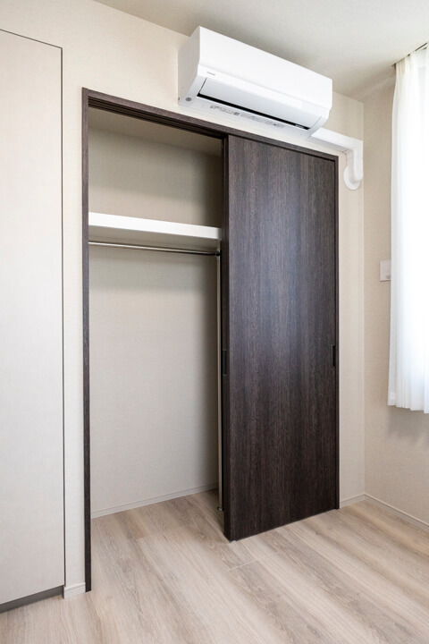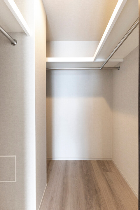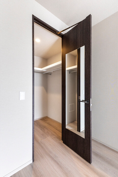 WIC(ウォークインクローゼット)完備で収納力◎。衣類はもちろん、トランクケースやゴルフバッグといった大きな荷物も収納でき、居室空間を広々と使うことができます。扉の裏が鏡張りになっていて、コーディネートチェックができるのも嬉しいポイントです。