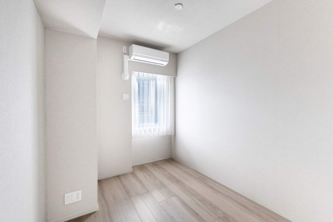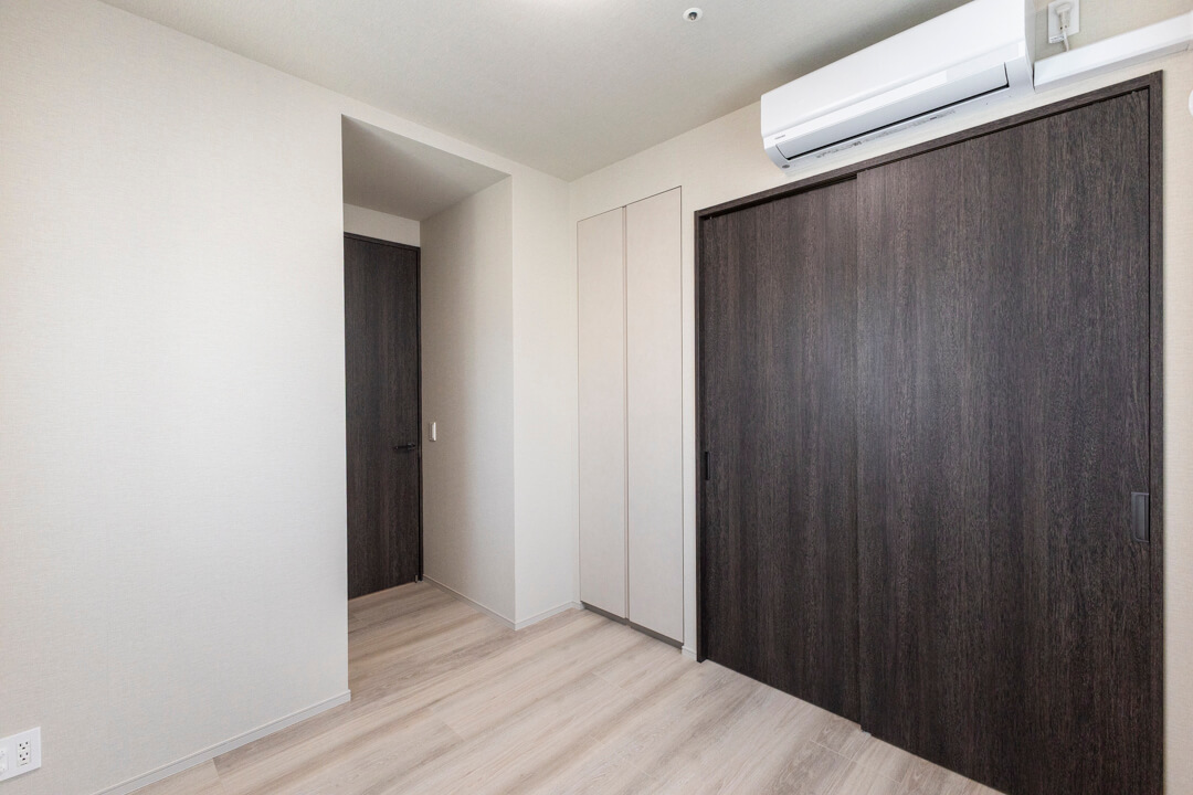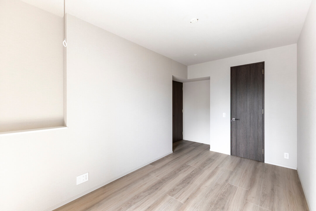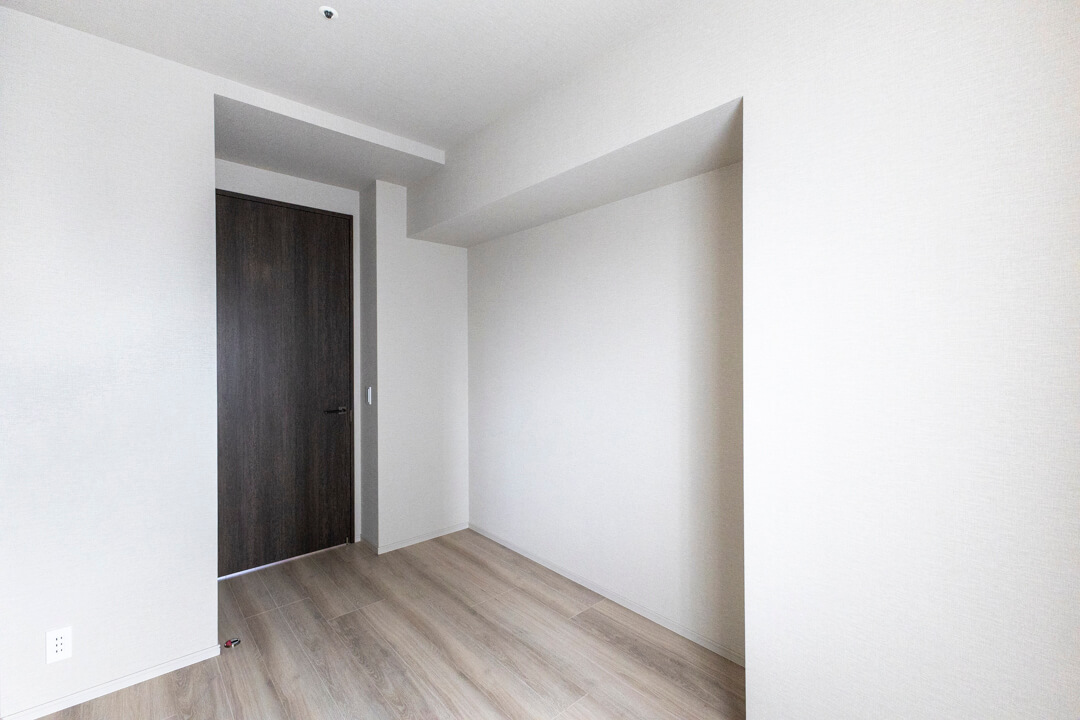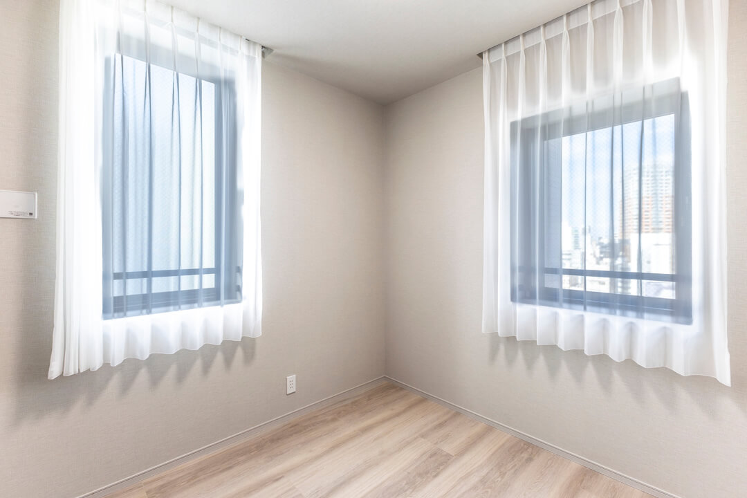 約5.7帖の寝室3。リビングから一番離れた場所にあり、プライベート性の高い空間です。作業に集中できそうなので、ワークスペースや趣味部屋におすすめです。明るく風通しの良い2面採光で、収納豊富なのも嬉しいポイントです。