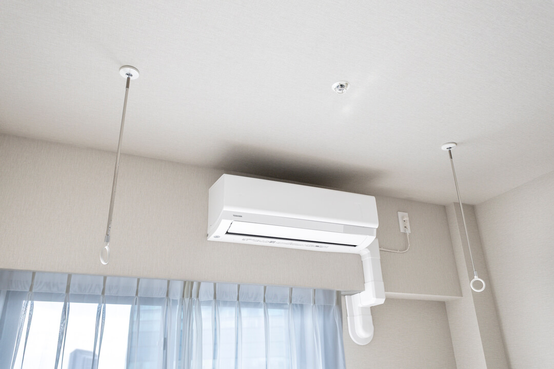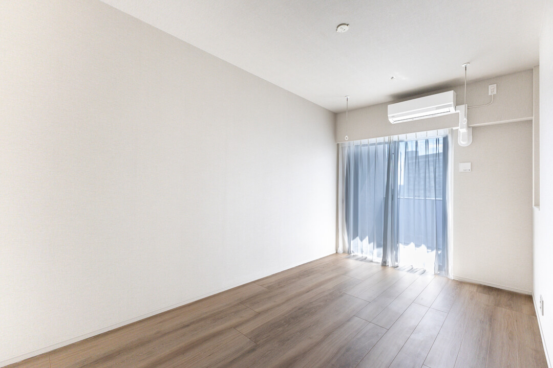 約8.1帖の寝室1。洋室で最も広く、主寝室におすすめです。南東向きの窓からあたたかい自然光が入り、爽やかな朝を迎えられそうですね。窓際には室内用物干しが付いていて、忙しくて日中に洗濯できない時や、雨の多い時期に便利。使用しないときには取り外すことができるので、見た目もすっきりします。