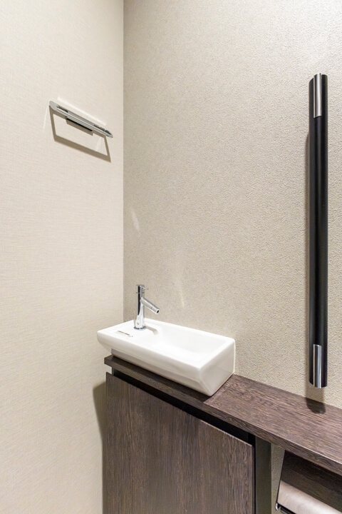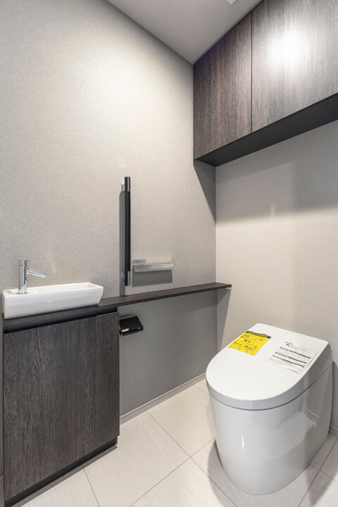廊下に面していて独立性の高いレストルーム。TOTO製の洗浄機能付トイレに交換済みです。タンクレス仕様ですっきりとした印象ですね。手洗いカウンター付きなので、すぐに手を洗うことができて衛生的。ゲストを洗面室まで案内する手間もかかりません。トイレットペーパーや掃除用品は吊戸棚に収納してください。