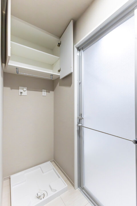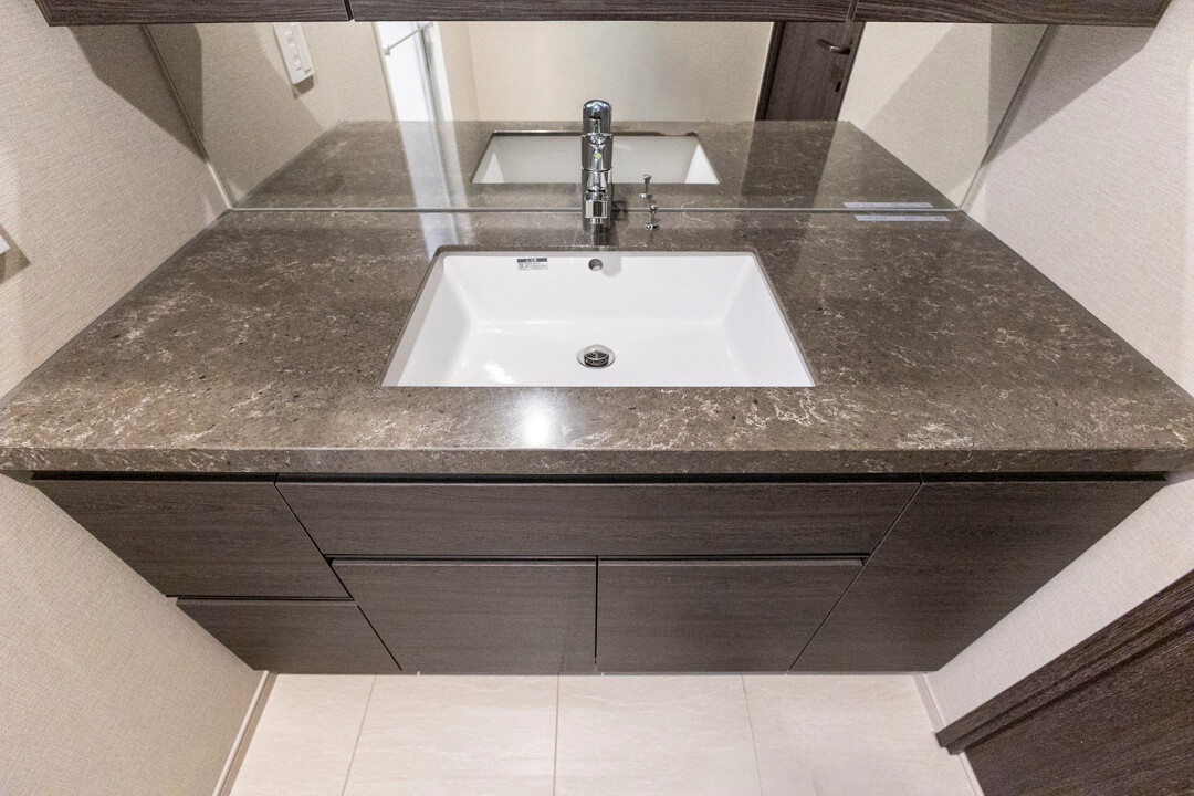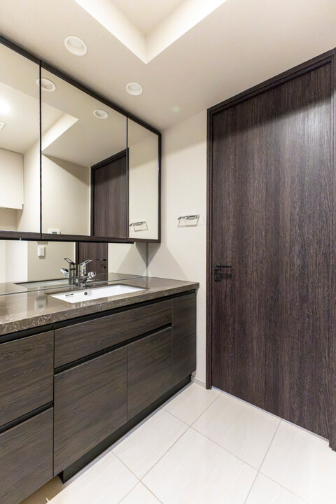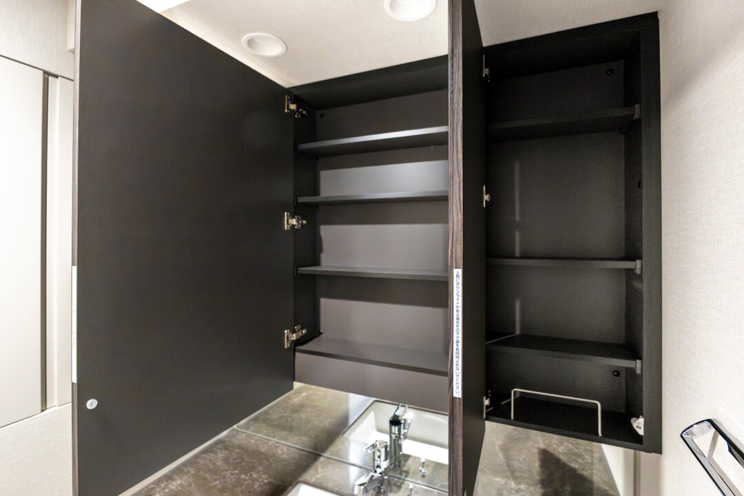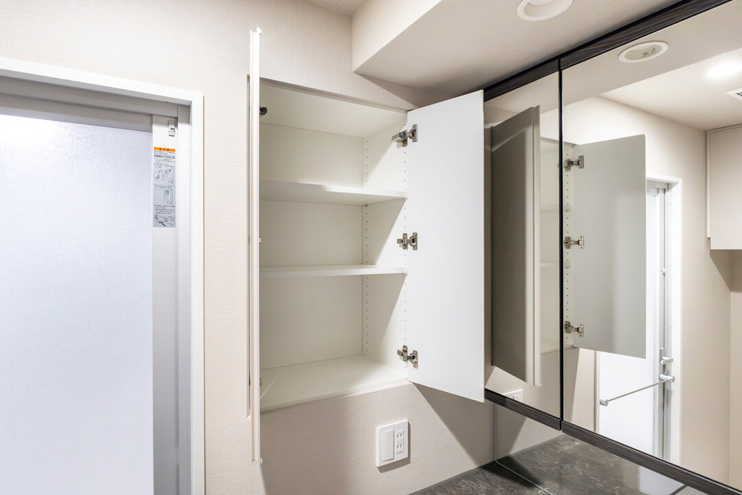 ホテルライクなデザインが印象的な洗面化粧台。大きな三面鏡とミドルミラー付きで身だしなみを整えるのに便利です。カウンタースペースにはゆとりがあり、化粧品やドライヤーの仮置きが可能。忙しい朝の身支度がスムーズに行えそうです。洗面まわりの小物はミラーボックスや左手の可動棚にすっきり収納可能◎。いつも清潔な空間をキープできそうですね。
