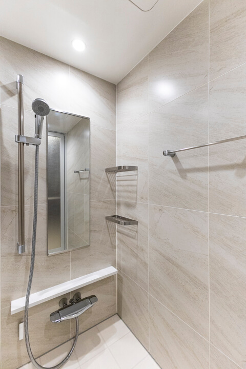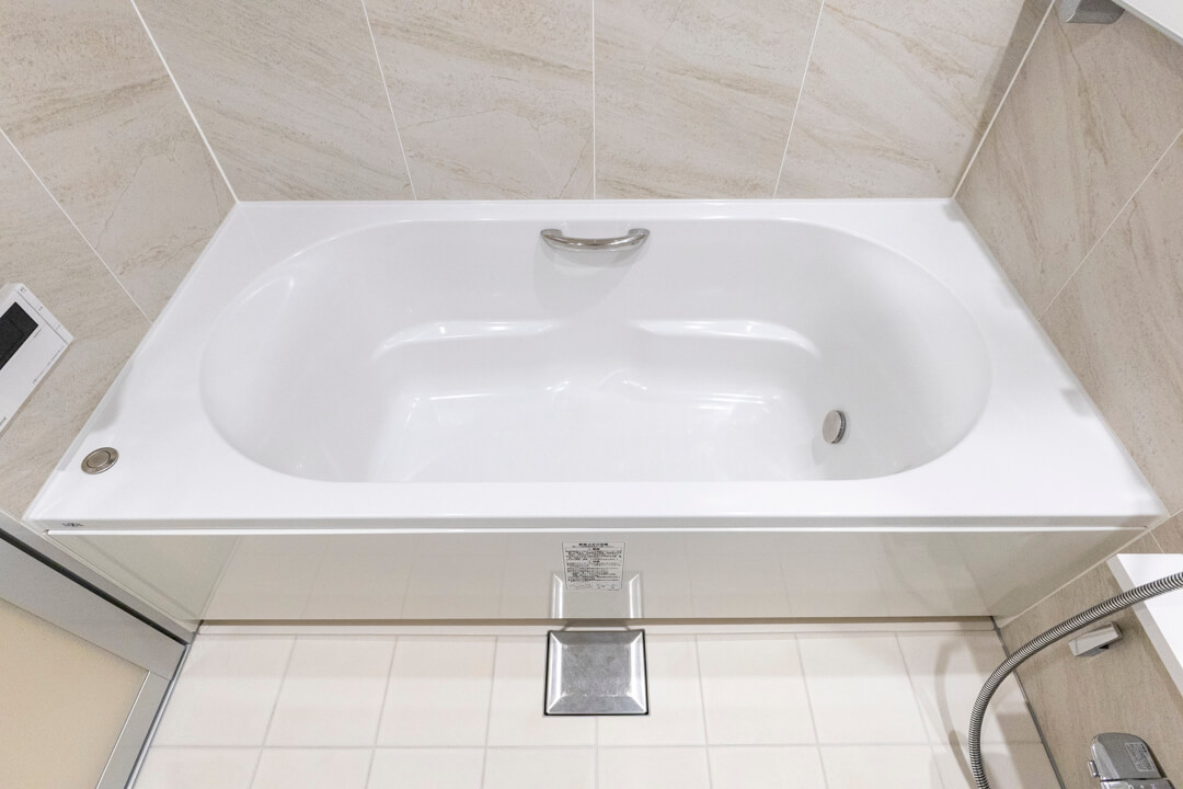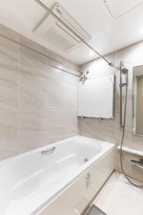 石目デザインで高級感の漂うバスルーム。換気・暖房・乾燥・涼風機能付きで1年中快適なバスタイムを過ごせます。追い焚き機能も付いているので、家族の入浴時間がずれてしまった時、半身浴をしたい時に便利。丸みを帯びた浴槽が疲れた身体を包み込んでくれそうです。