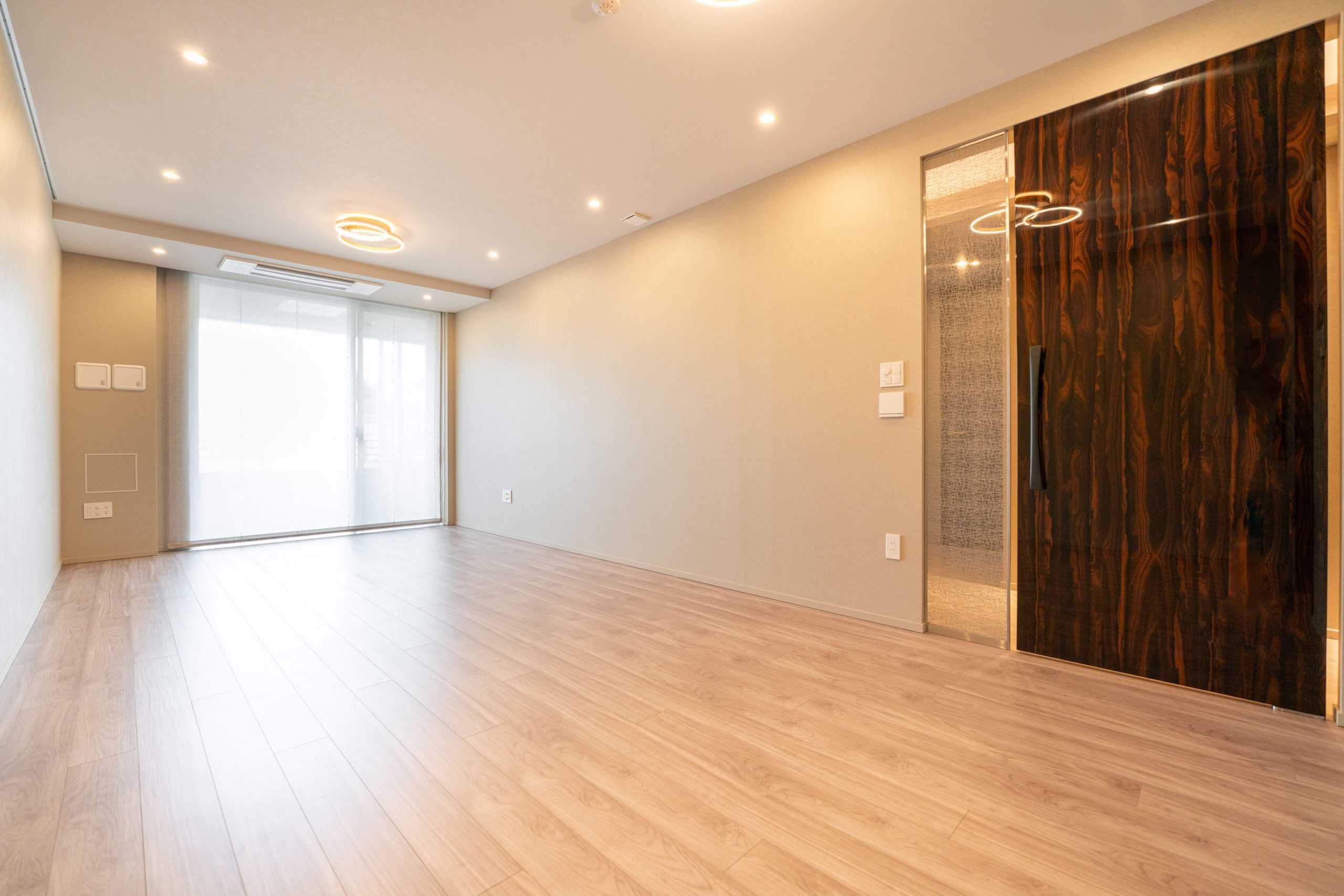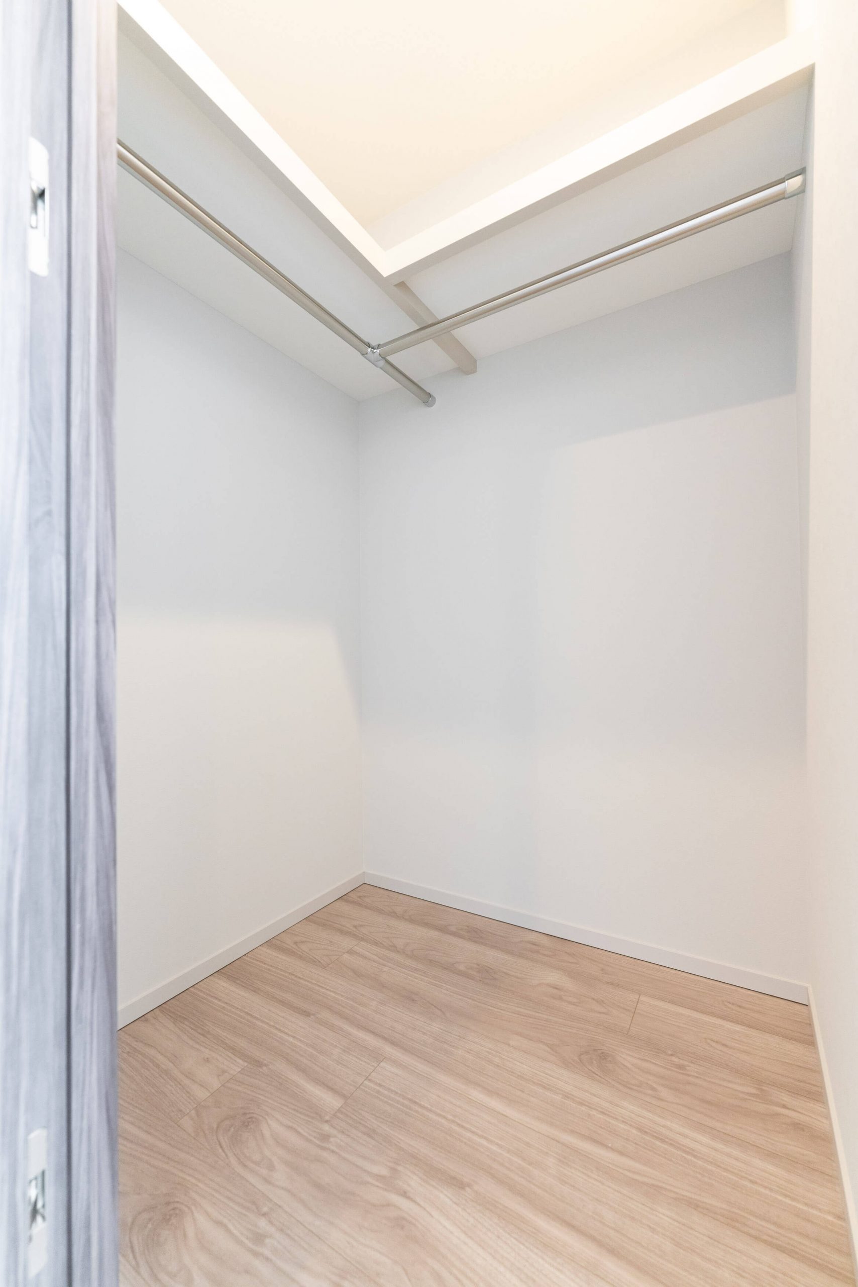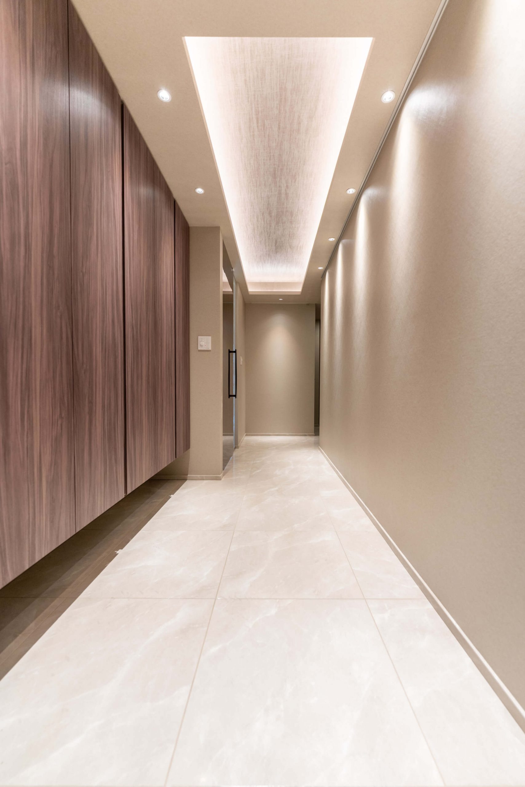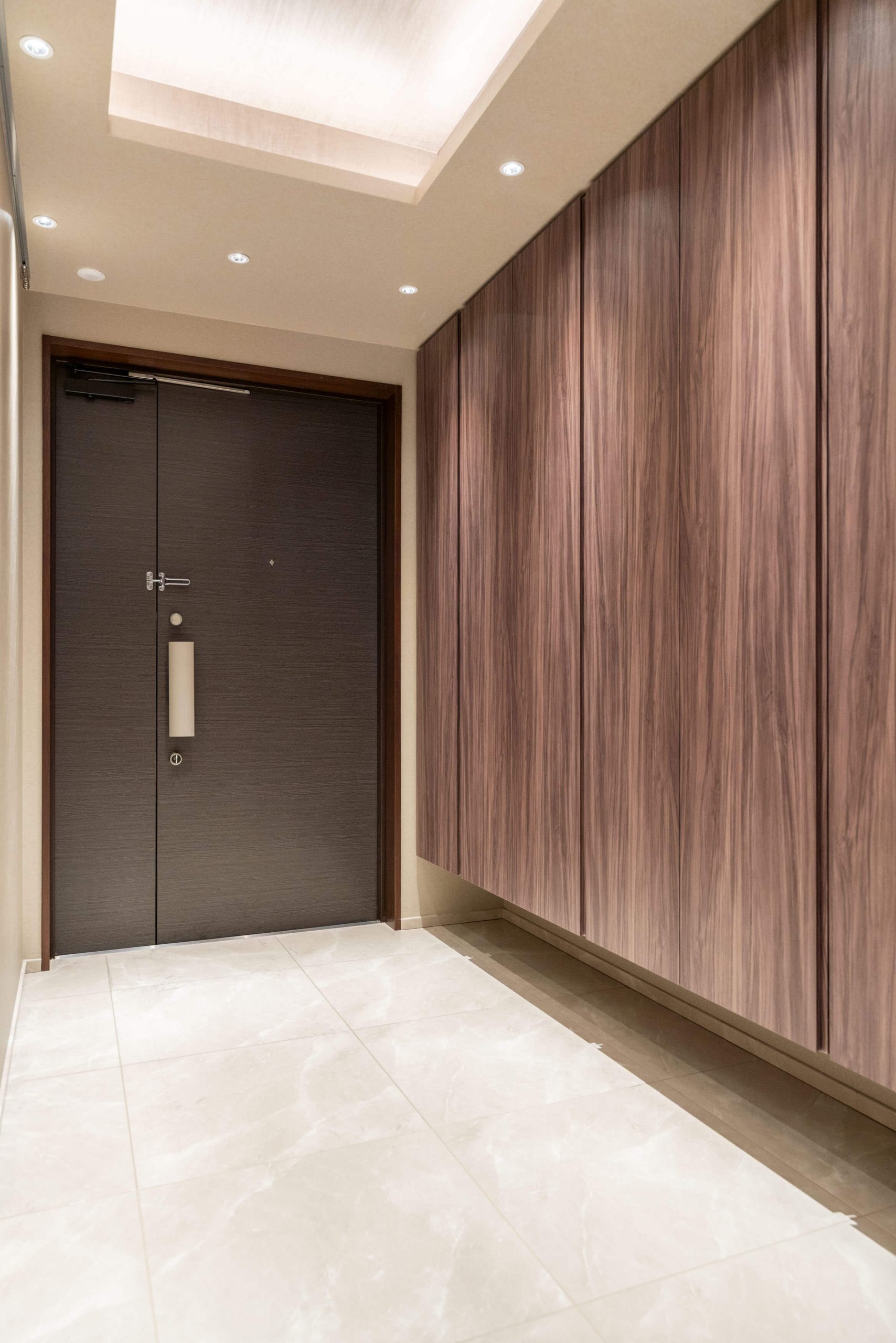 玄関には天井まで高さのあるシューズボックスを完備。靴がたっぷりと収納できます。ホテルライクな折り上げ天井部分には間接照明が施されており、空間をやさしい光で照らしてくれます。廊下には納戸も備わっています。