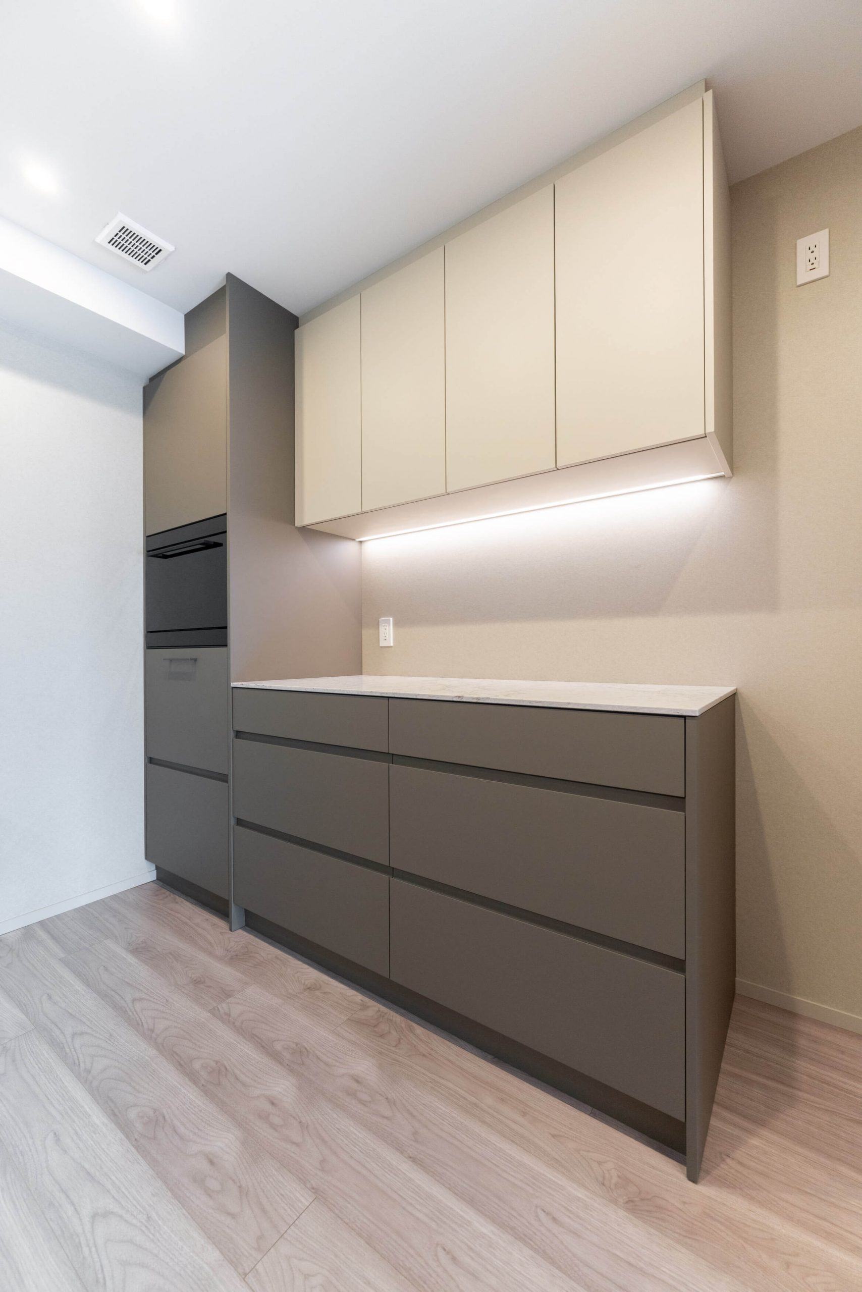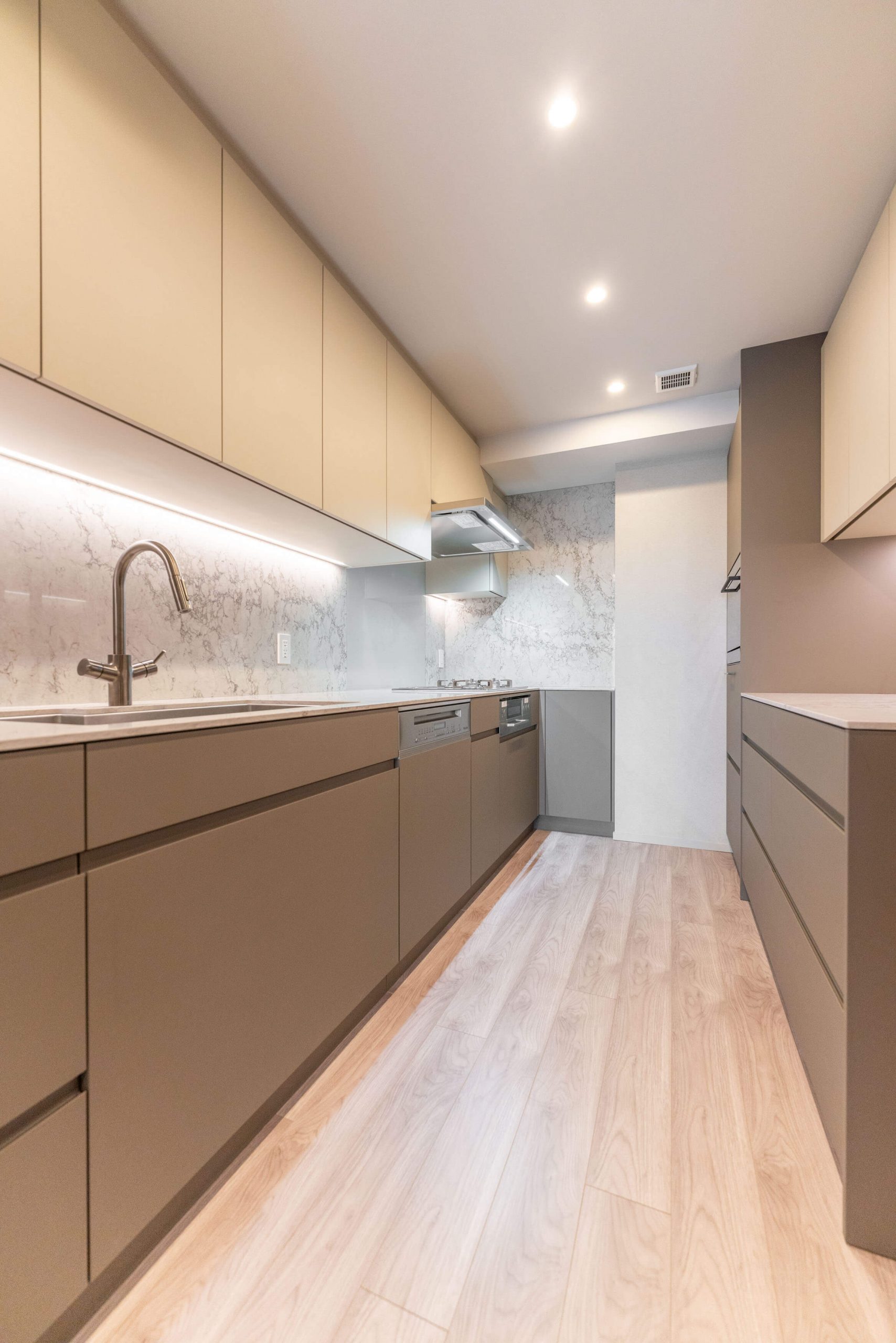 約5.4帖のキッチンスペース。リビングダイニングと空間分けされており、キッチンまわりの生活感をさりげなく目隠しできます。料理が捗る3口ガスコンロ、家事の時短に心強い食洗機、生ごみの処理に便利なディスポーザー付きで設備も充実。カップボードも設置されており、収納スペースもしっかりと確保されています。また、カップボードにはビルトインオーブンレンジも備わっています。