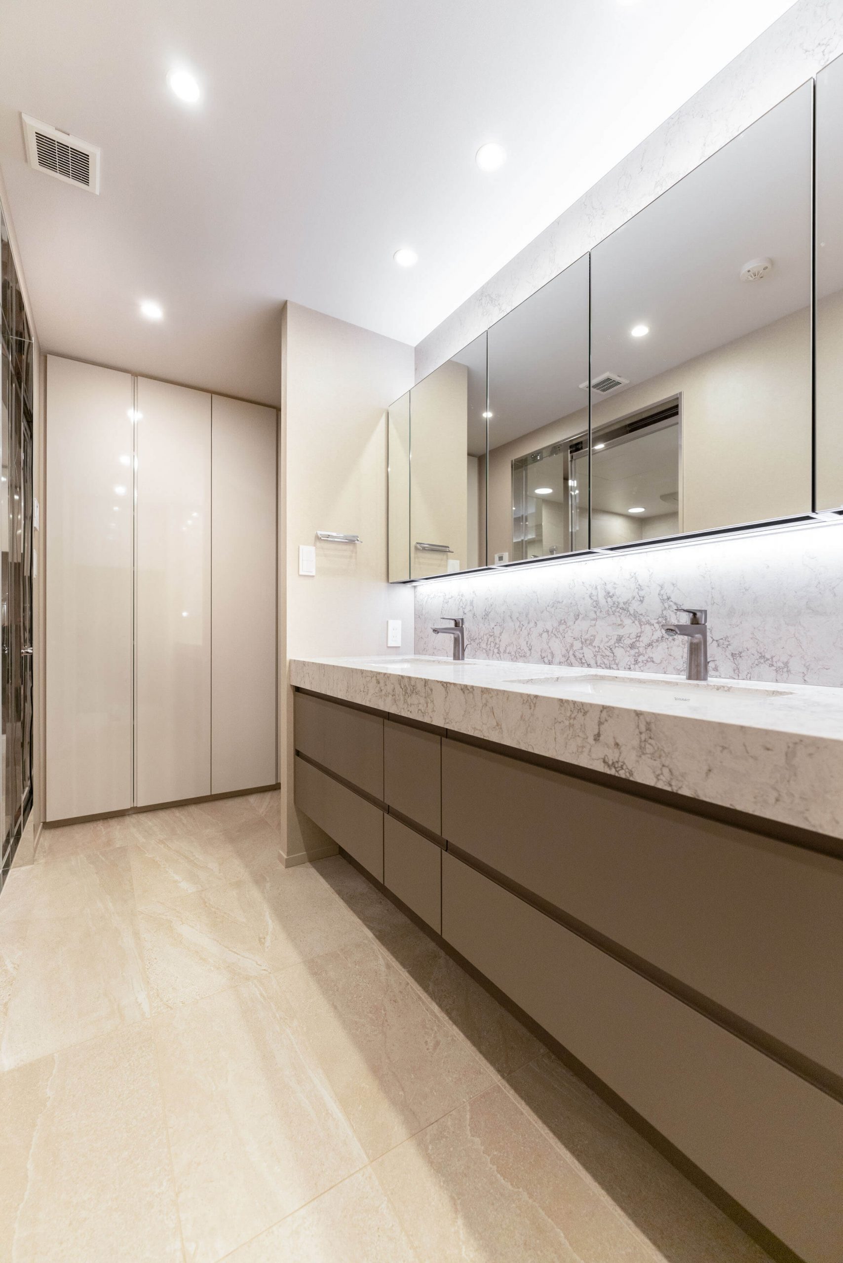 ホテルライクな2ボウルの洗面化粧台。家族で使用時間が重なってもそれぞれゆっくり使えます。間接照明が美しく演出性も◎。洗面まわりの小物がすっきり整頓できるミラーボックスや、モノの出し入れがしやすい引き出し式のキャビネットで使い勝手の良さもポイントです。また、リネン庫も完備されています。