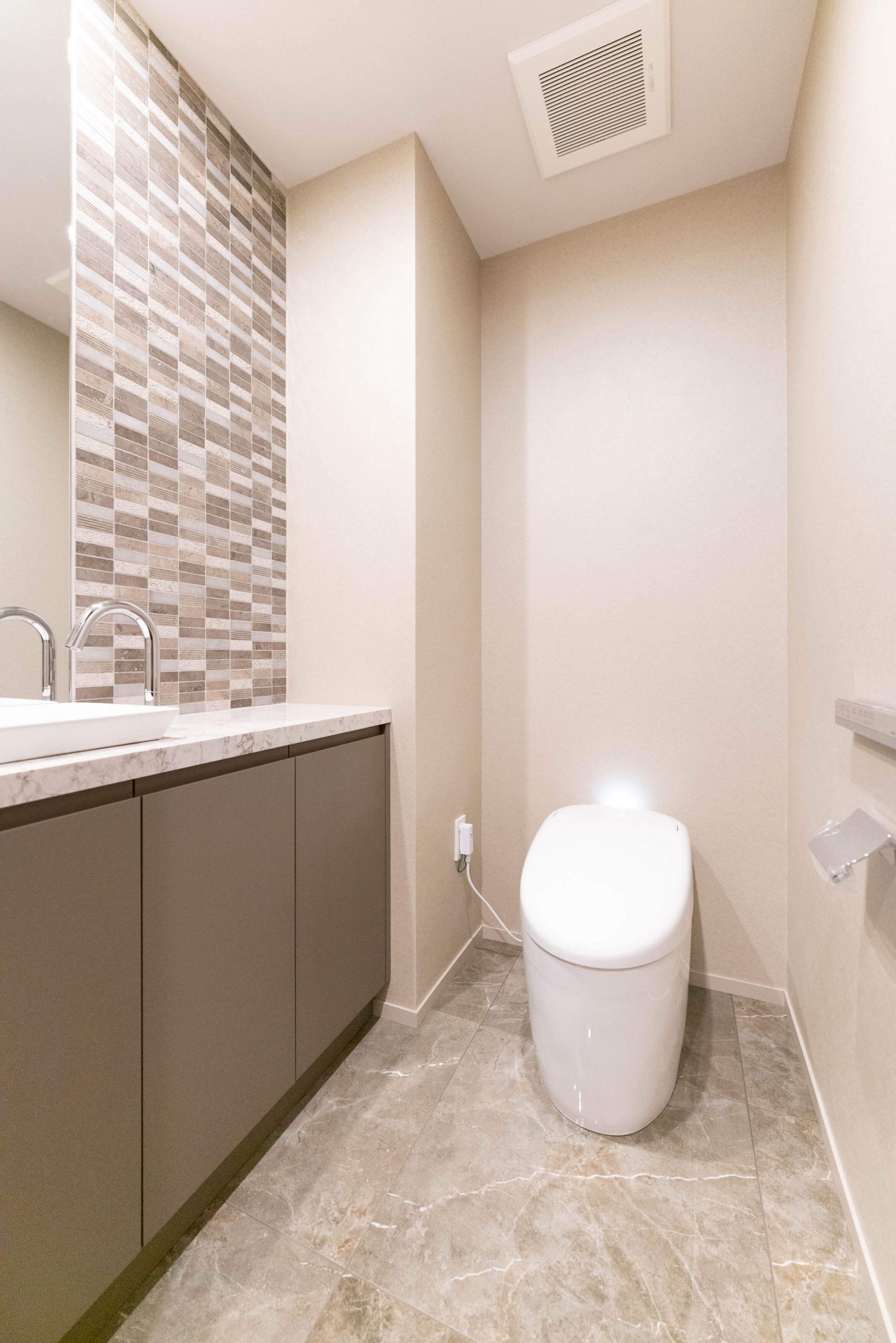 廊下に面したレストルーム。空間がすっきり見えるタンクレストイレです。独立型の手洗い器、収納スペースも完備。ウォシュレットリモコンがスティック型でスタイリッシュな雰囲気です。