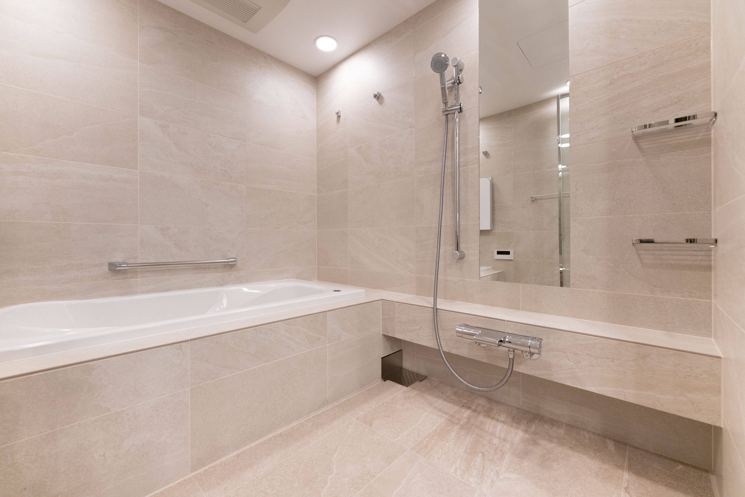 1822サイズのゆとりある広さでのバスルーム。タイル貼りで重厚感と上質な雰囲気が感じられます。追い炊き機能の他、浴室換気乾燥機も備わっています。