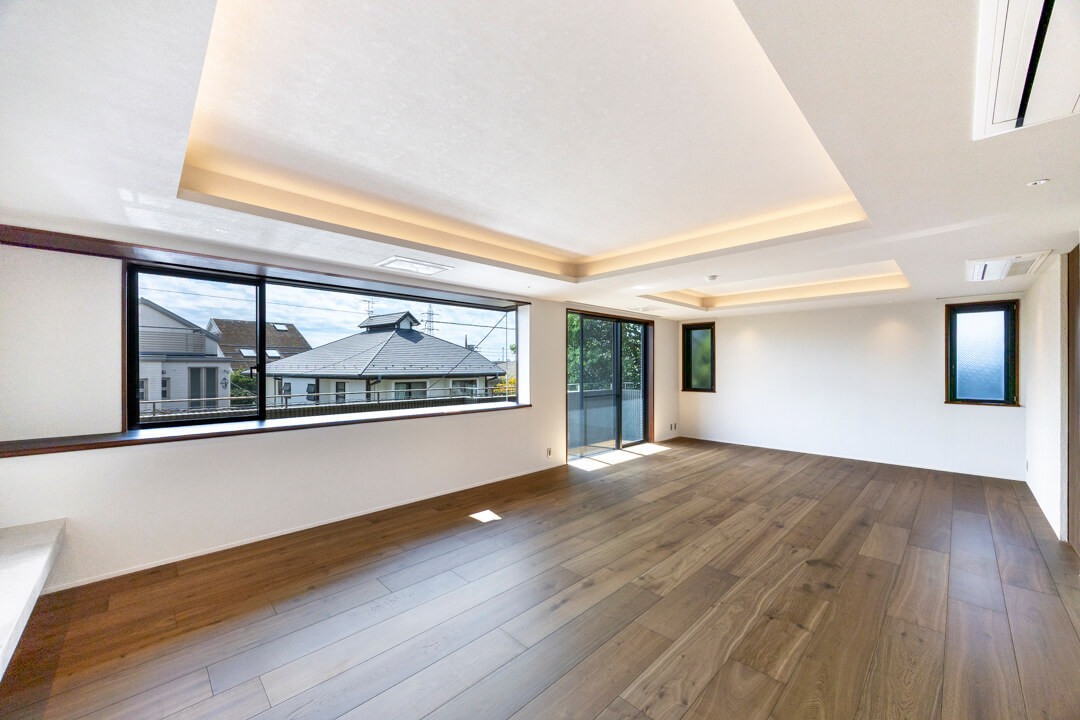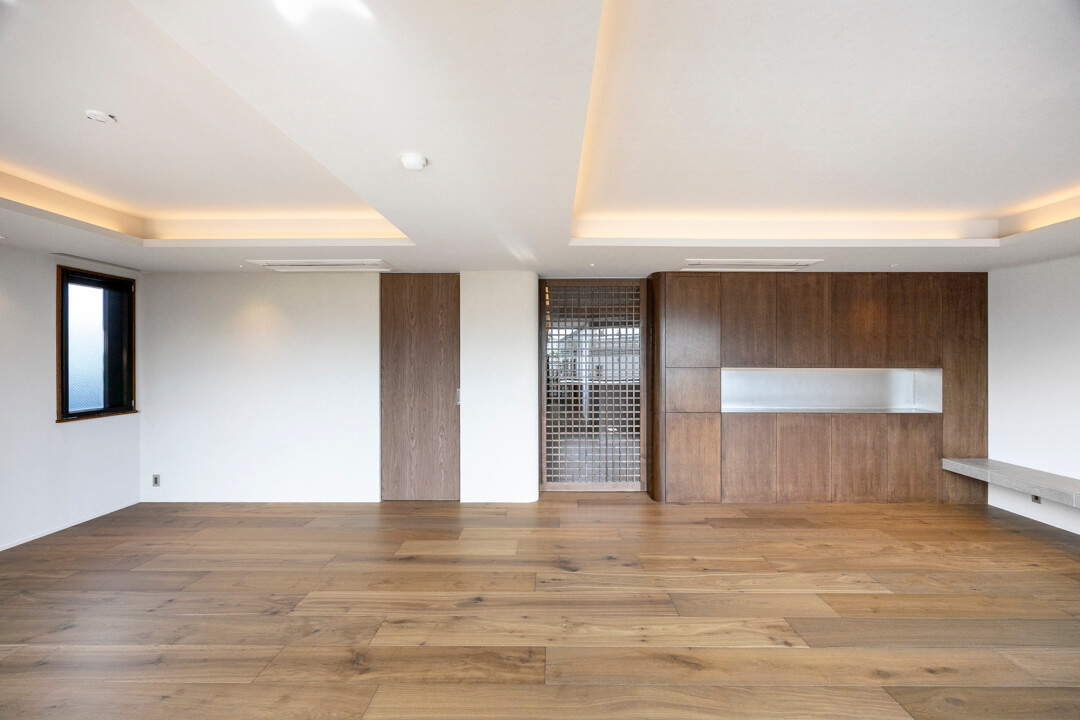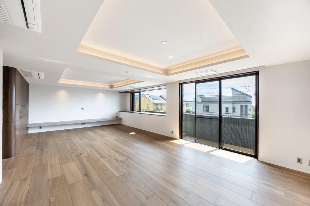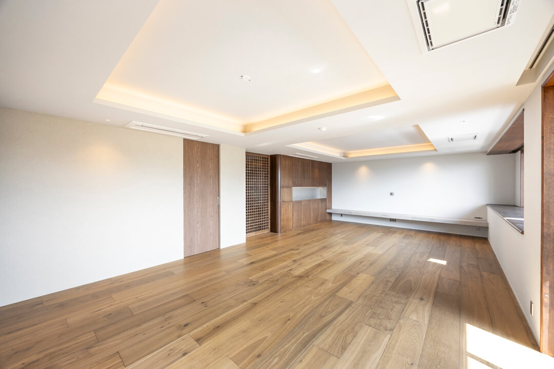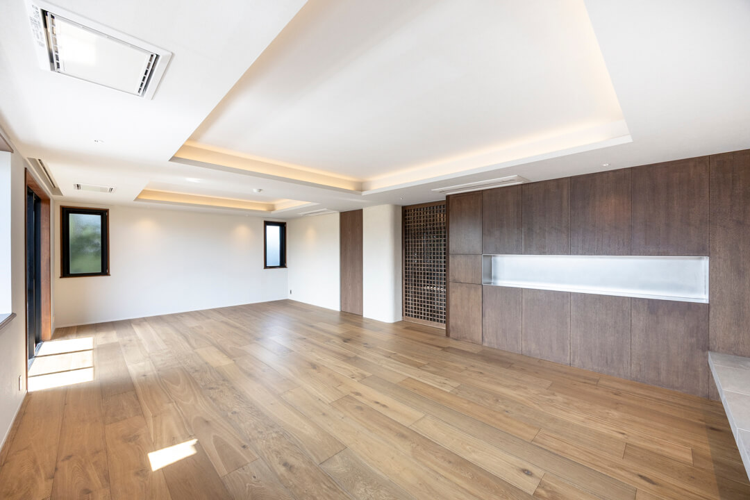 約27.5帖の広々としたリビングダイニングは、二面採光で開放的な空間となっています。さらに、南向きのため日当たりも良好です。折り上げ天井はお部屋に奥行きをもたらし、そこに間接照明をあしらうことで上品さもプラスしています。