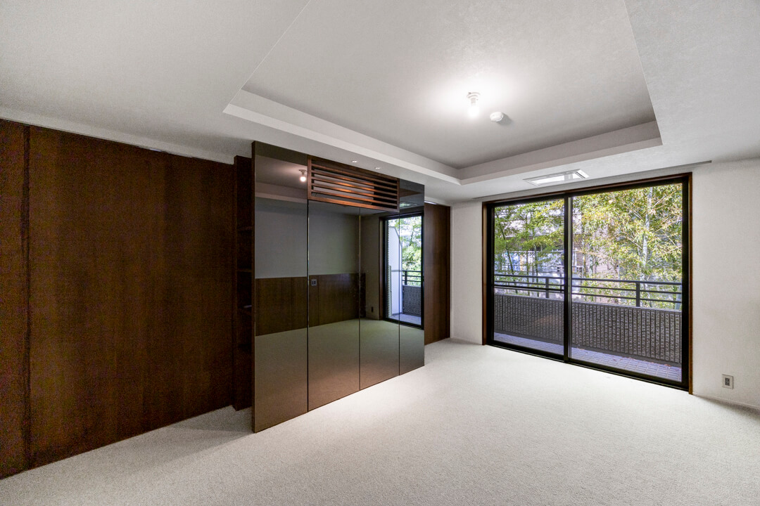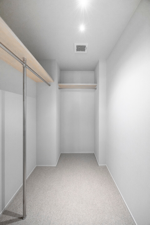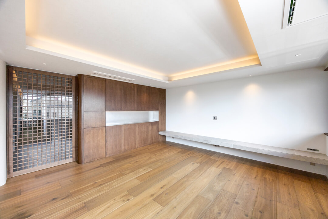 約10.9帖の主寝室にはウォークインクローゼットが造られています。奥行きがあるので、洋服や大きめの荷物などたくさんの物を収納することができますよ。また、折り上げ天井には間接照明、壁面には木目柄のアクセントボードがあしらわれていて、上品な雰囲気が漂います。