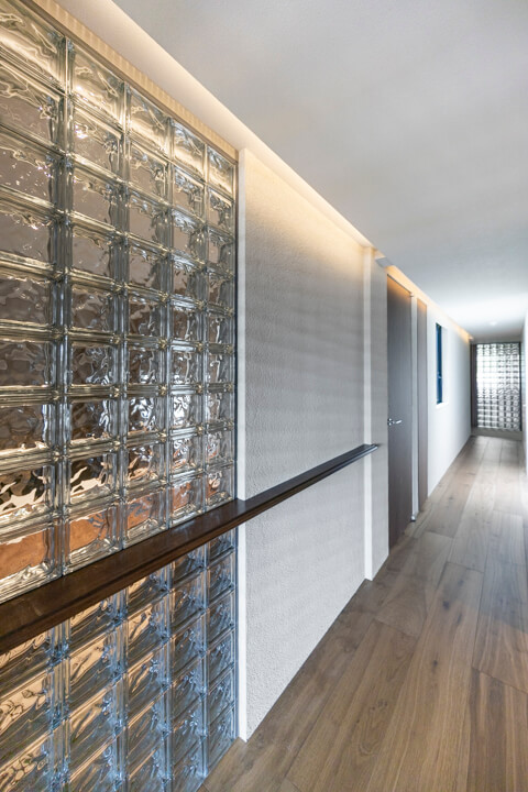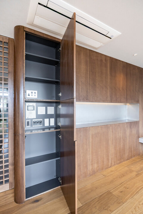 格子扉で和モダンな雰囲気を醸し出し、一部の壁面は漆喰のようなテクスチャーで趣を感じます。また、スイッチやインターホンなどは扉の中に隠し、お部屋の雰囲気を大切にしています。