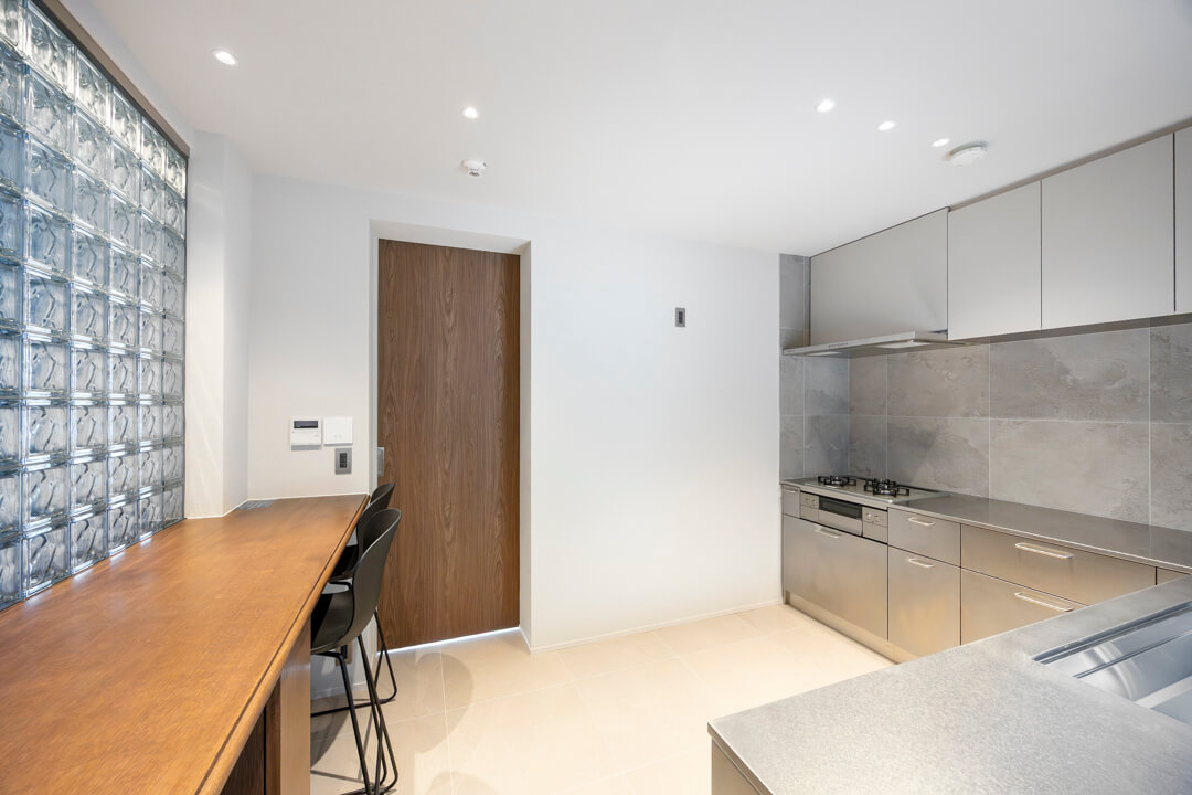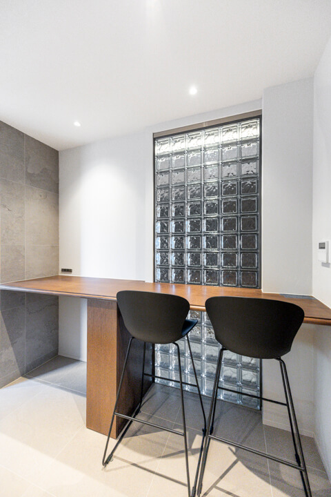 キッチンの背面側にはカウンターが造られています。ハイチェアを置いて食事をすることもできますし、作業スペースや家事スペースとしても使うことができる便利なカウンターです。家電なども置いても◎。