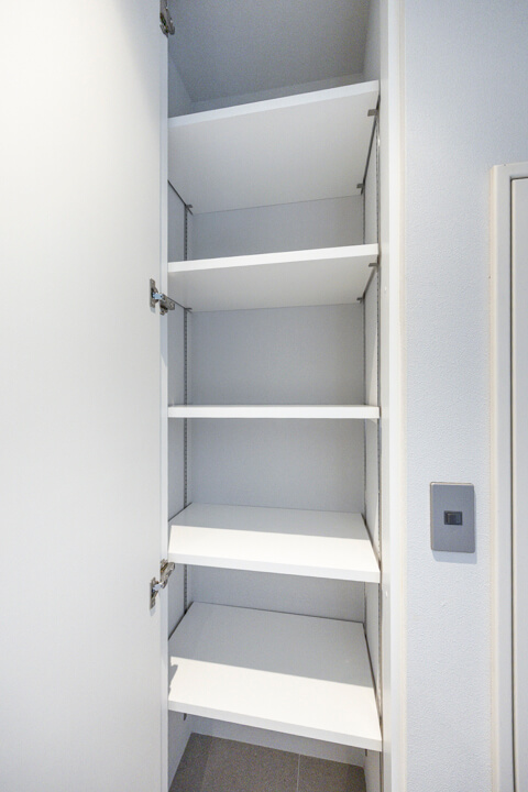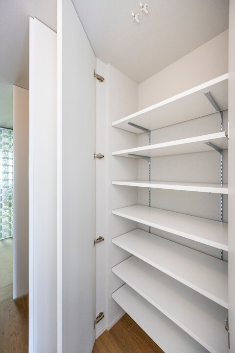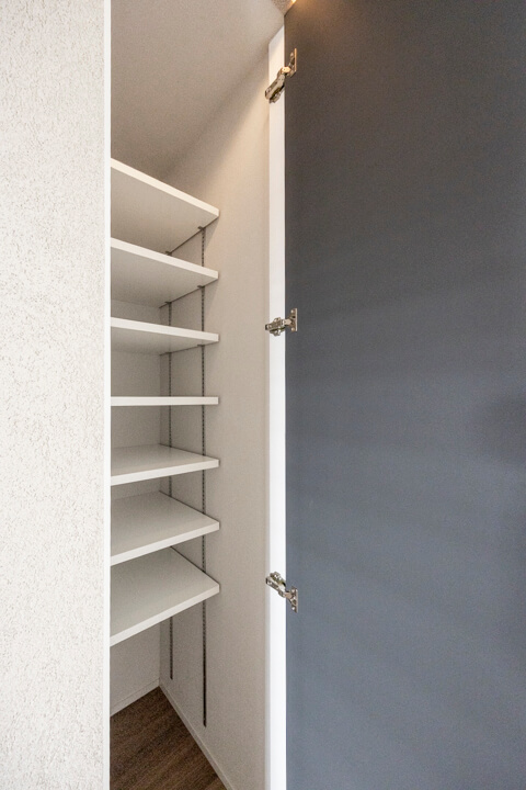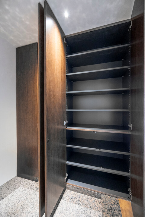 重厚感のある玄関には高さのあるシューズボックスが備え付けられています。たくさんの靴が収納できるので、すっきりとした印象に演出できますよ。また、照明には人感センサーが付いているので、帰宅時に両手が塞がっていても安心です。消し忘れも防止できて節電にもなりますね。