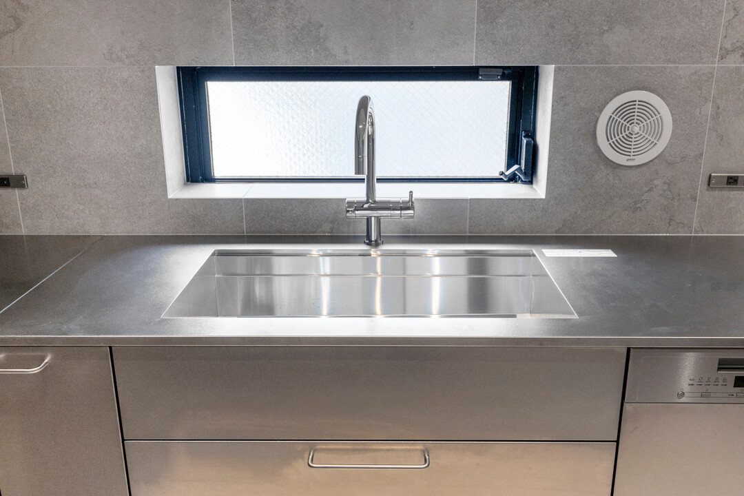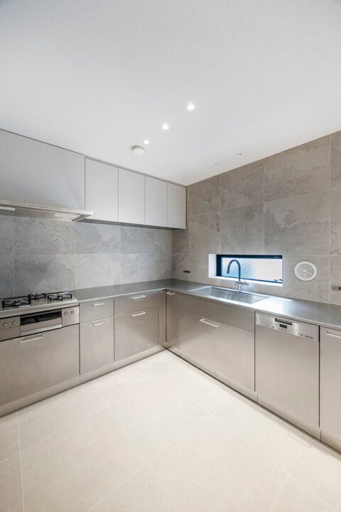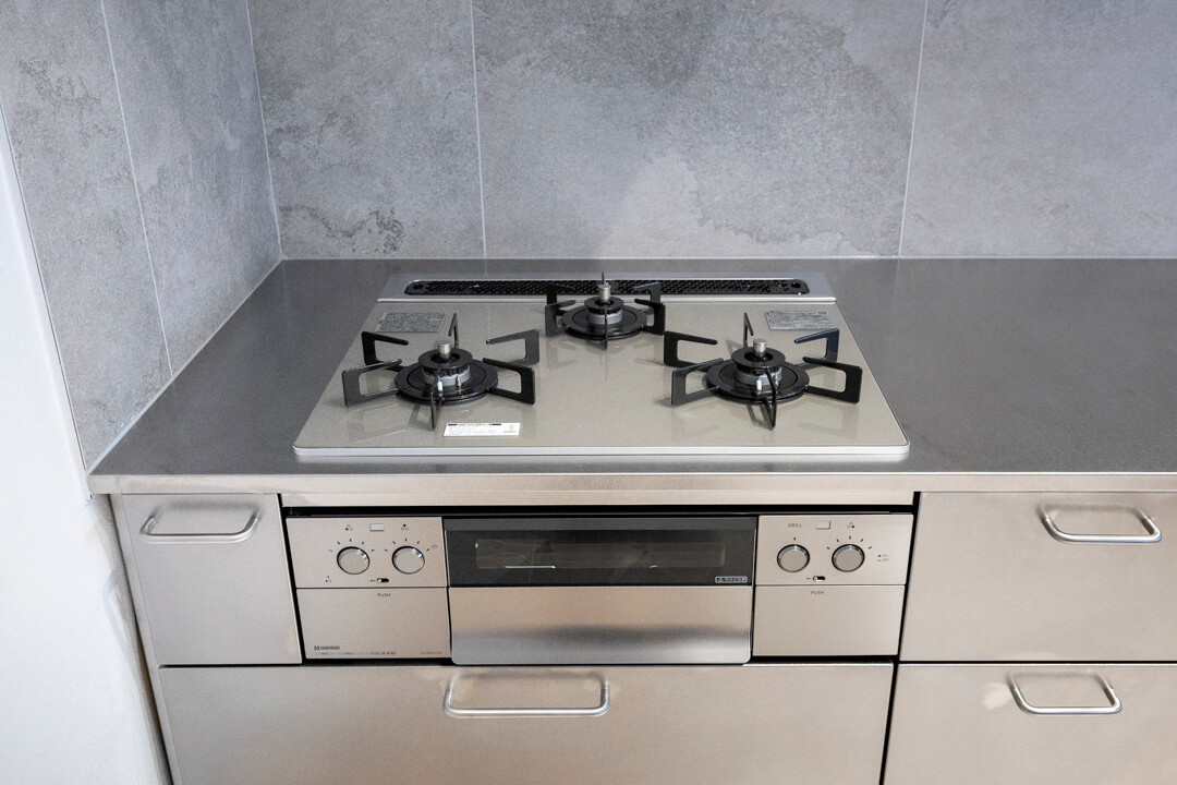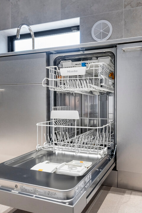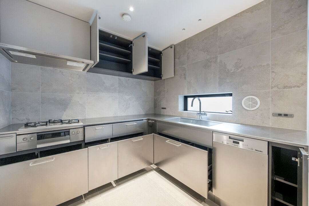 3口コンロ、グリル、ドイツの高級家電メーカーミーレ製の大型食洗機付きと設備面も充実しています。シンクも広々としているので野菜などが洗いやすそうですよ。
