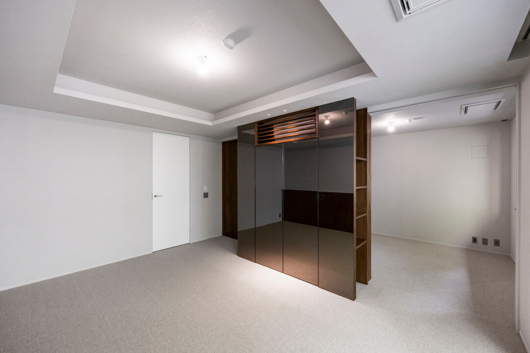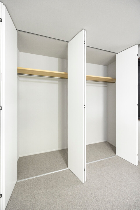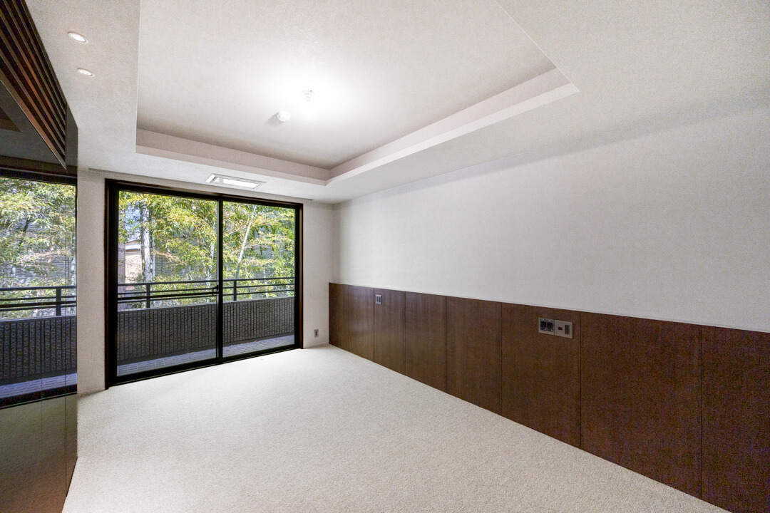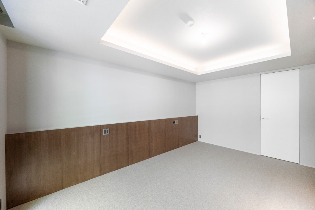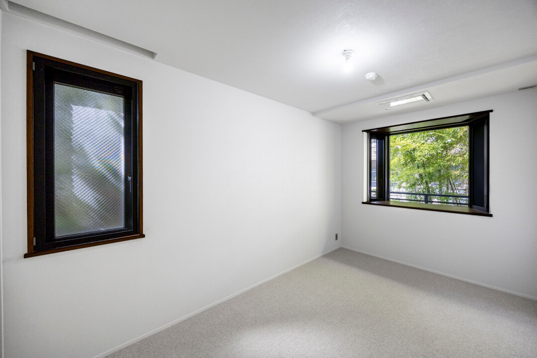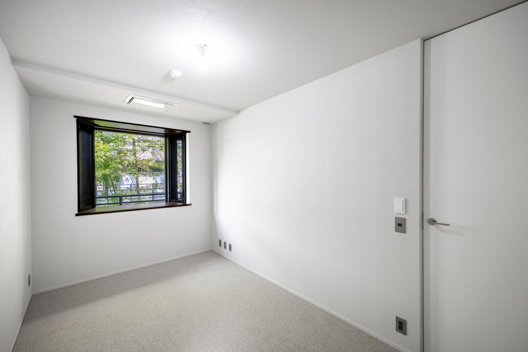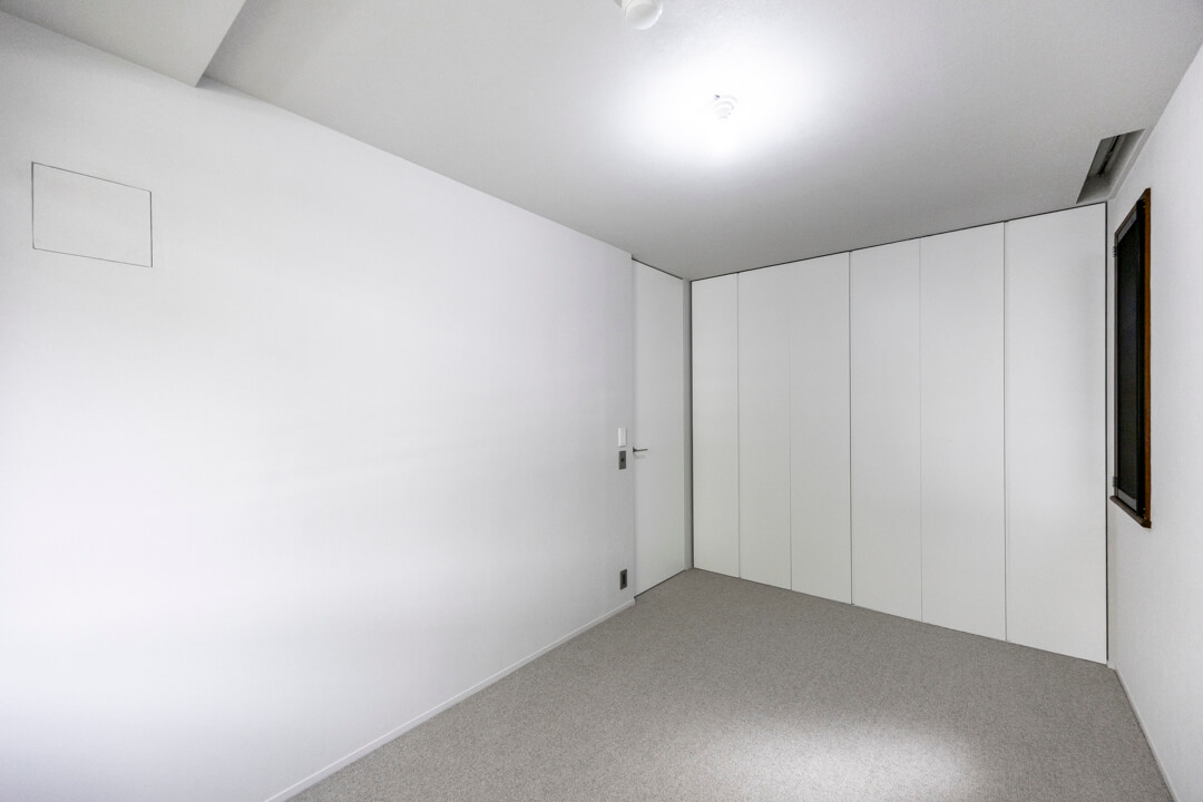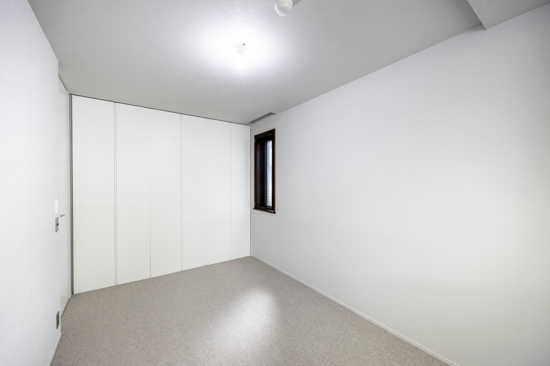 約6.9帖の洋室2は、書斎や趣味部屋などにぴったりな空間。引戸を開ければ主寝室と繋げて使えるので2LDKとしても成立しますよ。廊下、部屋といった区切りを感じにくくさせるため、全体をカーペット敷きにしており、ゆるやかなつながりを意識しています。