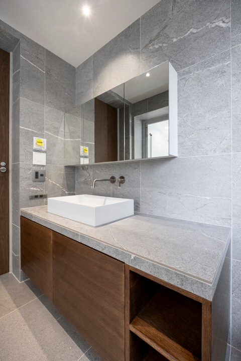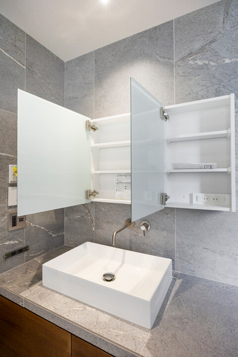 ホテルライクな置き型式の洗面ボウルです。カウンターが広めのため、身支度もしやすくなっています。また、ミラーボックスの中には化粧品などが収納できて使い勝手が良好です。