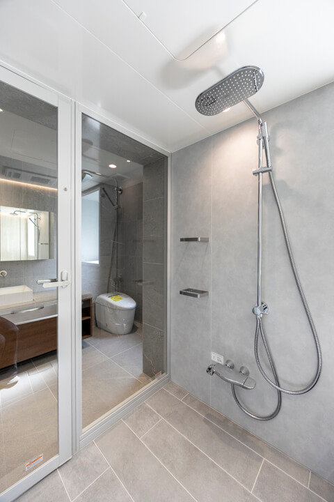 オーバーヘッドシャワーが付いているのでたっぷりと全身で湯を浴びることができます。リラックス効果や保温効果もあって◎。