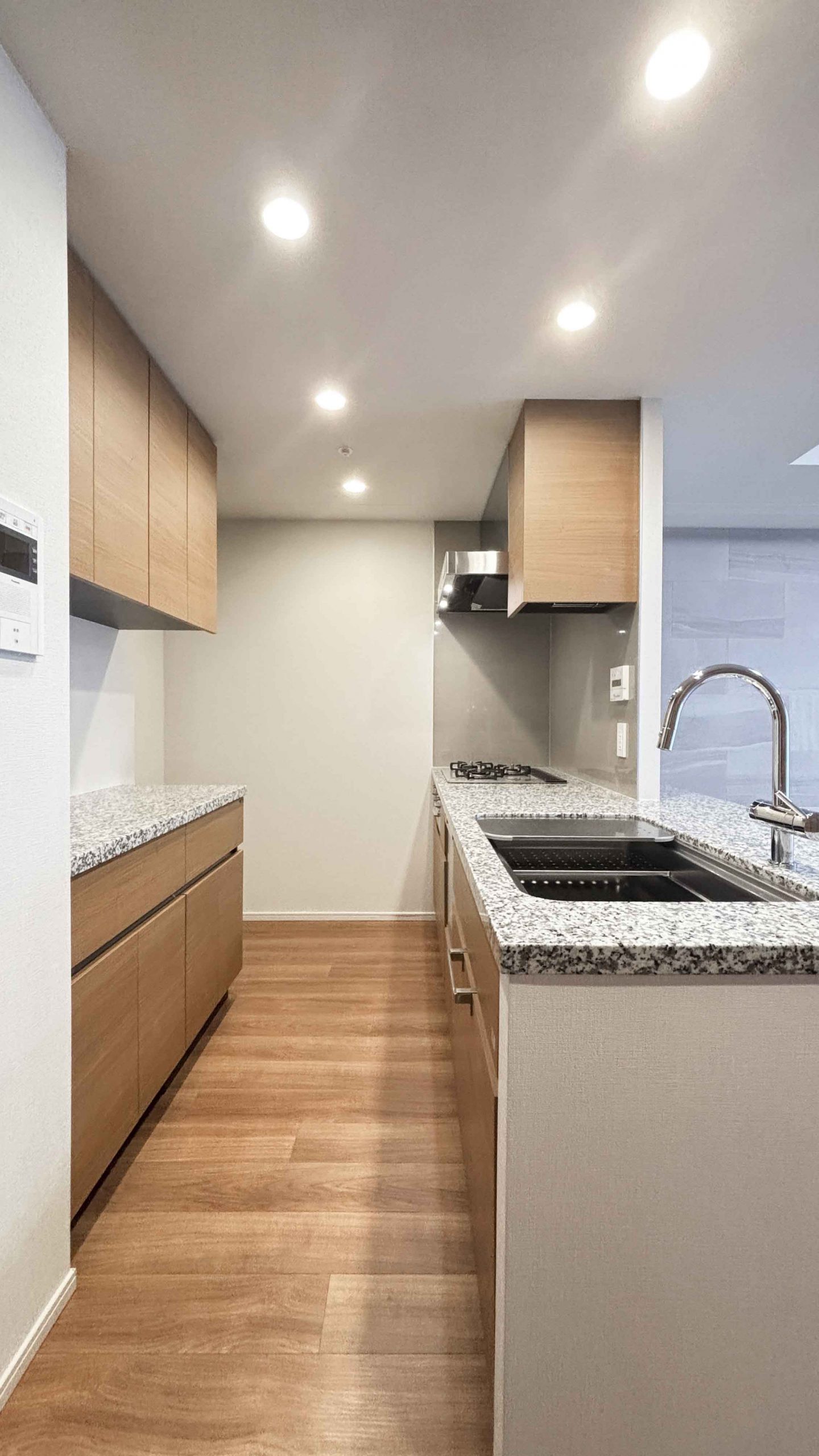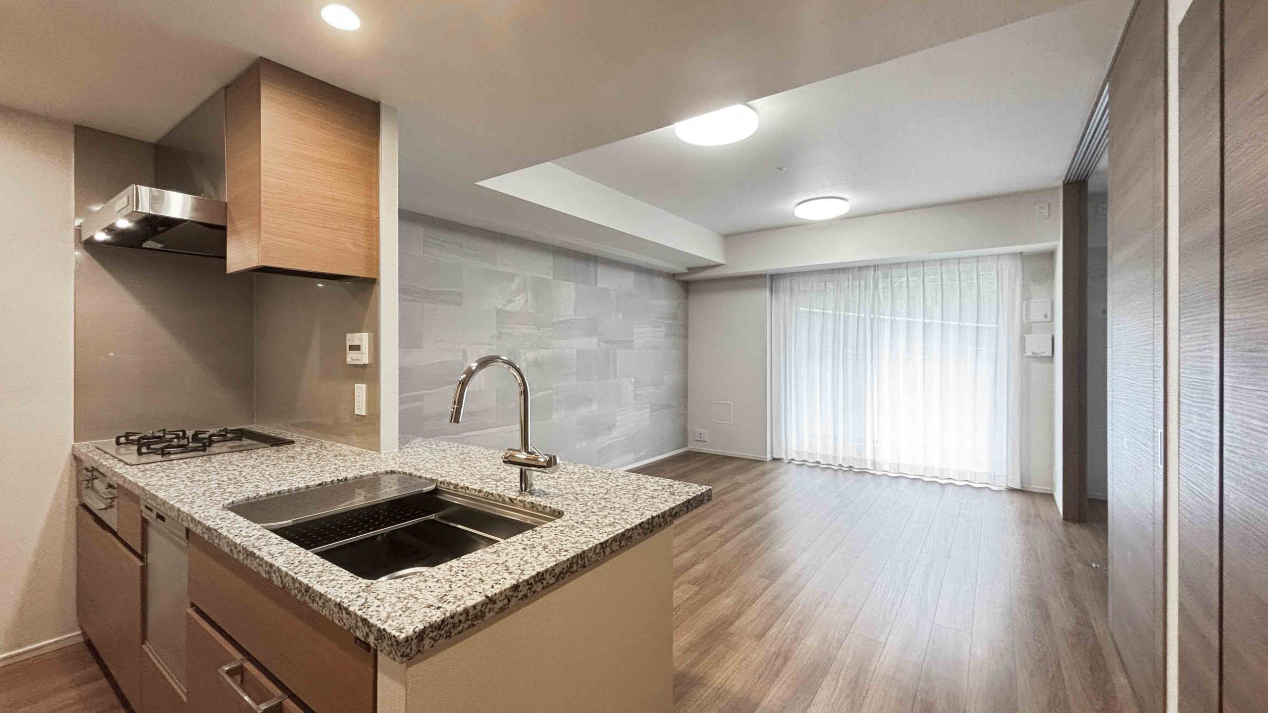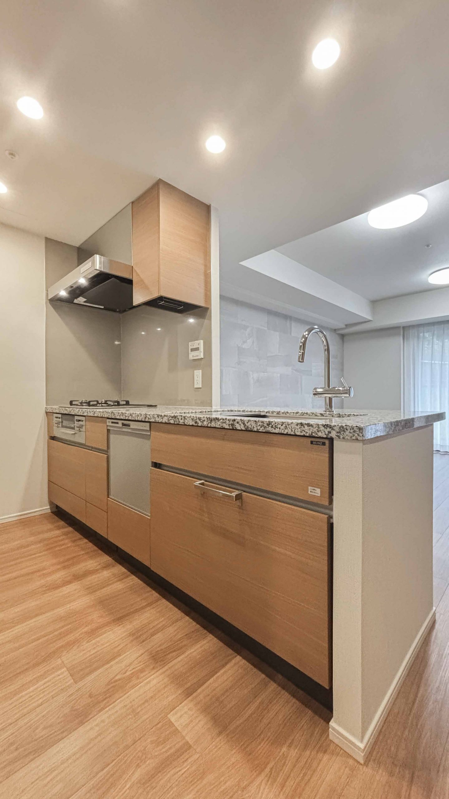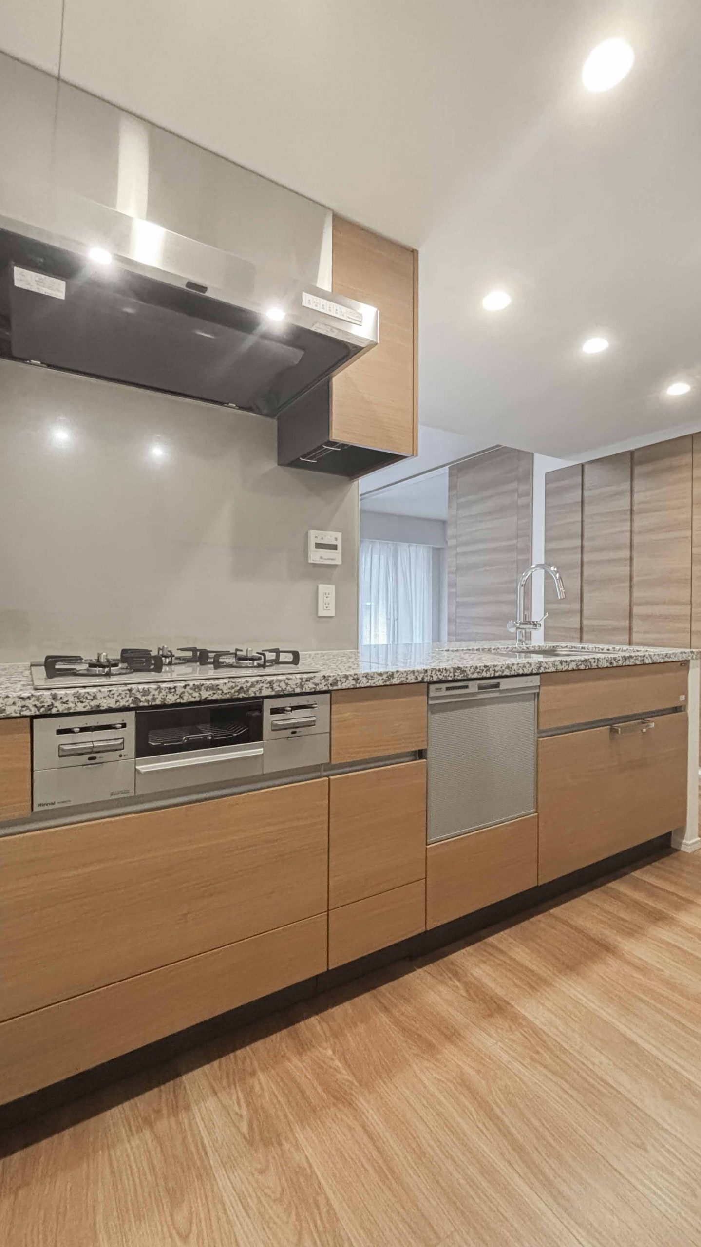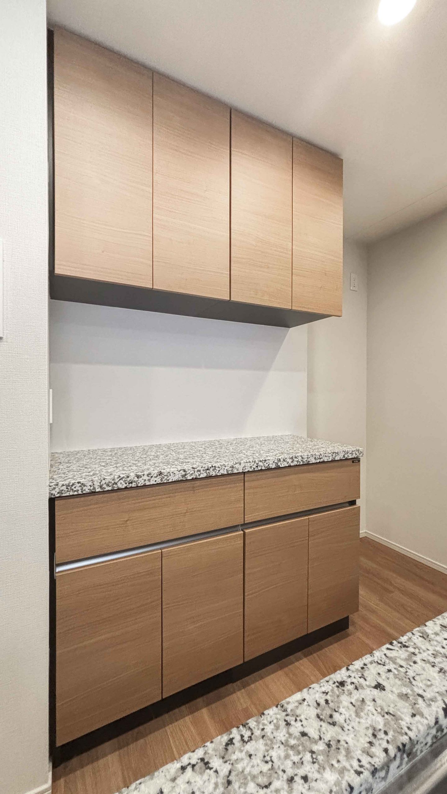 家族やゲストとコミュニケーションが取りやすい対面型のシステムキッチン。料理が捗る3口ガスコンロ、家事の時短に心強い食洗機付きで設備も充実しています。カップボード付きで収納スペースもしっかり確保されています。