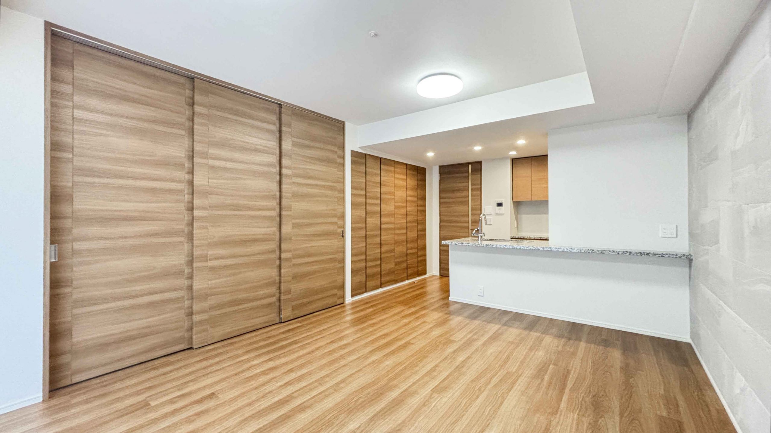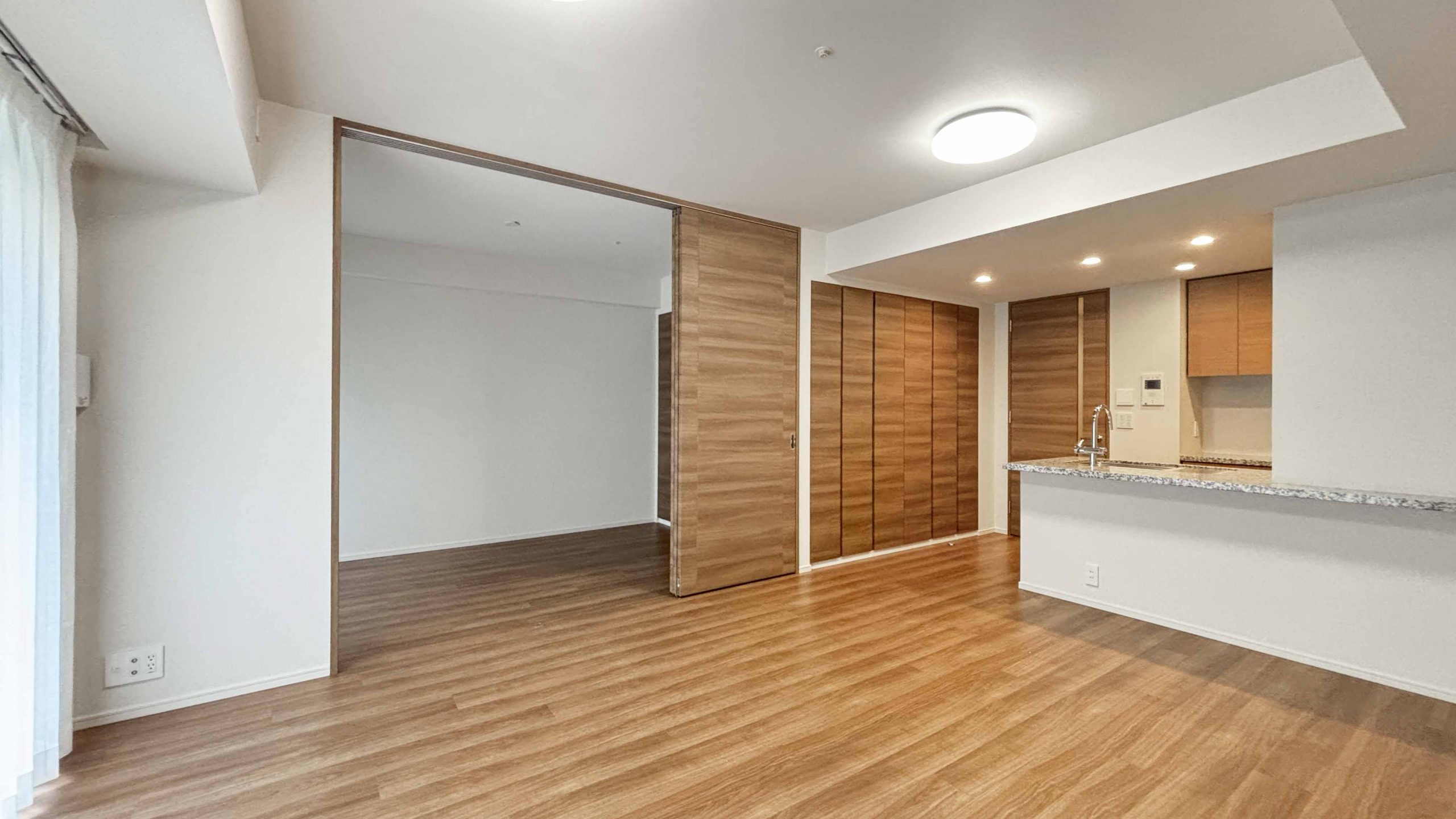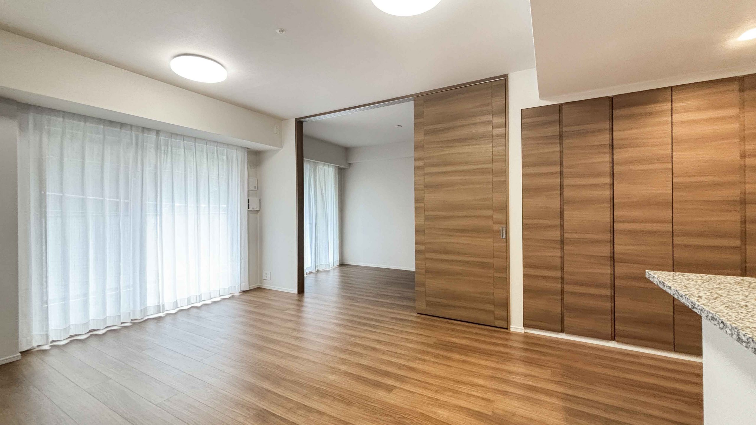 約11.9帖のリビングダイニング。自然な光が入る南向きで、バルコニーも付いています。リビングと隣接する洋室と繋げて、より広々と過ごすことも可能。床にドアレールがないので見た目もすっきりとした印象です。また、リビングの一角に収納スペースが備わっており、生活雑貨の整頓に便利です。