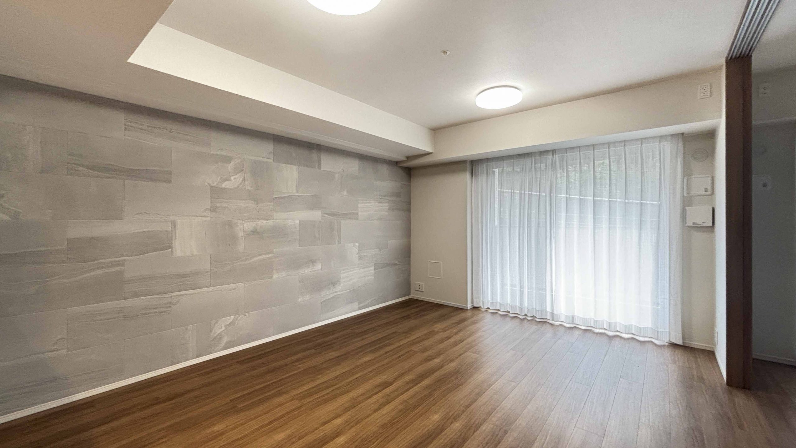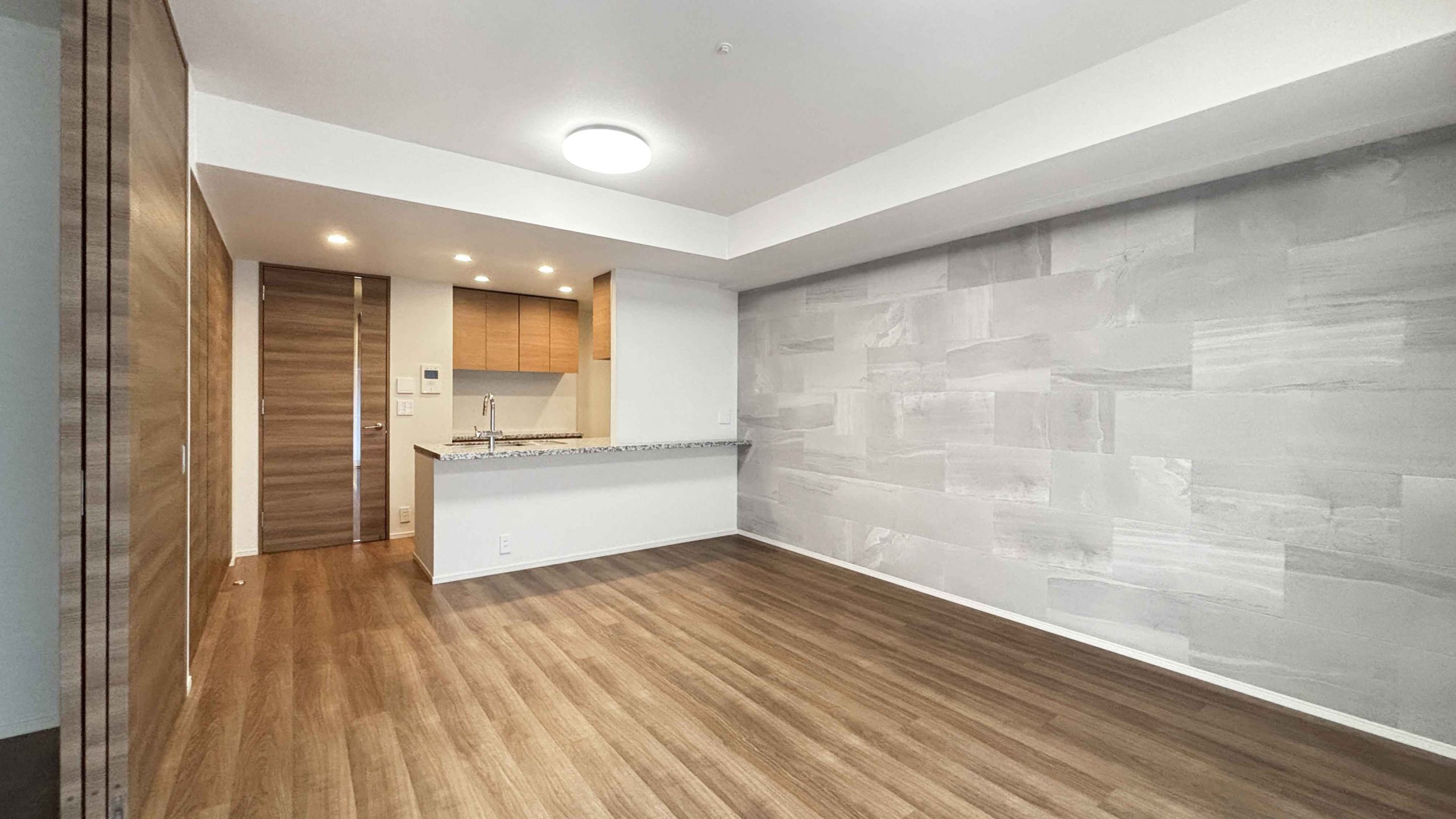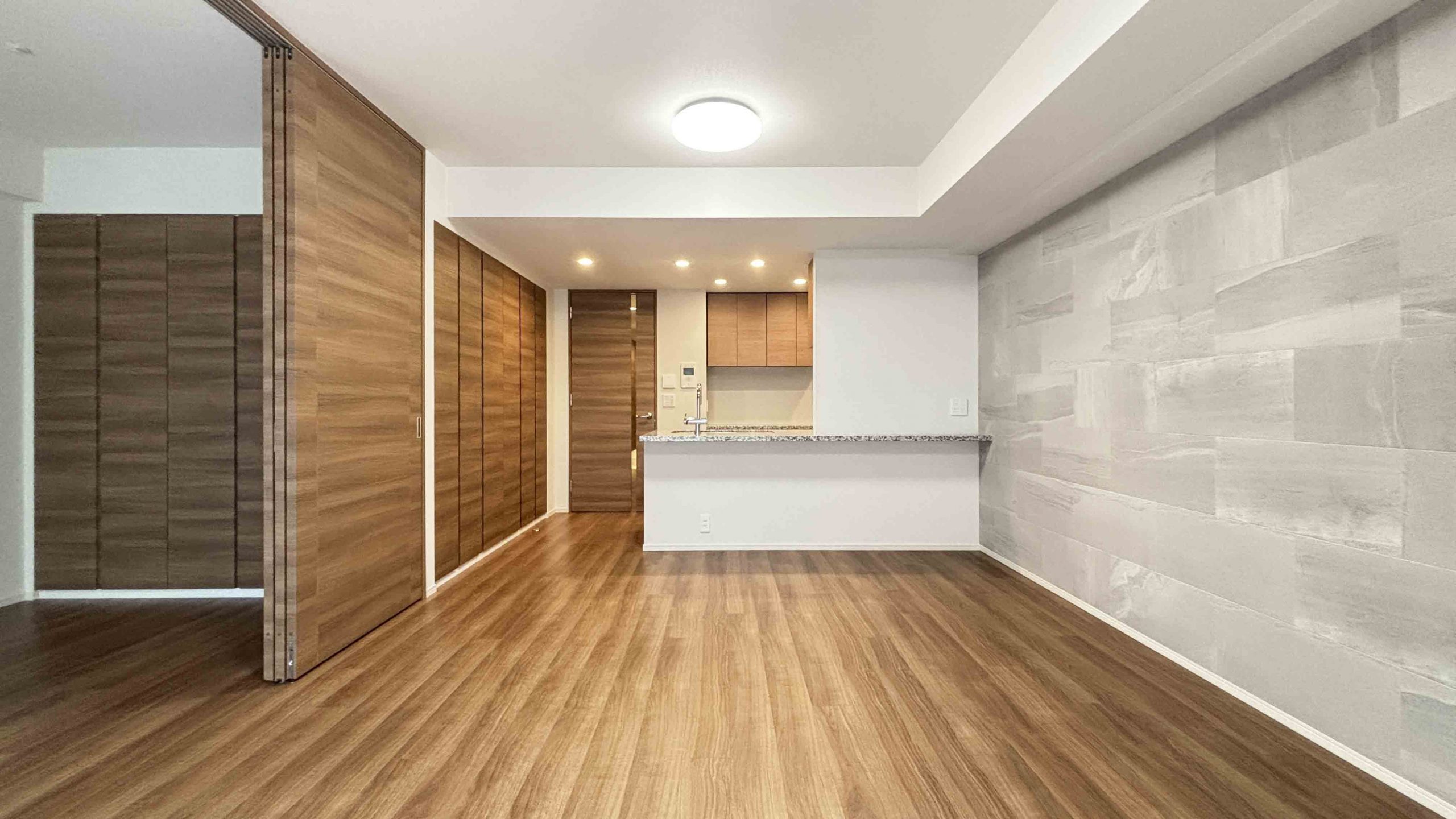 約11.9帖のリビングダイニング。自然な光が入る南向きで、バルコニーも付いています。リビングと隣接する洋室と繋げて、より広々と過ごすことも可能。床にドアレールがないので見た目もすっきりとした印象です。また、リビングの一角に収納スペースが備わっており、生活雑貨の整頓に便利です。