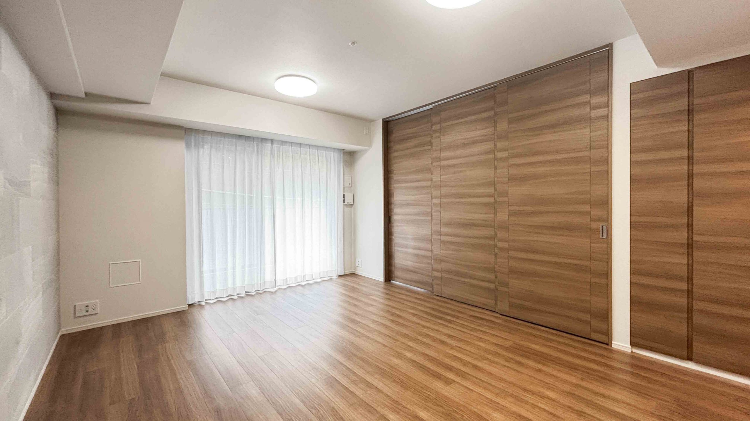 リビングダイニングと隣接した約5.3帖の洋室2。扉の開口部が広く取られており、空間を繋げてより広々と過ごせます。南向きで陽当り良好。バルコニーへの出入りもできます。クローゼットも備わっています。