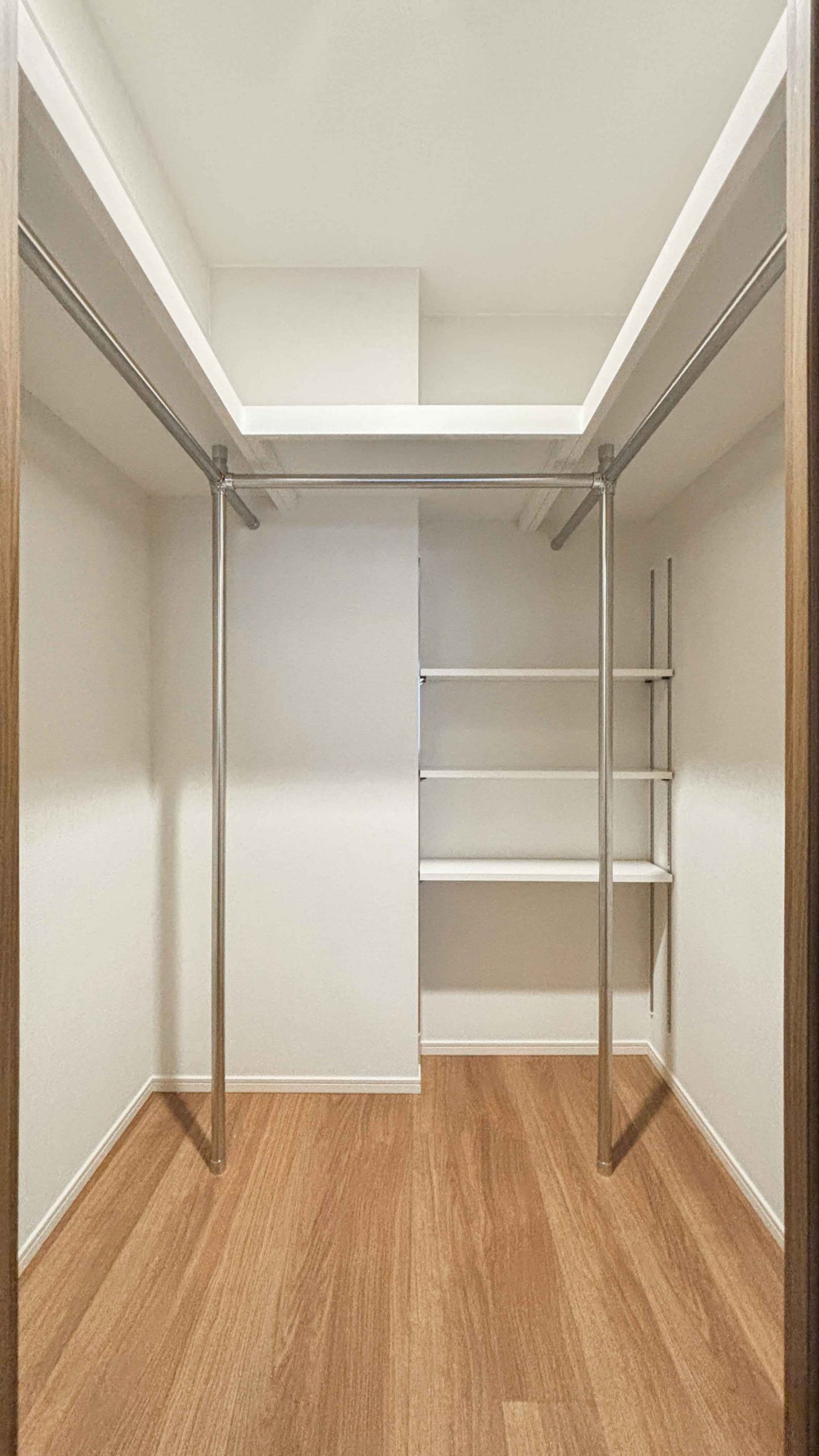 約6.0帖の洋室1。3つの洋室の中で一番広いお部屋。WIC(ウォークインクローゼット)は3方向にハンガーパイプが付いていて、洋服がたくさん掛けられます。可動棚付きバッグなどの小物の整理にも◎。