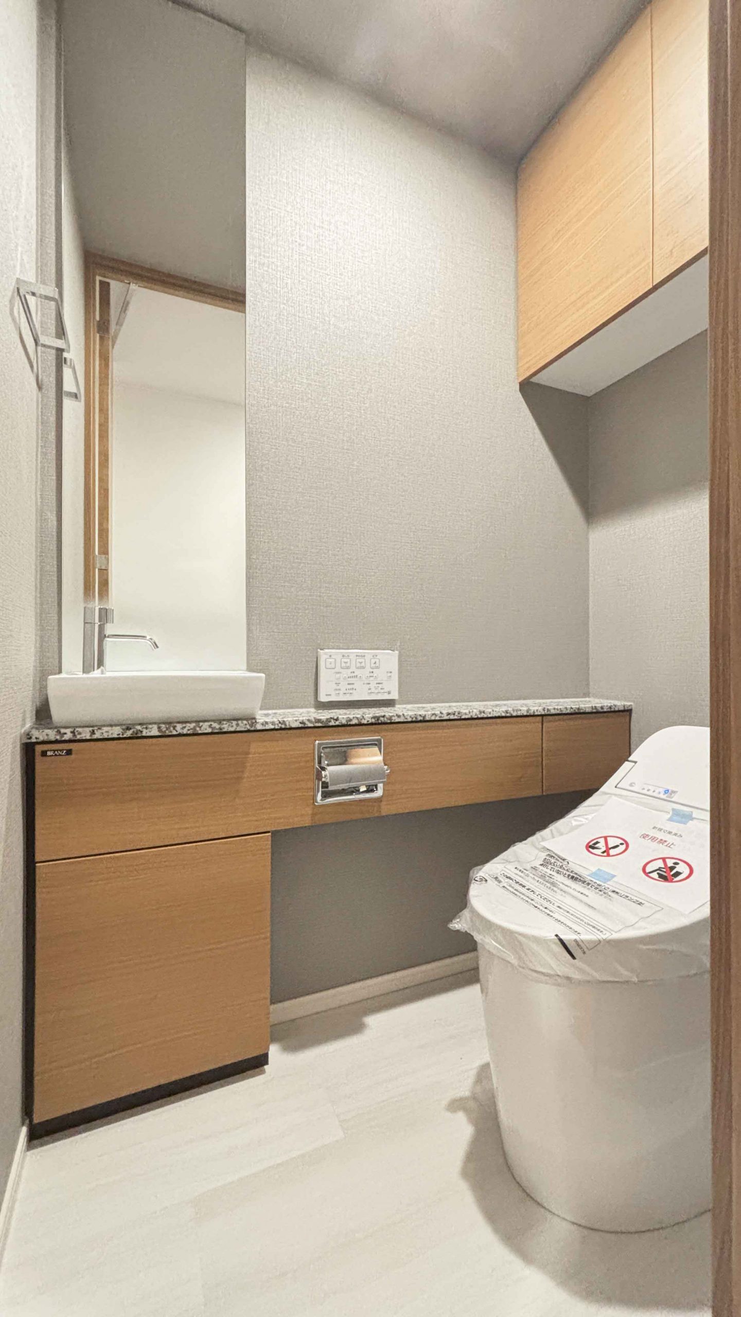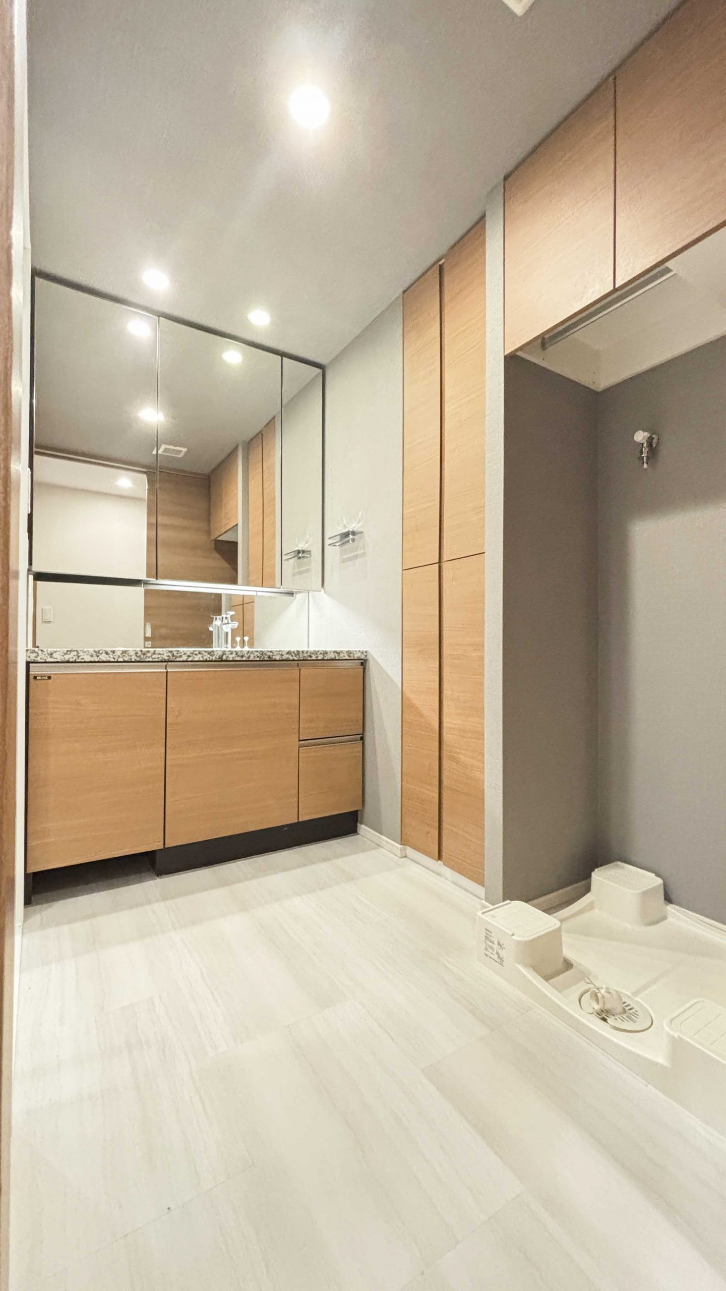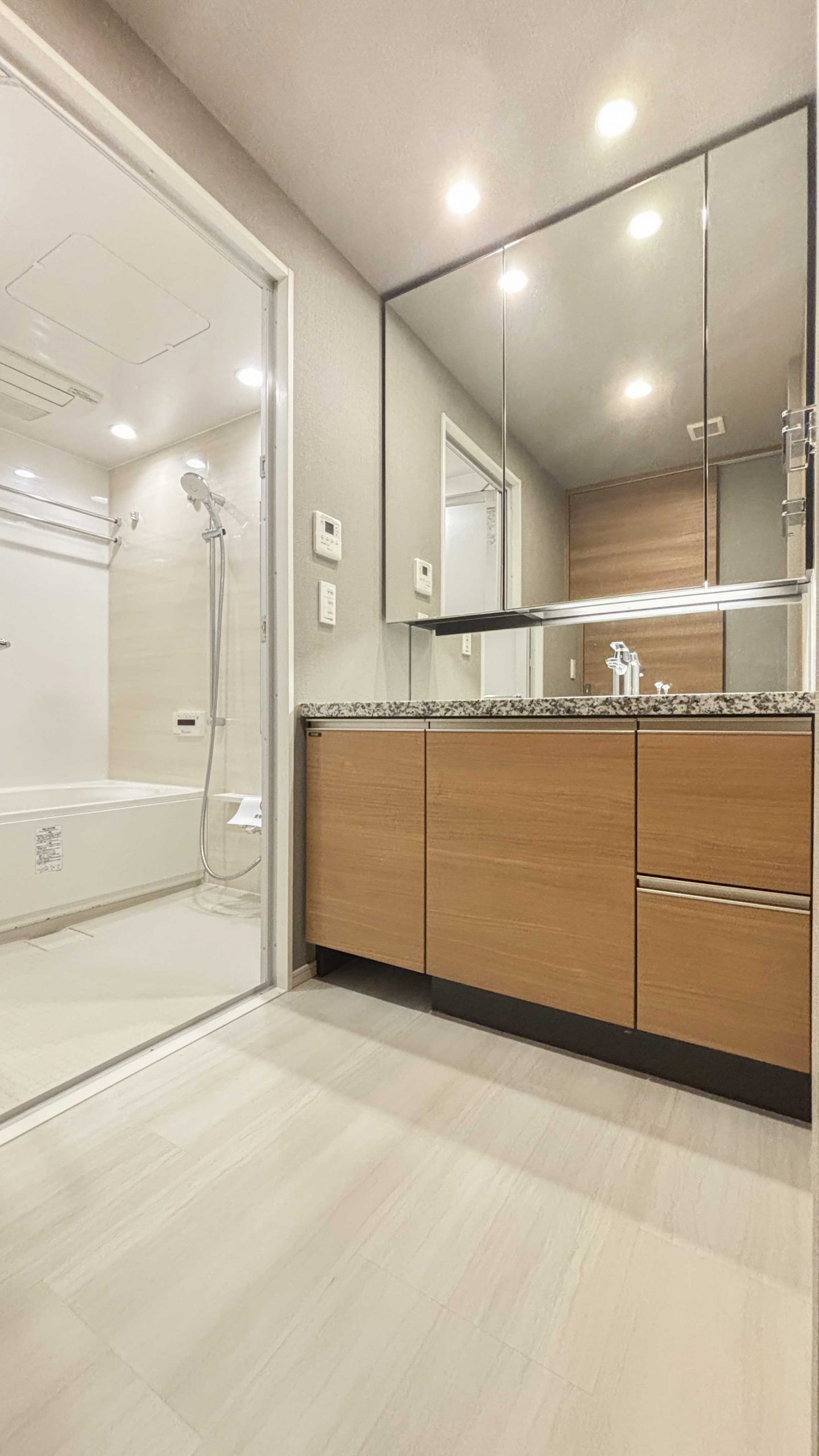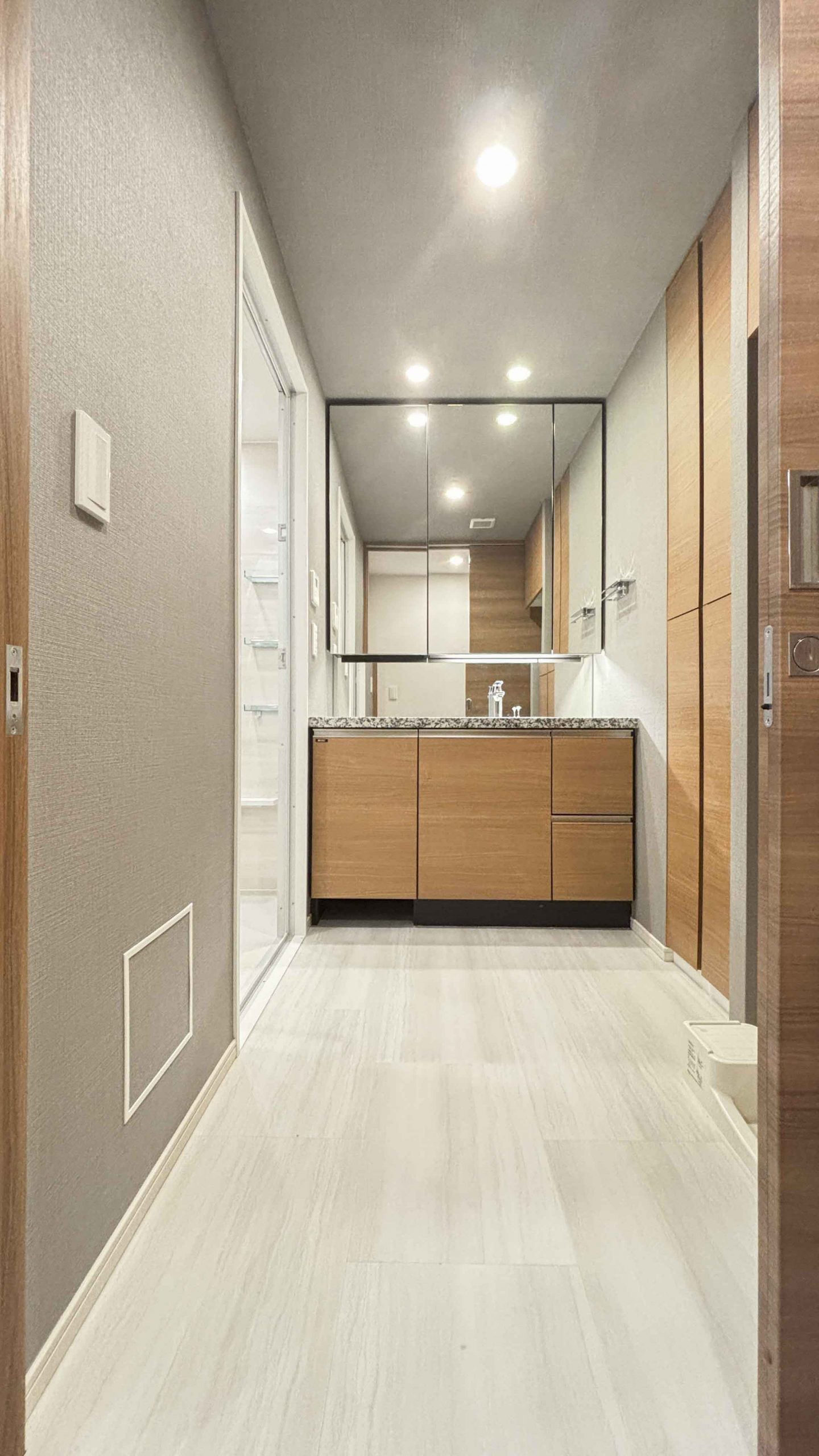 洗面化粧台は洗面まわりの小物がすっきりと整頓できるミラーボックス付きで、いつでも整った状態をキープできそうです。また、洗面台とは別途リネン庫も備わっています。