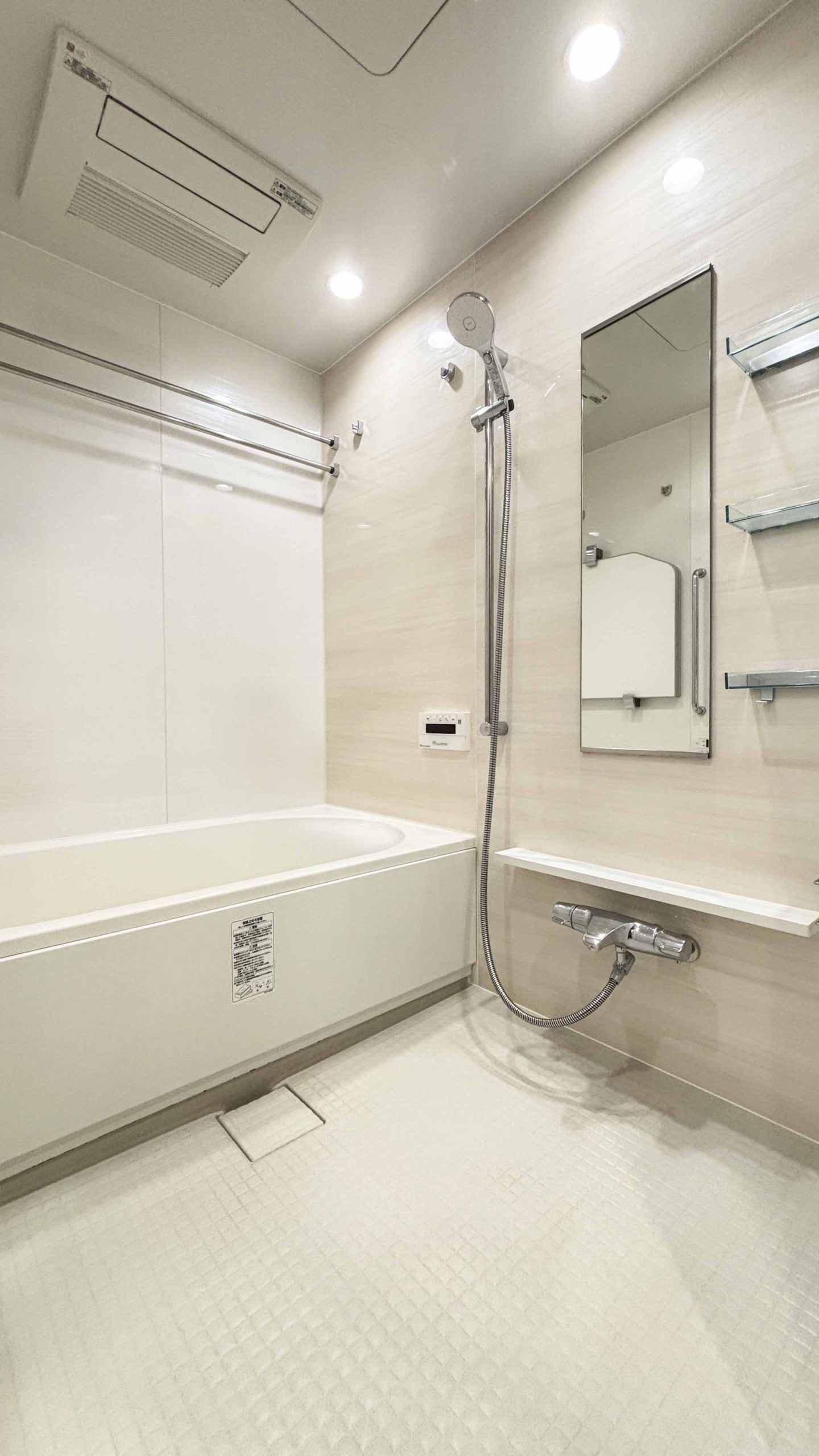1418サイズのバスルーム。追い炊き機能の他、浴室換気乾燥機とランドリーパイプ2本付きで雨の日や冬場の洗濯にも困りません。