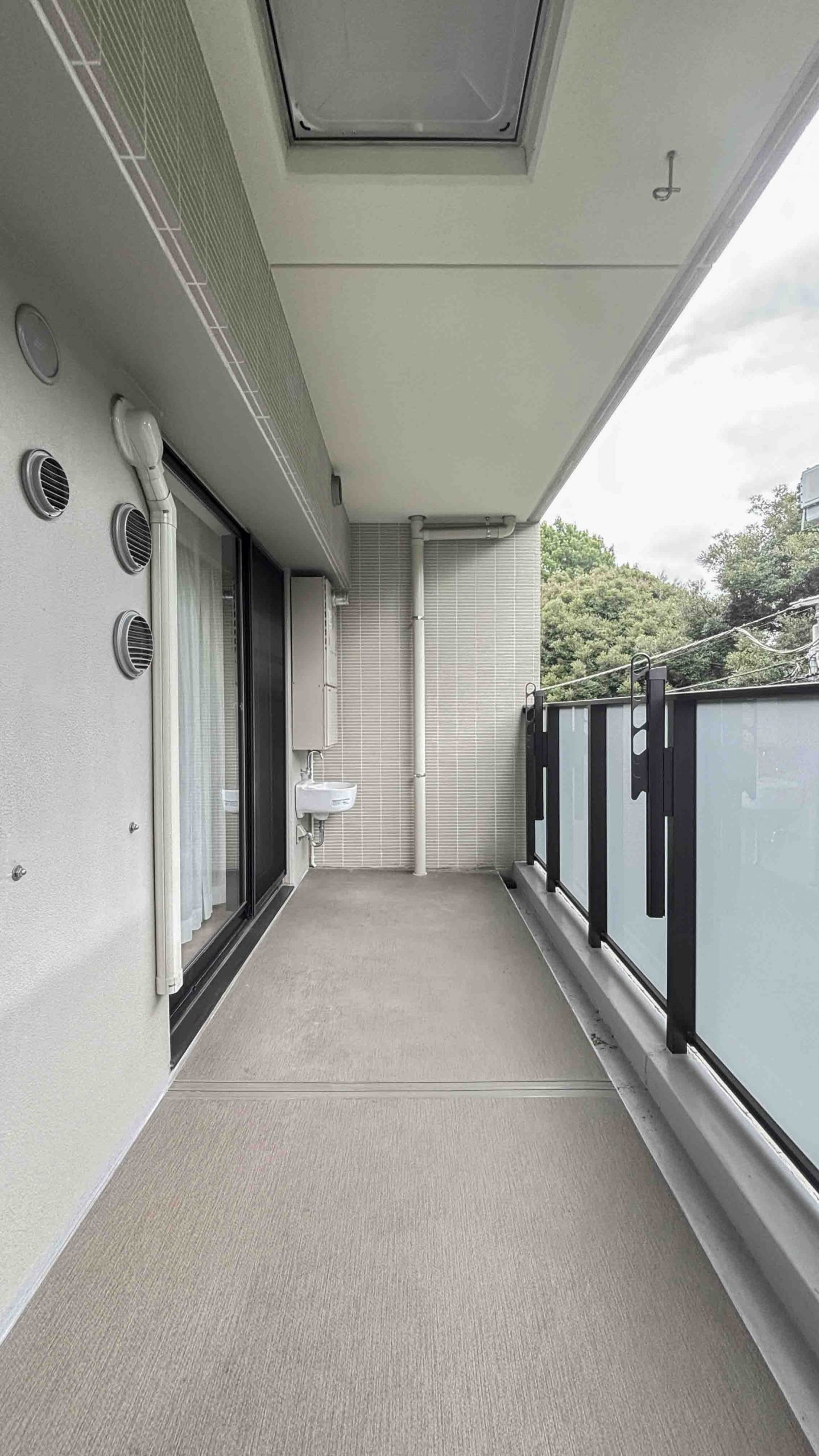 リビングダイニングと洋室2に面した約9.72㎡のバルコニー。南向きで陽当り良好。植物の水やりや、靴やアウトドア用品の手入れにも便利です。