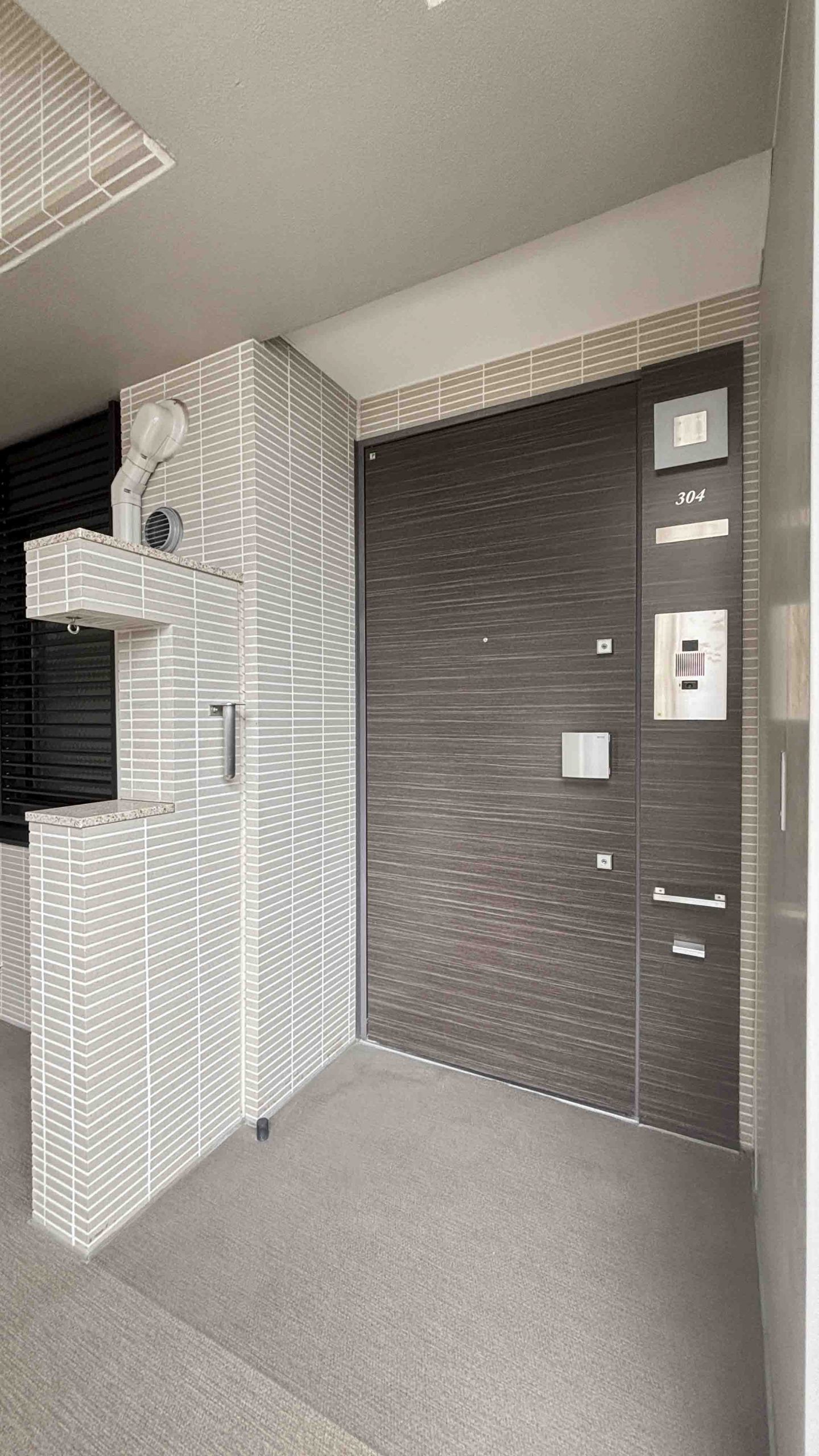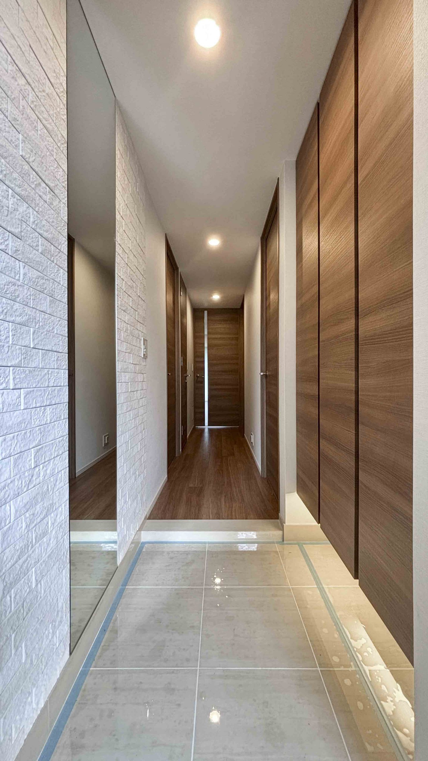 玄関には天井まで高さのあるシューズボックスを完備。足元をやさしい光で照らしてくれるフットライト付きです。また、姿見も設置されており、お出かけ前の身だしなみチェックもできます。