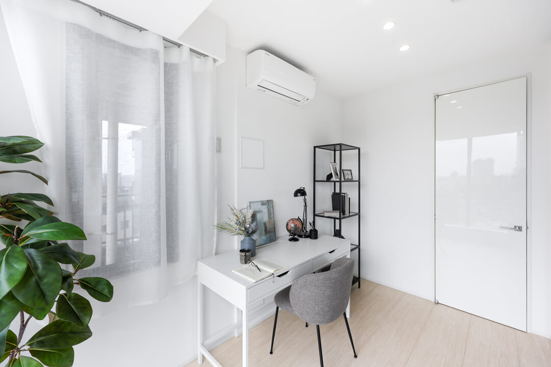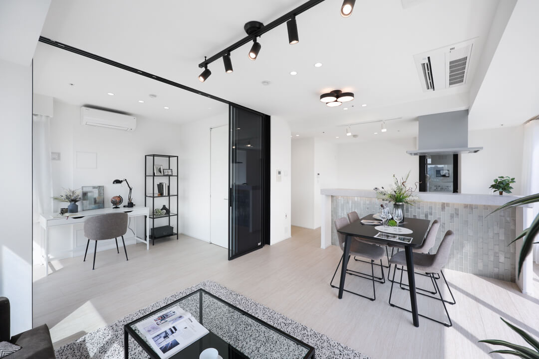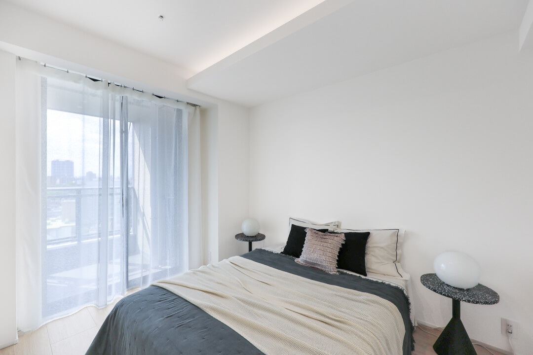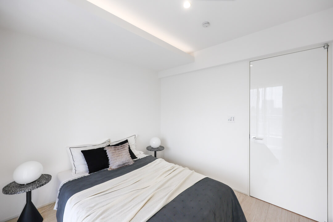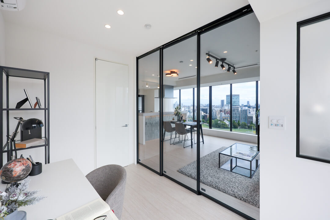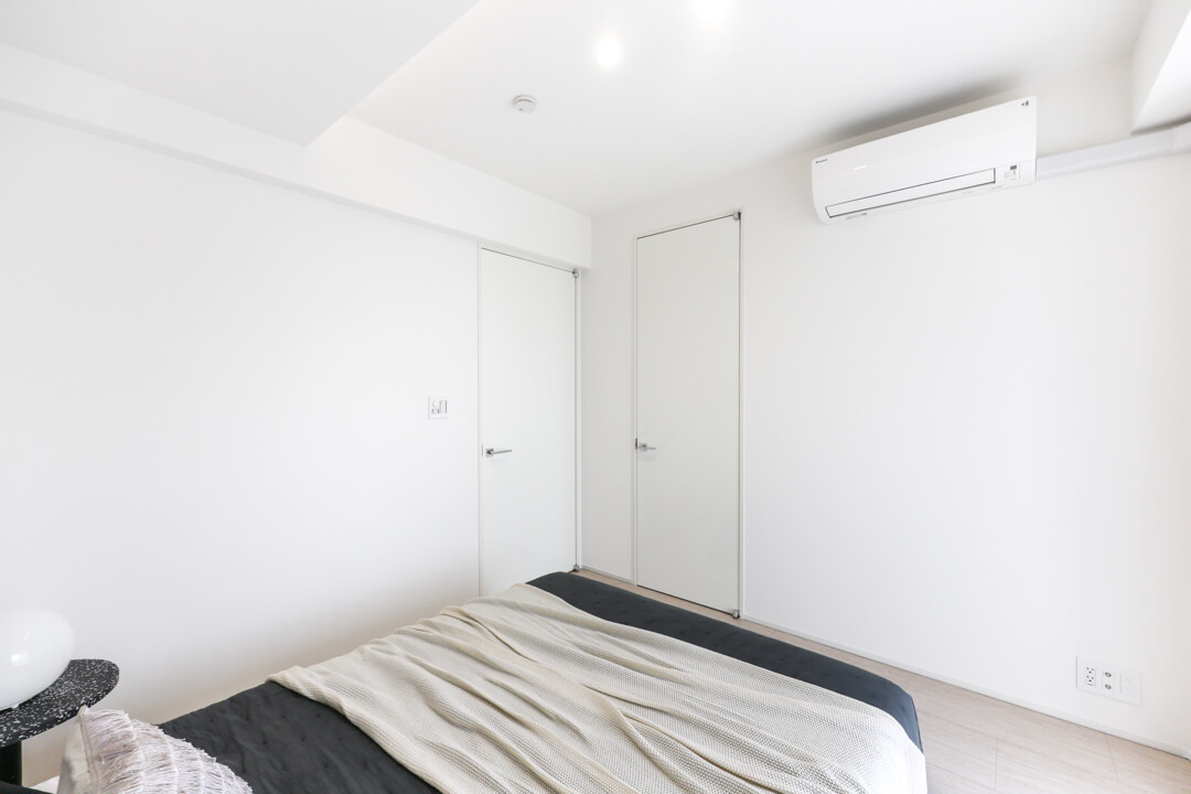 約4.7帖の寝室2は、リビングダイニングキッチンに隣接しています。引戸はガラス扉になっているので、空間に圧迫感を与えません。ブラックのフレームもアクセントになっています。また、ウォークインクローゼット付きのため収納スペースも確保されていますよ。