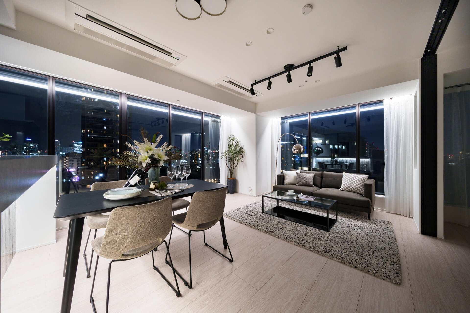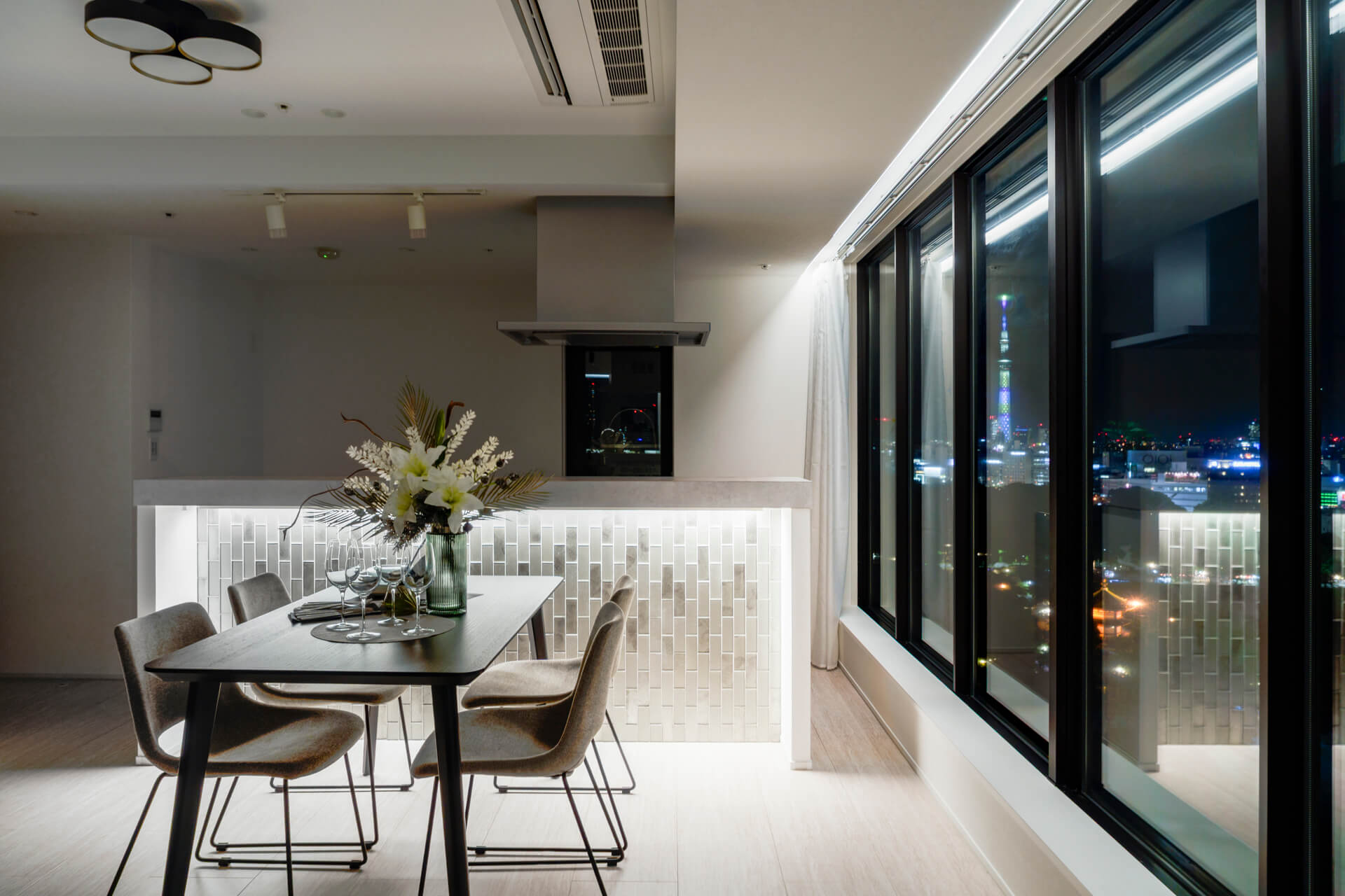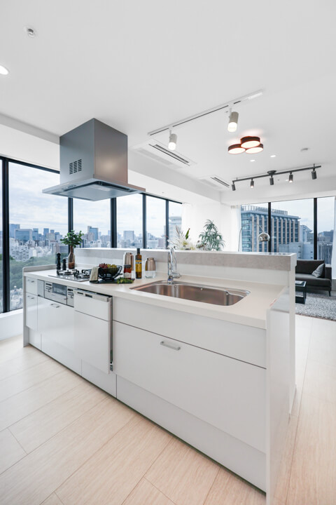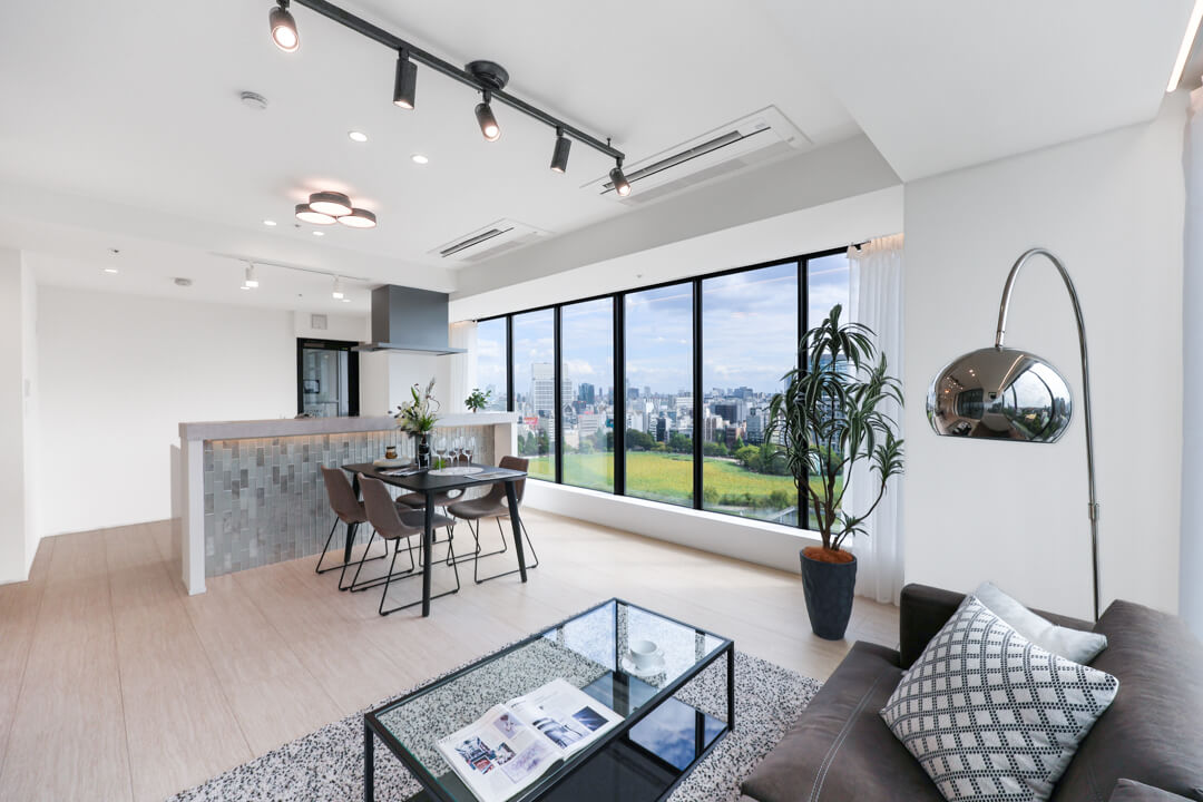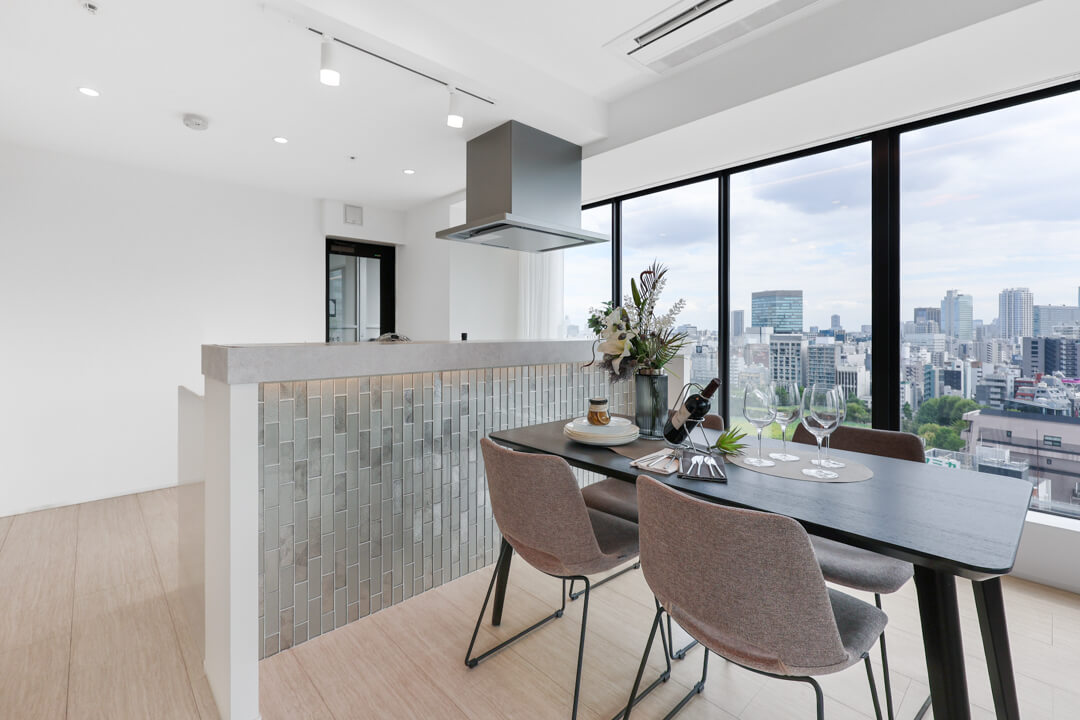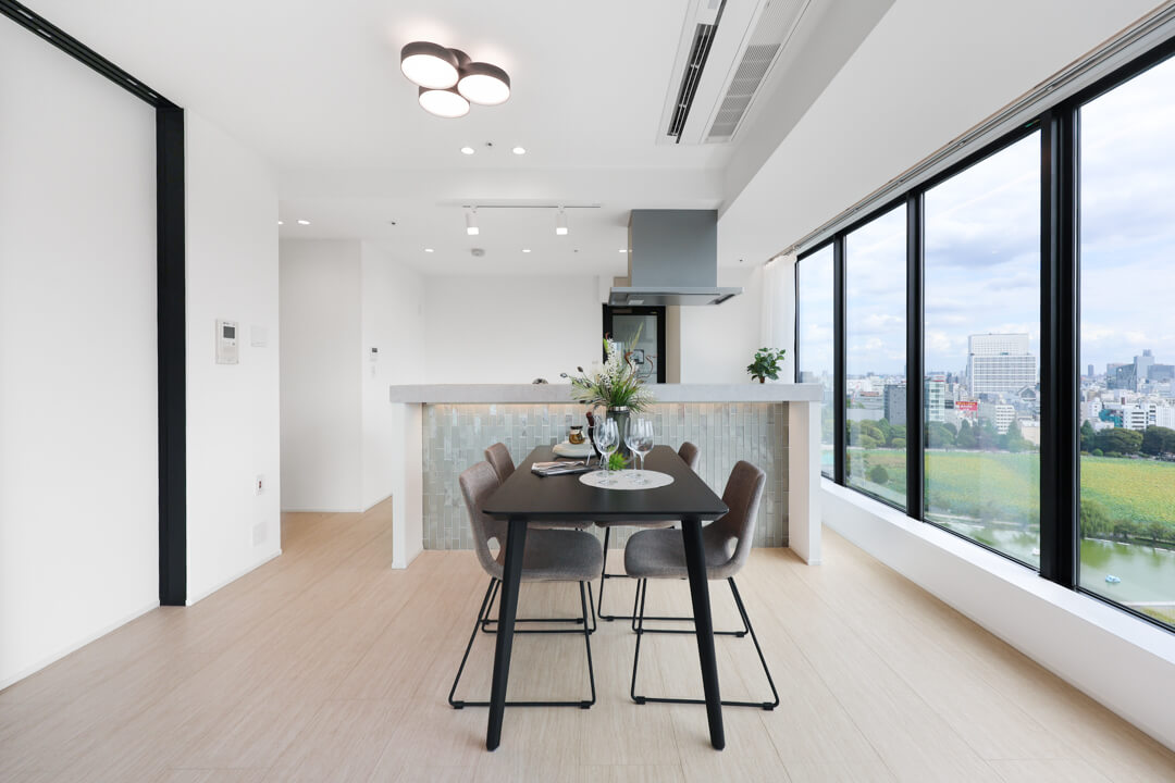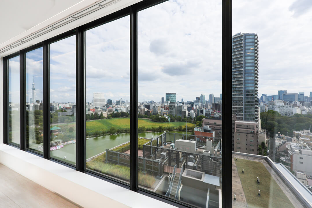 約17.6帖の広々としたリビングダイニングキッチンです。角部屋のため二面採光で日当たりが良好。窓からは開放的な眺望を堪能することができますよ。スカイツリーや不忍池、上野恩賜公園などが望め、夜景も楽しめます。