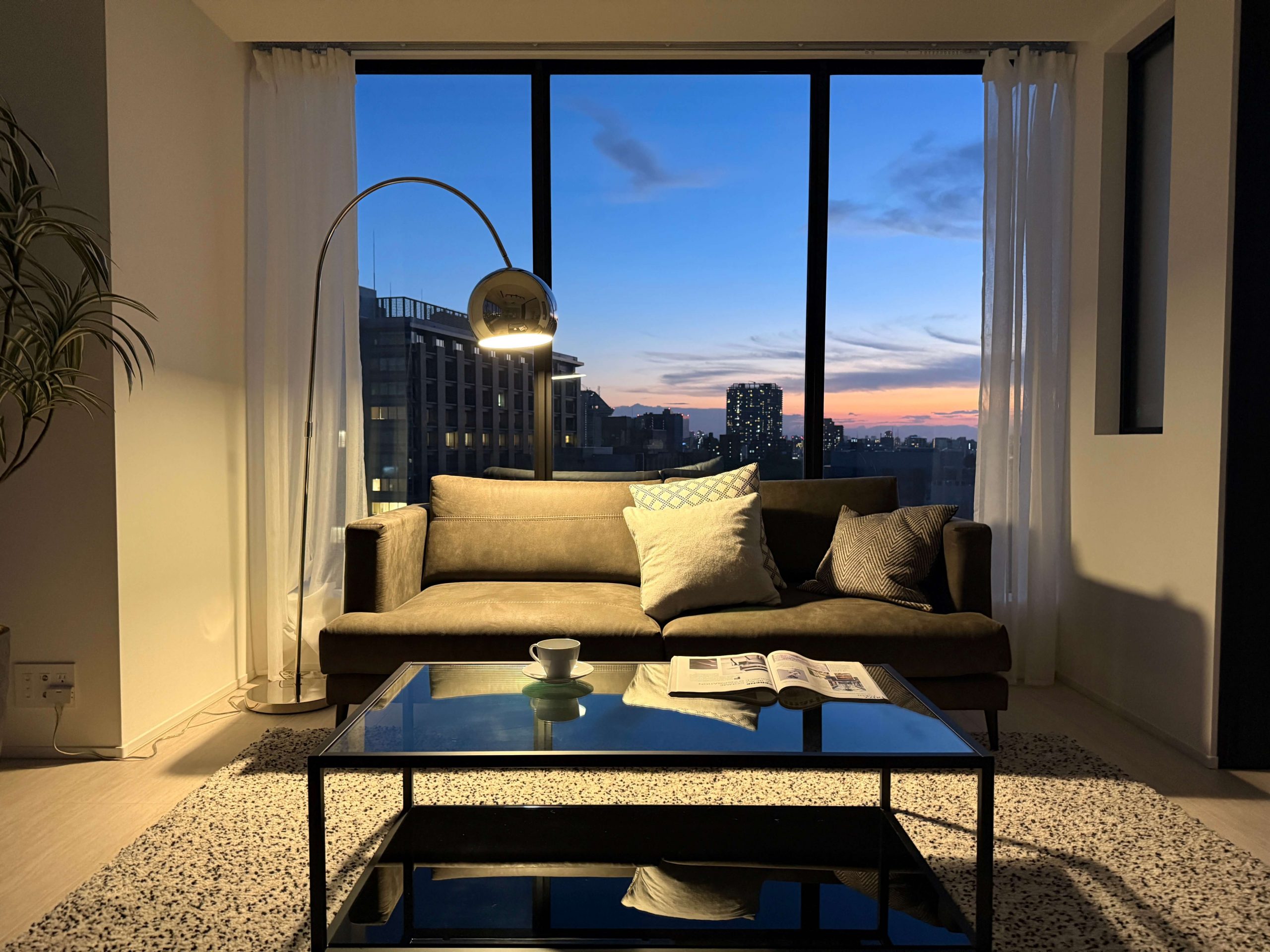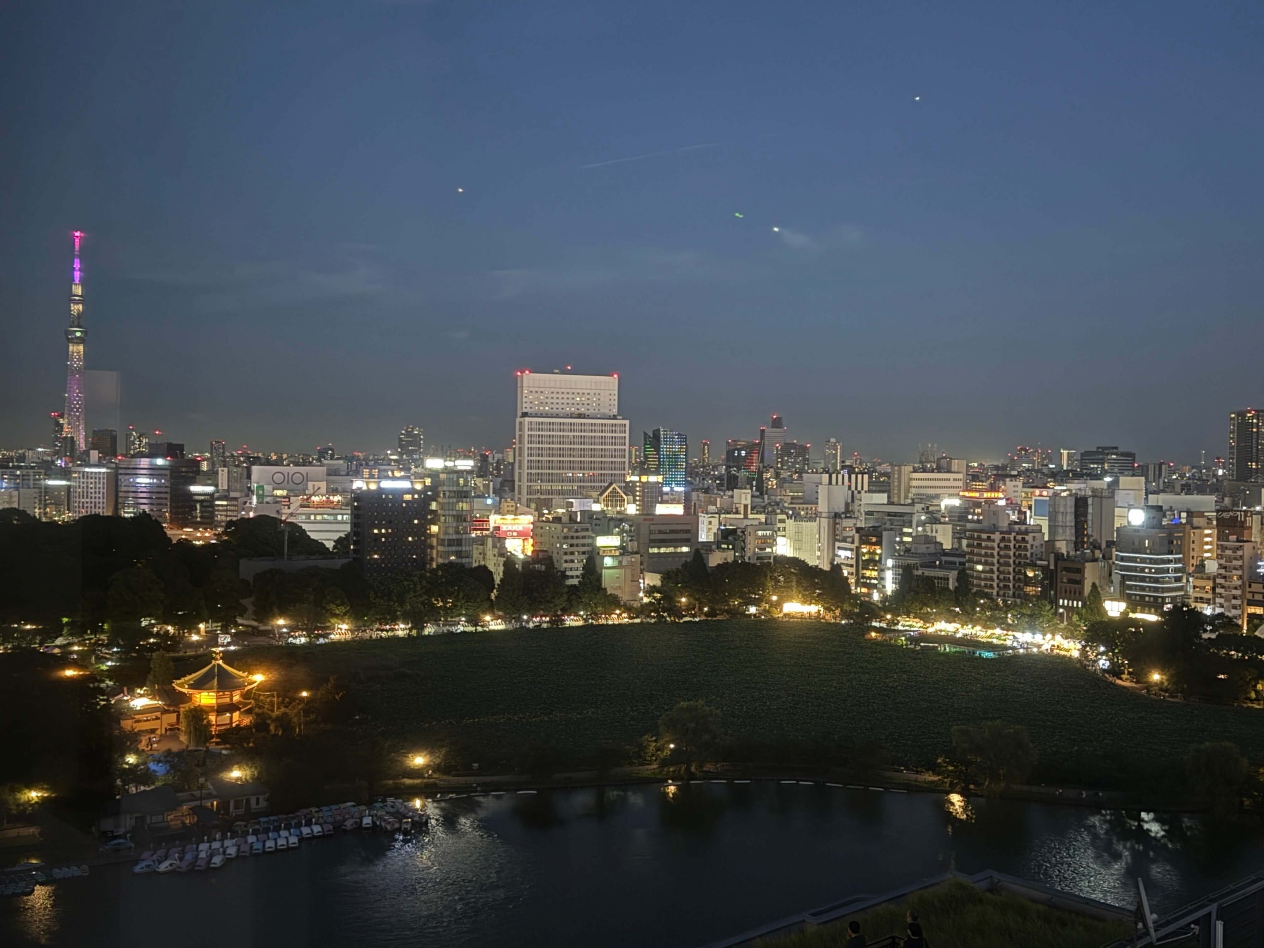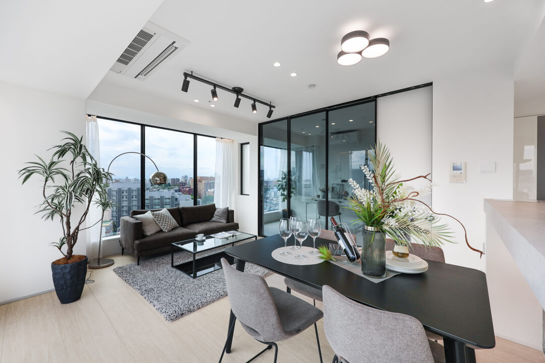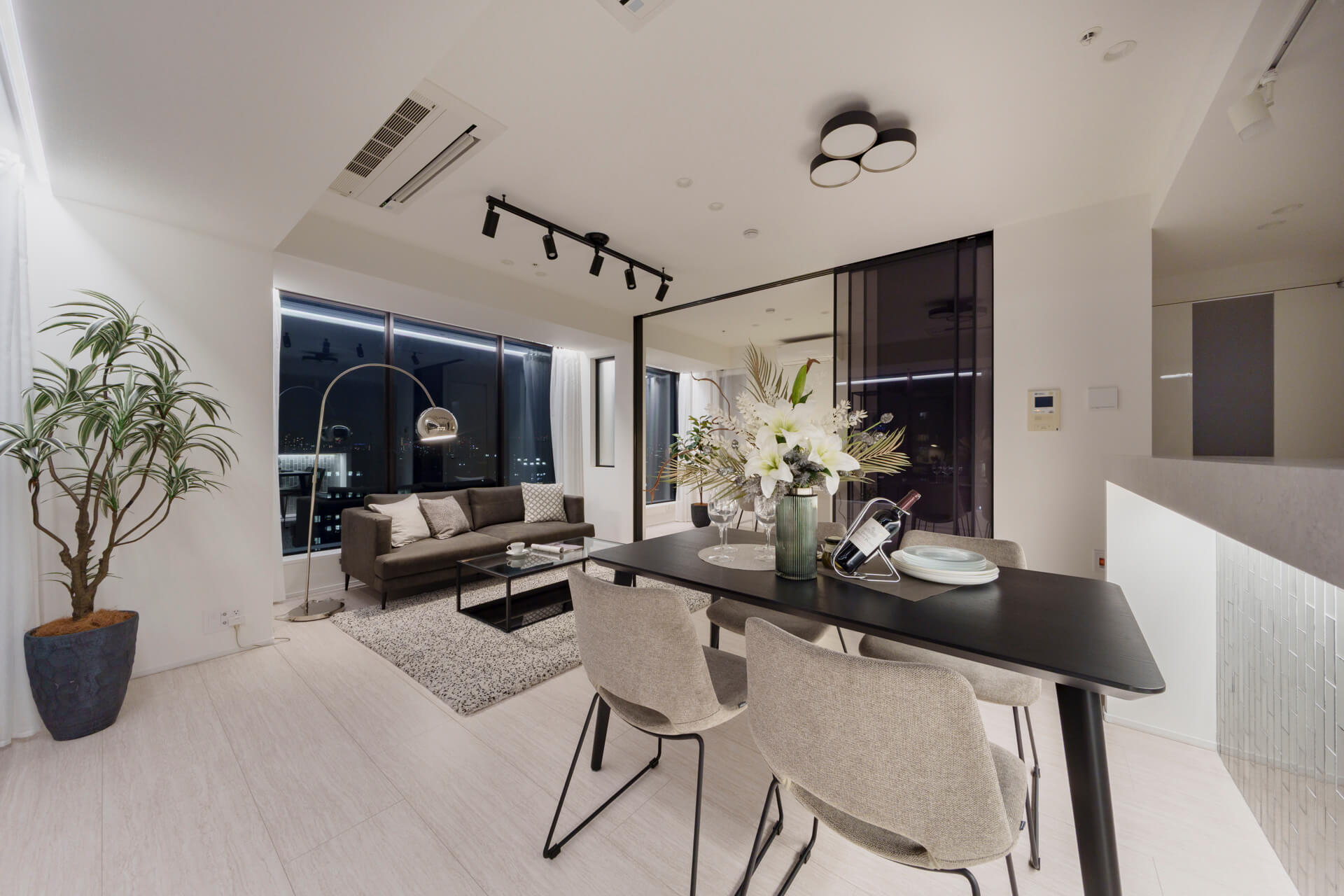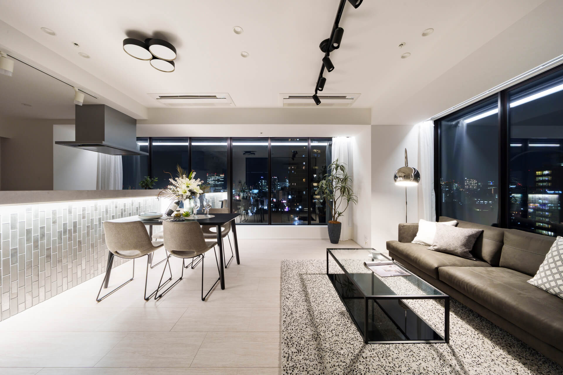 約17.6帖の広々としたリビングダイニングキッチンです。角部屋のため二面採光で日当たりが良好。窓からは開放的な眺望を堪能することができますよ。スカイツリーや不忍池、上野恩賜公園などが望め、夜景も楽しめます。