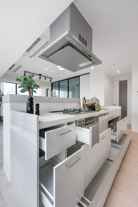 キッチンは存在感のあるアイランドキッチンです。リビングダイニングを見渡しながら料理することができるのでコミュニケーションもとりやすくなっています。さらに、両側から出入りすることができる動線になっているので使い勝手も良好です。