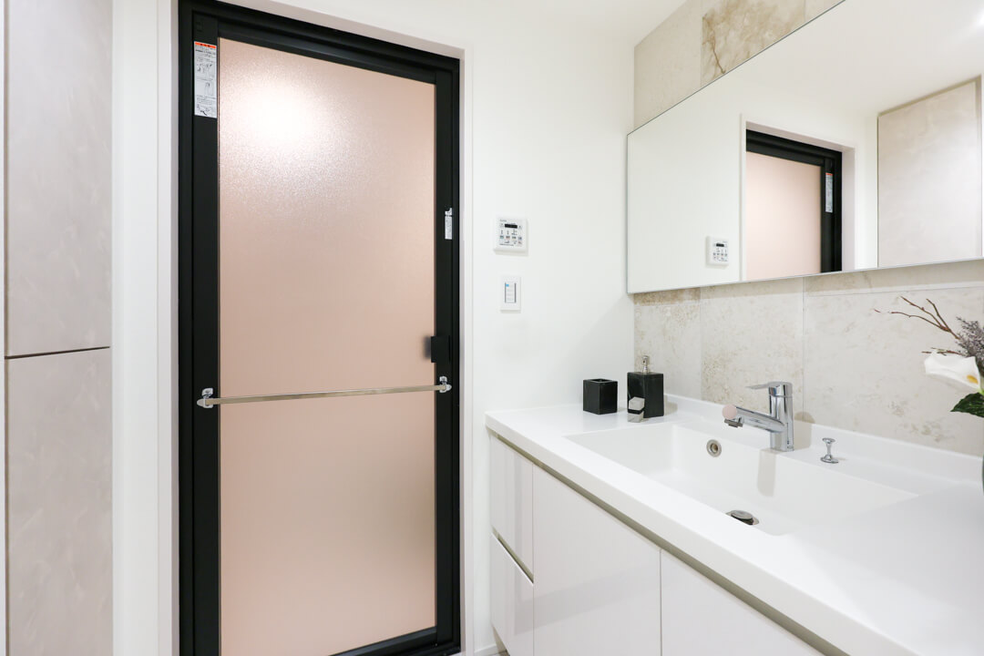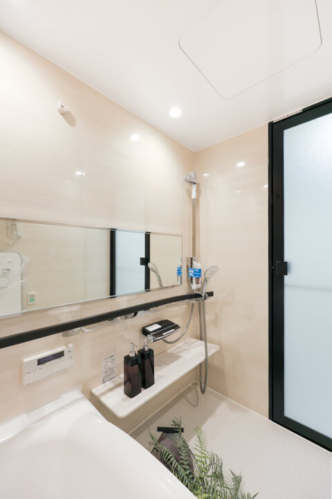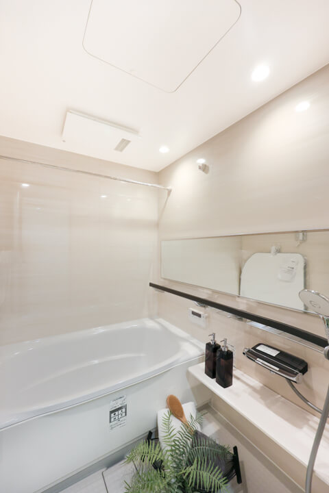 落ち着いた雰囲気が漂うバスルームです。お風呂にゆっくり浸かるのが好きという方に嬉しい追い焚き機能を搭載。家族の入浴時間がずれてしまっても安心です。また、浴室乾燥機には暖房・乾燥・換気・涼風の機能がついており、一年中快適に過ごすことができます。