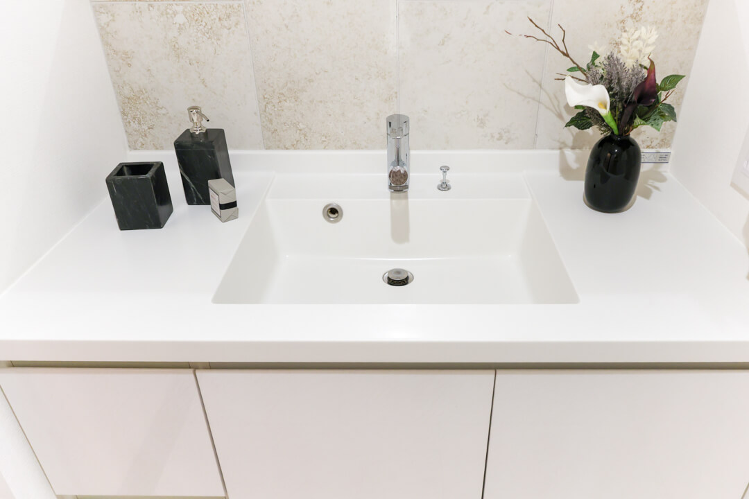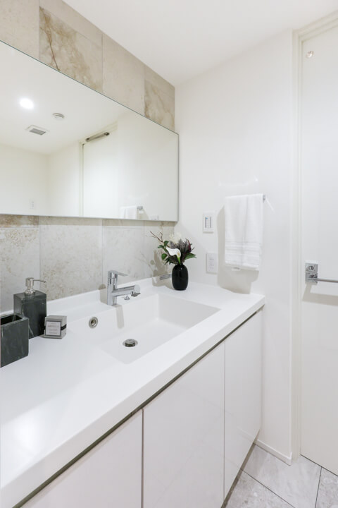 ストーン調の壁面が高級感を際立たせている洗面化粧台です。洗面ボウルとカウンターには継ぎ目がないので、お手入れが簡単。背面側には棚が造られているので、リネン類などを収納することができます。