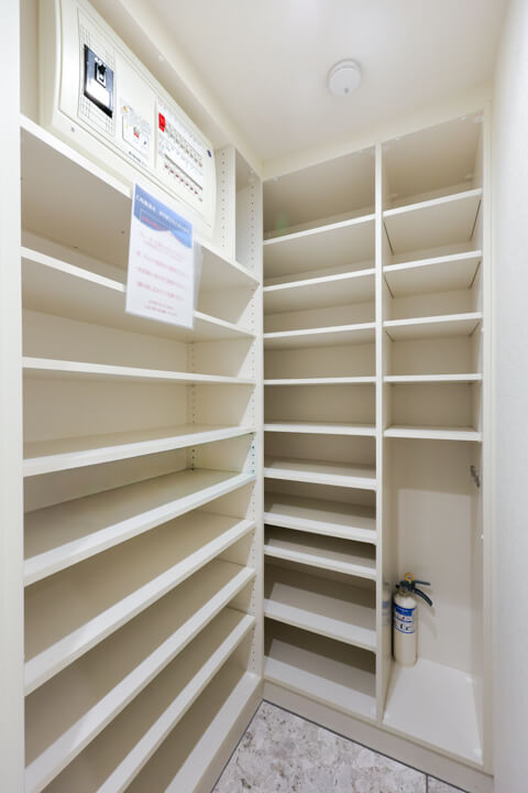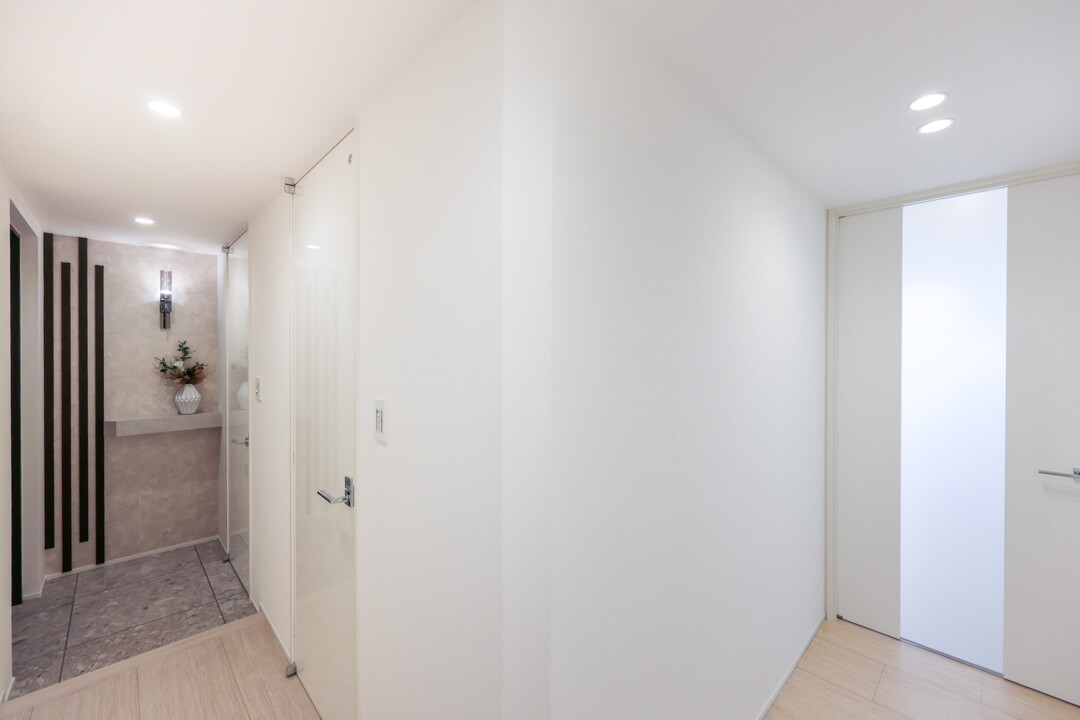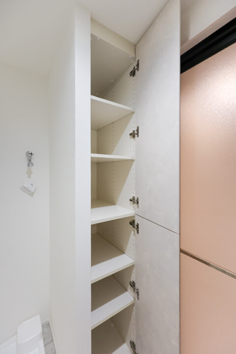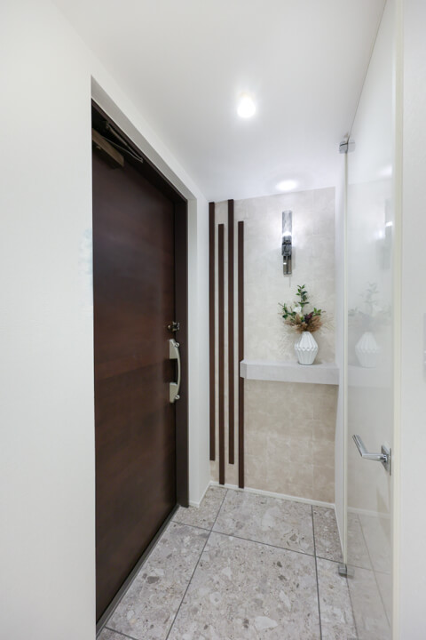 上品な印象の玄関にはシューズインクローゼットが造られています。中には可動棚が設置されていて、傘立てスペースもあるので使い勝手が良好です。