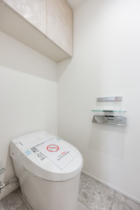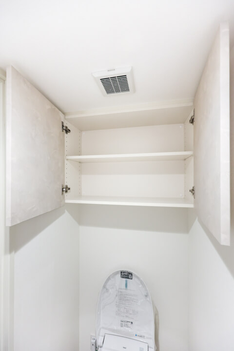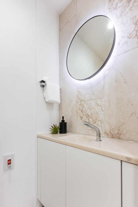 ウォシュレット一体型のトイレです。タンクレスタイプなのですっきりとした印象に。また、別途で手洗い器が造られているので、すぐに手を洗うことができて衛生的です。上部には吊戸棚が設置されていて、収納スペースもありますよ。丸型のミラーもおしゃれで◎。
