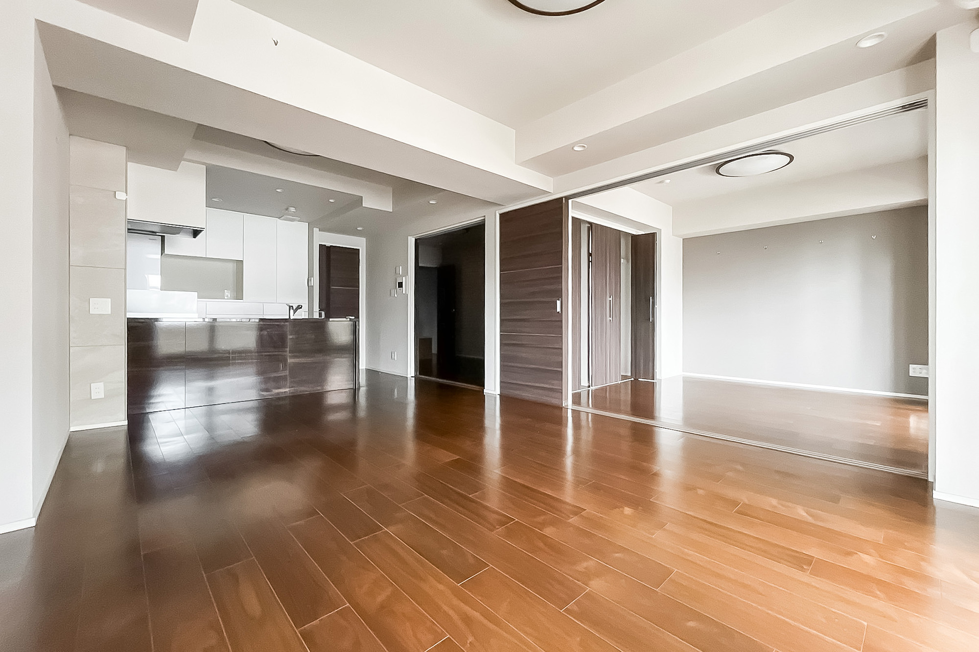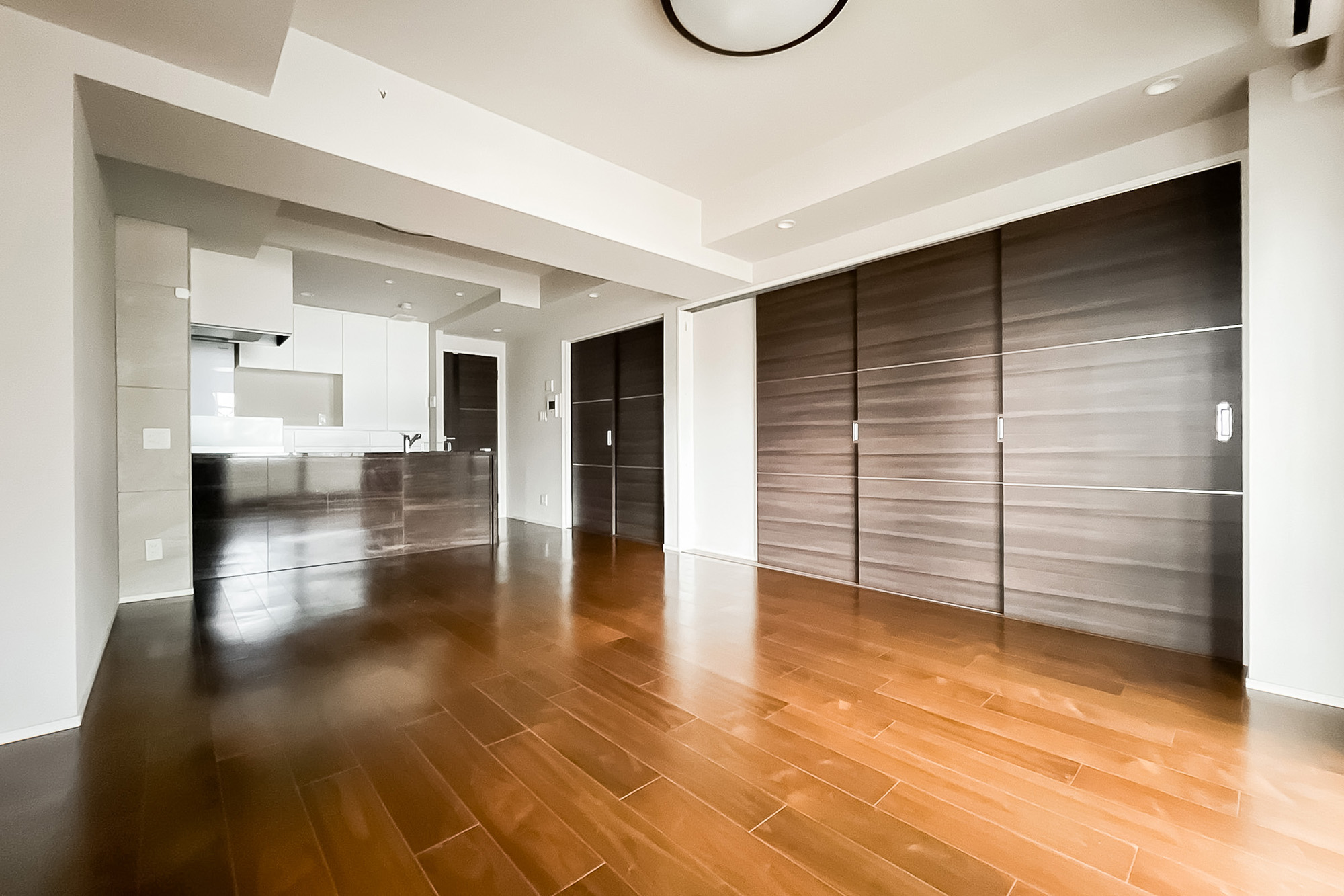 キッチンスペースを含め、約14.5帖のLDK。二面採光で開放的、南向きで陽当りも良好です。隣接している洋室と繋げて、より広々と過ごすことも可能。ライフスタイルに合わせて様々な使い方ができる便利な間取りです。