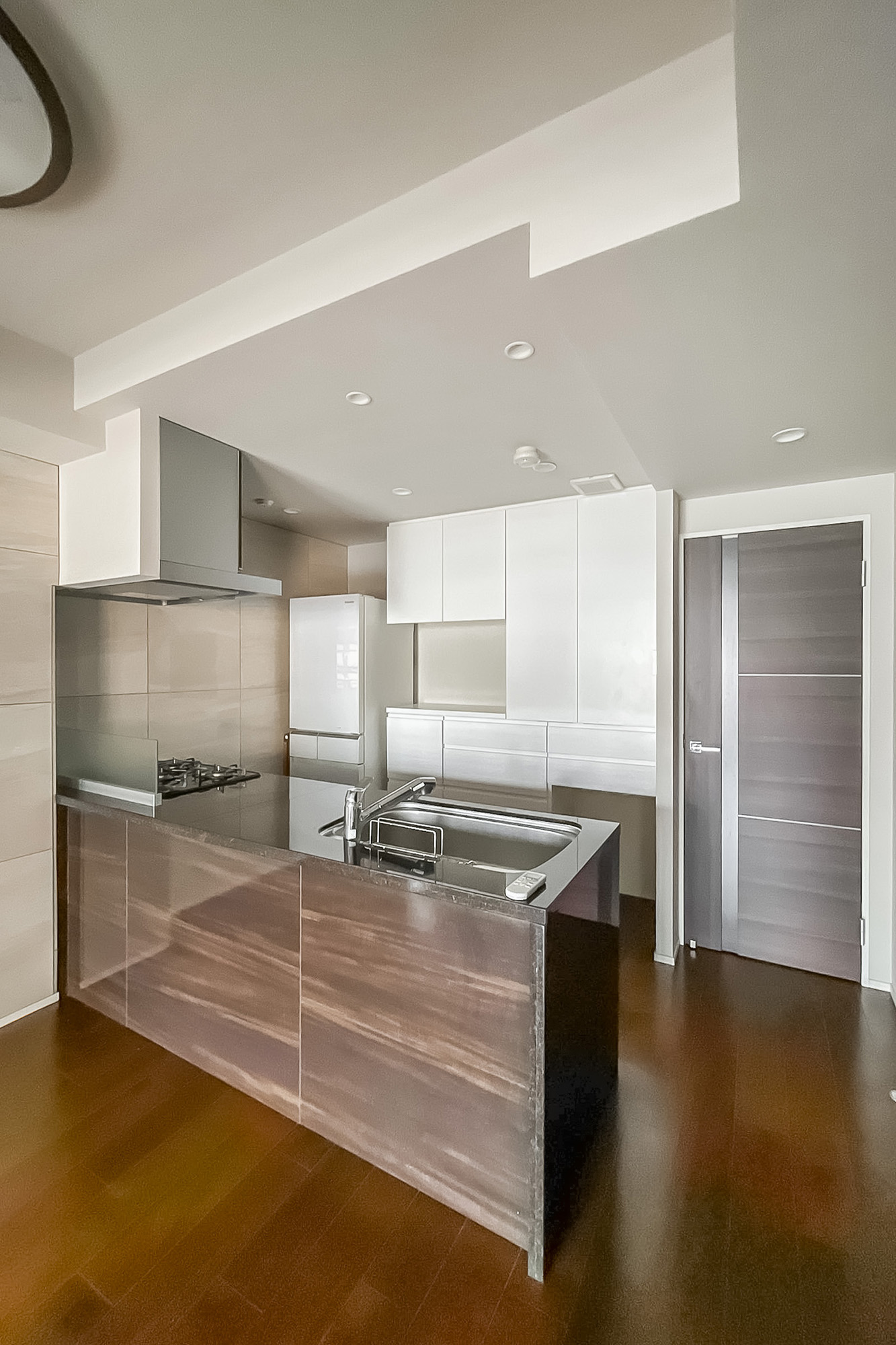 リビングダイニングを見渡せる開放的なオープンキッチン。家族やゲストとコミュニケーションが取りやすく、小さなお子さんがいるご家庭では子どもの姿も見守れます。