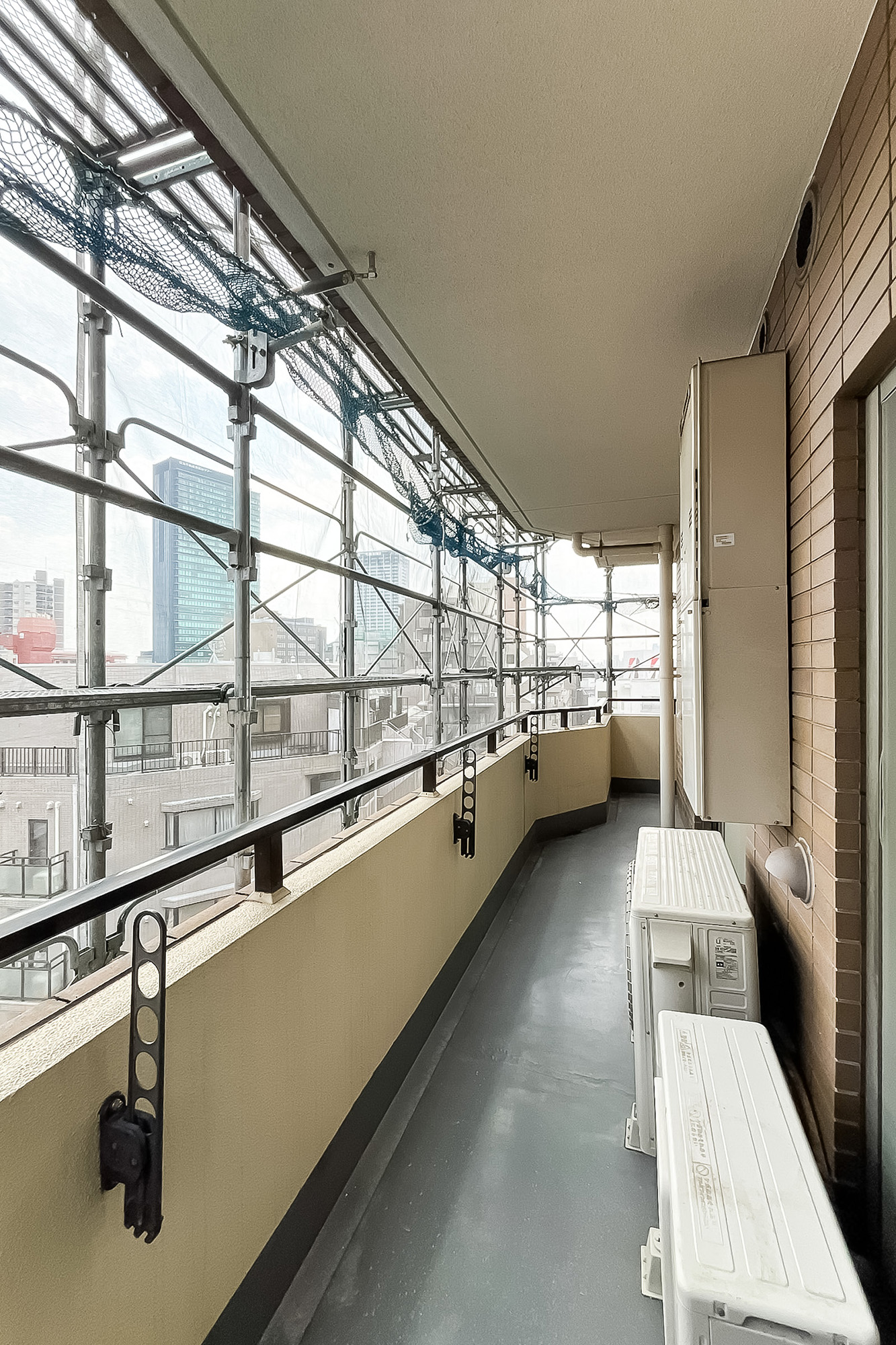 リビングダイニングと洋室に面したバルコニー。約11.76㎡ほどの広さです。南向きで陽当りも良好です。